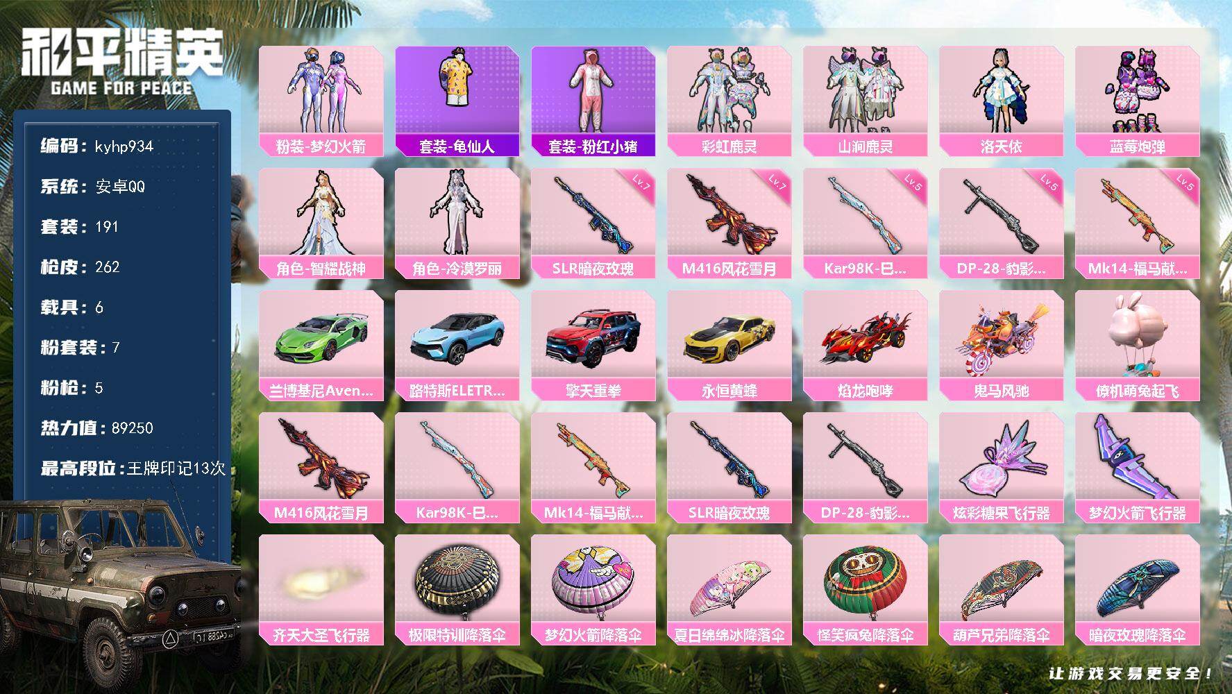 PX_2548835--7粉装-5特效枪-6载具-3粉色飞行器-89250热力值-13王牌印记-191套装-262枪皮 【热门品类】:粉装-梦幻火箭,套装-龟仙人,套装-粉红小猪 【粉色套装】:粉装-梦幻火箭,粉装-彩虹鹿灵,粉装-山涧鹿灵,角色-洛天依,粉装-蓝莓炮弹,角色-智耀战神,角色-冷漠罗丽 【粉色枪皮等级】:M416-风花雪月(七级),Kar98K-巳巳如意(五级),Mk14-福马献瑞(五级)