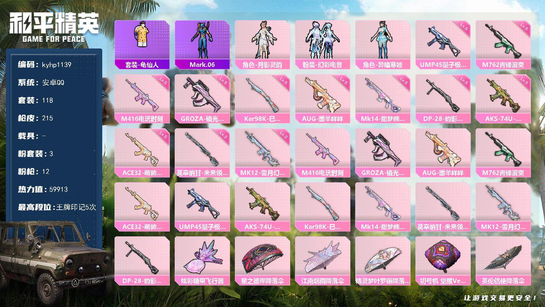 PX_2549441--3粉装-12特效枪-0载具-1粉色飞行器-59913热力值-5王牌印记-118套装-215枪皮 【热门品类】:套装-龟仙人,角色-Mark.06 【粉色套装】:角色-月影灵韵,粉装-幻彩电音,角色-异瞳寒姬 【粉色枪皮等级】:M416-电玩时刻(五级),GROZA-镜光银凌(五级),AUG-暖羊咩咩(五级),M762-青锋波束(五级),ACE32-萌骑漫游(五级),UMP45-量子