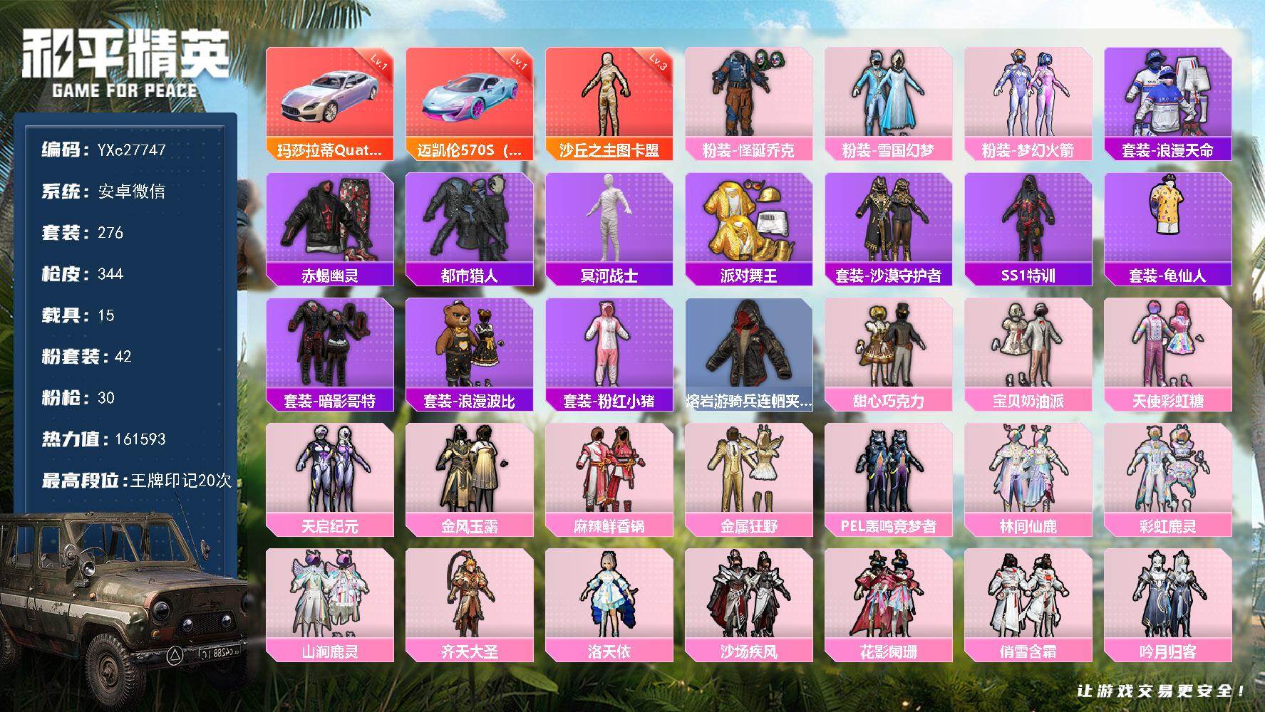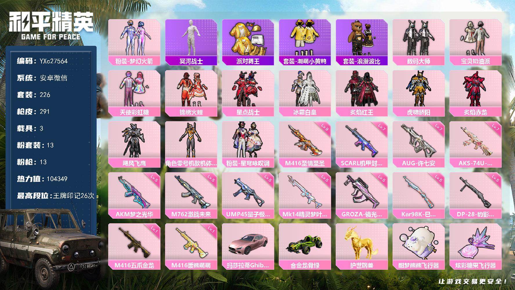 PX_2557238-??伊,金鞋,粉玛莎,黄螳螂,新101,满级至情至圣,粉熊包,满地铁天赋】YXc27564-【可二次】【因赛季更新游戏段付以上号为准!】 安卓V-3稀有3载具13粉装13特效枪16热门226套装291枪皮,10w热力值,26印记,历史传奇王牌18星, 【3稀有】,木乃伊,派对舞王,派对舞王(金靴子), 【3载具】,玛莎拉蒂粉色,合金龙骨绿色,护世瑞兽, 【13粉装】,黄螳螂,梦幻火箭,宝贝奶油派,天使彩虹糖,星穹咏叹调,数码大师,锦绣火鲤,星点战士,冰霜白皇,炙焰红王,虎啸骄阳,炙焰赤龙,飓风飞鹰, 【13特效枪】,M416-五爪金龙,(1级),AKS-74U-星穹咏叹调,(7级),Kar98K-巳巳如意,(5级),DP-28-豹影疾电,(5级),AUG-许七安,(7级),UMP45-量子极限,(5级),Mk14-精灵梦叶罗丽,(5级),GROZA-镜光银凌,(5级),M762-激战未来,(5级),M416-暖熊萌萌,(1级),M416-至情至圣,(9级),AKM-梦之光华,(5级),SCAR-L-机甲封神,(7级), 【16热门】,雪山精英,东方飞龙,潮萌小黄鸭,好奇恐龙,软萌银虎,迅捷狂鲨,浪漫波比,折纸暴龙,暗夜契约,纯白誓言,朱雀圣者,机械英豪,破蛋小黄鸡,黑色刀锋,AKM-奇异狩猎者,Kar98K-深海曼妙, 【2飞行器】,梦幻火箭飞行器,甜蜜誓约飞行器, 【6头盔】,梦幻火箭头盔,金曜白虎头盔,甜心宝贝头盔,深海小丑鱼头盔,甜蜜誓约头盔,心之恋语头盔, 【8背包】,梦幻火箭背包,折纸暴龙背包,金曜白虎背包,甜心宝贝背包,萌熊伴侣背包,深海曼妙背包,神秘黑猫背包,甜蜜誓约背包