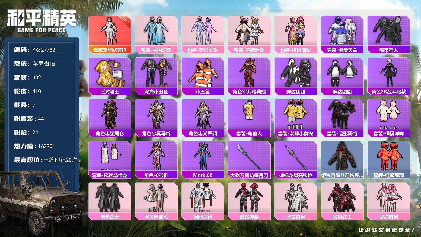 PX_2547597-??公主号!战神框,雪国,巧克力,猪妹,放客,童趣,小狐,满级心之恋语,兔兔,胖达,哥特,国宝头,粉熊包】YXc29089-【可二次】【因赛季更新游戏段付以上号为准!】 ,苹果Q-1稀有28粉装4特效枪18热门126套装132枪皮,11印记,历史无敌战神, 【1稀有】,浪漫天命, 【28粉装】,雪国幻梦,宝贝奶油派,天使彩虹糖,甜心巧克力,缤纷油彩,放客神游,筑梦精灵,闪耀律动,绚丽摇曳,极致幻想,苍蓝魅影,童趣迷兔,冰霜白皇,炙焰红王,暗翼战神,甜梦小狐,馨动时刻,蝶舞蔷薇,岚岚物语,海盐物语,焦糖拿铁,骨龙祭渊,山涧鹿灵,彩虹鹿灵,天之羽翼,红伞翩翩,黑伞漫漫,蓝莓炮弹, 【4特效枪】,M416-心之恋语,(7级),AKM-梦之光华,(4级),Vector-红伞翩翩,(2级),GROZA-焦糖拿铁,(5级), 【18热门】,萌神柯基,动感兔斯基,软萌银虎,兔兔白日梦,奶芙汪汪,恶魔喵喵,激萌罗小黑,胖达圆圆,胖达团团,暗影哥特,团圆交子,瑞龙福将,粉红小猪,萌熊伴侣,狂沙舞者,M762-瑞龙福将,Mini14-林间仙鹿,GROZA-林间仙鹿, 【1飞行器】,天之羽翼飞行器, 【4头盔】,国宝胖达头盔,童趣迷兔头盔,雪国精灵头盔,甜心宝贝头盔, 【3背包】,雪国精灵背包,甜心宝贝背包,萌熊伴侣背包,