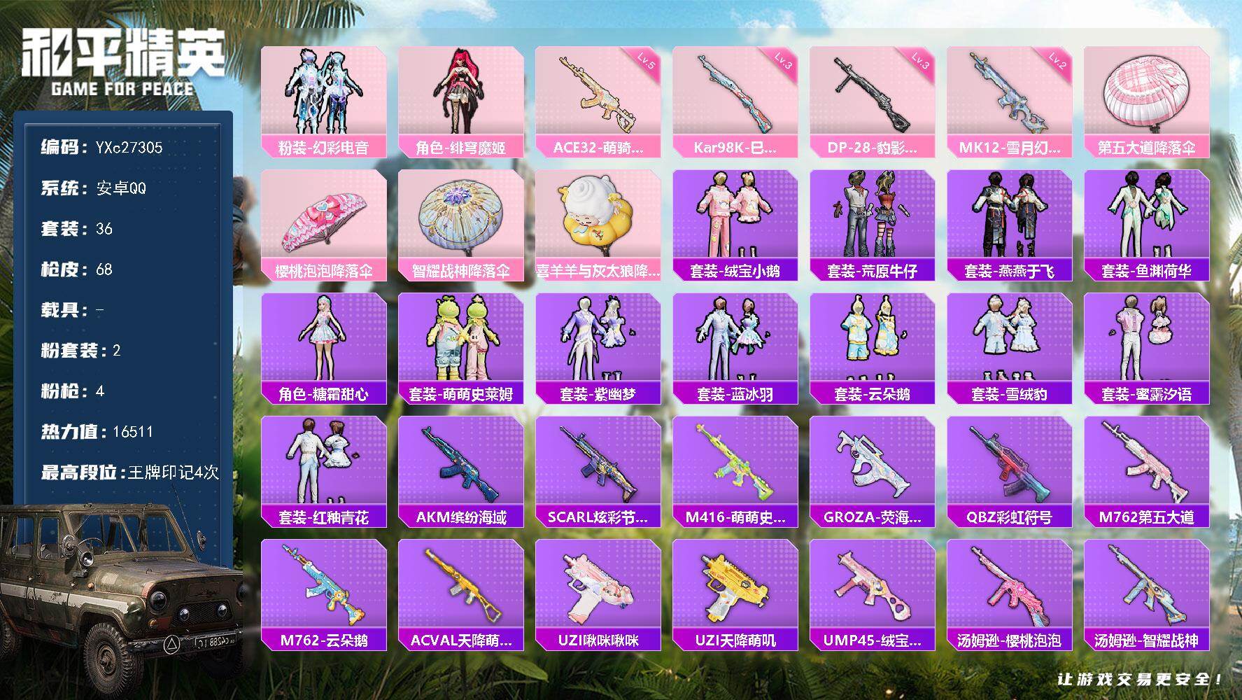 PX_2557238-??伊,金鞋,粉玛莎,黄螳螂,新101,满级至情至圣,粉熊包,满地铁天赋】YXc27564-【可二次】【因赛季更新游戏段付以上号为准!】 安卓V-3稀有3载具13粉装13特效枪16热门226套装291枪皮,10w热力值,26印记,历史传奇王牌18星, 【3稀有】,木乃伊,派对舞王,派对舞王(金靴子), 【3载具】,玛莎拉蒂粉色,合金龙骨绿色,护世瑞兽, 【13粉装】,黄螳螂,梦幻火箭,宝贝奶油派,天使彩虹糖,星穹咏叹调,数码大师,锦绣火鲤,星点战士,冰霜白皇,炙焰红王,虎啸骄阳,炙焰赤龙,飓风飞鹰, 【13特效枪】,M416-五爪金龙,(1级),AKS-74U-星穹咏叹调,(7级),Kar98K-巳巳如意,(5级),DP-28-豹影疾电,(5级),AUG-许七安,(7级),UMP45-量子极限,(5级),Mk14-精灵梦叶罗丽,(5级),GROZA-镜光银凌,(5级),M762-激战未来,(5级),M416-暖熊萌萌,(1级),M416-至情至圣,(9级),AKM-梦之光华,(5级),SCAR-L-机甲封神,(7级), 【16热门】,雪山精英,东方飞龙,潮萌小黄鸭,好奇恐龙,软萌银虎,迅捷狂鲨,浪漫波比,折纸暴龙,暗夜契约,纯白誓言,朱雀圣者,机械英豪,破蛋小黄鸡,黑色刀锋,AKM-奇异狩猎者,Kar98K-深海曼妙, 【2飞行器】,梦幻火箭飞行器,甜蜜誓约飞行器, 【6头盔】,梦幻火箭头盔,金曜白虎头盔,甜心宝贝头盔,深海小丑鱼头盔,甜蜜誓约头盔,心之恋语头盔, 【8背包】,梦幻火箭背包,折纸暴龙背包,金曜白虎背包,甜心宝贝背包,萌熊伴侣背包,深海曼妙背包,神秘黑猫背包,甜蜜誓约背包