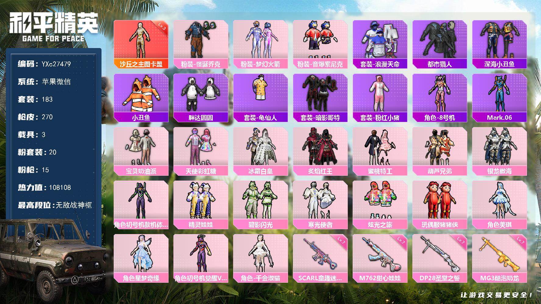 PX_2557197-??素材号!战神框,3级图卡盟,都市,紫螳螂,怪诞,3级AUG星梦,7级至情至圣,胖达,哥特,粉熊包】YXc27479-【无二次】【因赛季更新游戏段付以上号为准!】 ,苹果V-1红装2稀有4载具20粉装16特效枪22热门183套装270枪皮,,21印记,历史无敌战神, 【1红装】,沙丘之主-图卡盟,(3级), 【2稀有】,都市猎人,浪漫天命, 【4载具】,兰博轿车尊享铂,合金龙骨蓝色,星梦玉骢,萌酷奶龙僚机, 【20粉装】,觉醒初号机,紫螳螂,梦幻火箭,美琪,猪猪侠,宝贝奶油派,天使彩虹糖,千金淑猫,炫光之旅,怪诞乔克,星梦奇缘,精灵娃娃,冰霜白皇,炙焰红王,音爆索尼克,蜜桃特工,葫芦兄弟,银龙傲海,寒光使者,碧影闪光, 【16特效枪】,M416-墨龙九天,(1级),M416-电玩时刻,(5级),P90-沙丘之主,(3级),AKS-74U-森灵之息,(5级),Kar98K-巳巳如意,(5级),MG3-酷泡奶龙,(7级),AUG-星梦奇缘,(3级),M762-甜心娃娃,(7级),GROZA-巴啦啦小魔仙,(6级),SCAR-L-童趣迷兔,(7级),DP-28-圣堂之誓,(7级),M416-至情至圣,(7级)Mk14-福马献瑞,(5级),ACE32-萌骑漫游,(4级),UMP45-恐龙拽拽,(5级), 【22热门】,8号机,Mark.06,小丑鱼,龟仙人,鹰眼刺客,奶芙汪汪,迅捷狂鲨,深海小丑鱼,胖达圆圆,怪笑疯兔,暗影哥特,团圆交子,瑞龙福将,粉红小猪,豚鼠丹丹,狂沙舞者,漫步者,破蛋小黄鸡,弄潮海豚,AKM-奇异狩猎者,M762-瑞龙福将,AUG-魔法学院, 【2飞行器】,梦幻火箭飞行器,太空嘟嘟飞行器, 【4头盔】,童趣迷兔头盔,梦幻火箭头盔,深海小丑鱼头盔,夏日绵绵冰头盔, 【2背包】,梦幻火箭背包,萌熊伴侣背包,