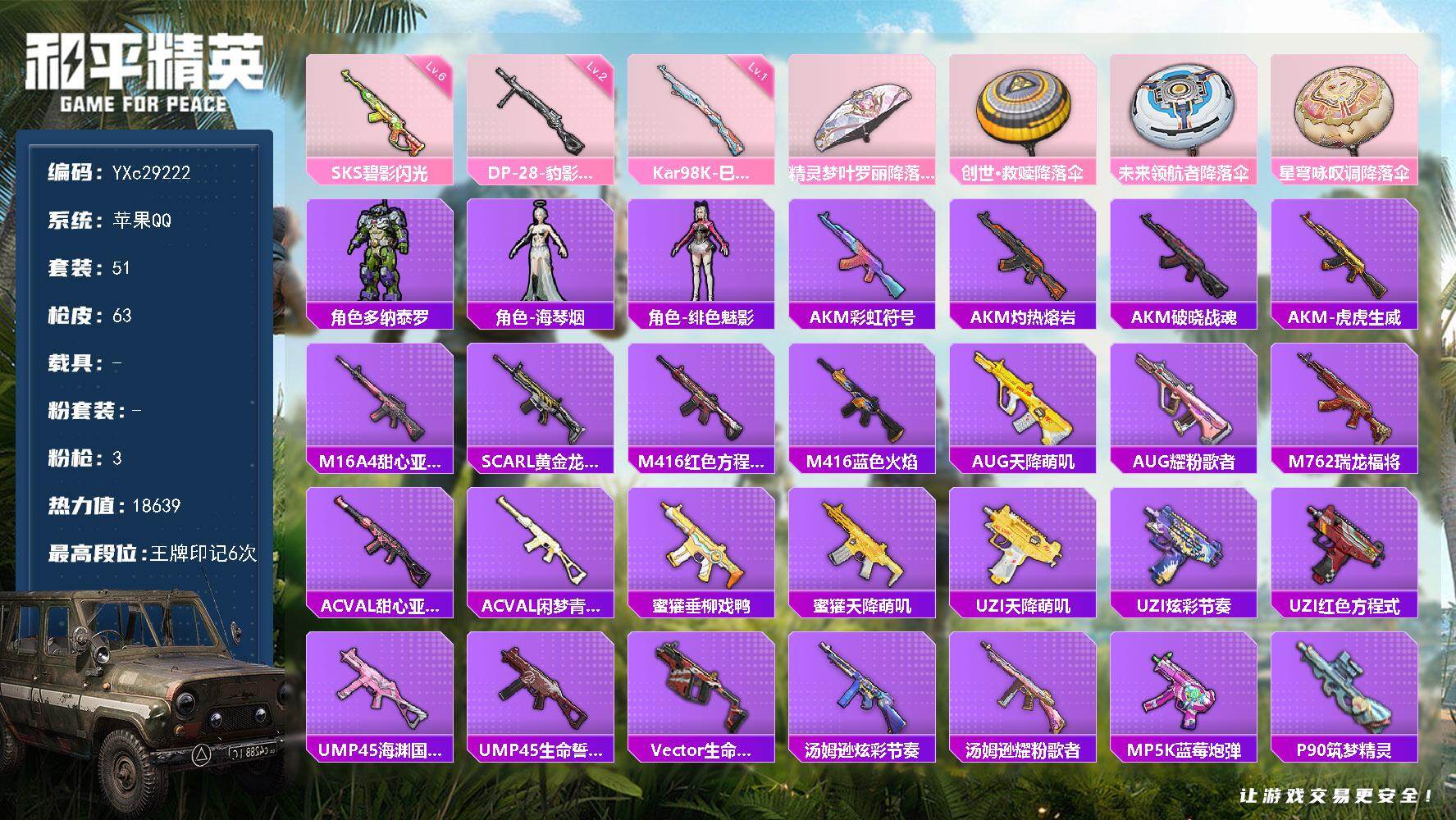 PX_2557488-可二次【1载具2粉装2特效枪,秒换绑不用等】,安卓Q区-30597热力值-93套装-93枪皮,【1载具】,玛莎拉蒂Quattroporte(夜幕蓝)【2粉装】,角色-异瞳寒姬,角色-荧海星豚【2特效枪】,Kar98K-巳巳如意(5级),DP-28-豹影疾电(5级)【86热门】,极速红龙,团圆交子,瑞龙福将,白色伏地魔,SS24特训,SS23特训,SS22特训,M762-暖熊萌萌,SCAR-L-玉兔迎春,M762-天降萌叽,Mk47-乌木金纹,UZI-娇憨猪猪,UMP45-蓝色火焰,MG3-幻世战舞者,AKM-虎虎生威,M416-蓝色火焰,M762-第五大道,破蛋小黄鸡,长空猛禽,虚音幻奏,甜心亚梦,甜蜜熊情侣,特训学院,青年教官,骑行爱好者,牛气冲天,霓虹街区,魅力单车,猎鹰,蓝色运动,橘黑制服,竞技达人朋克,活力之心,黄色运动,漫步者,黄色伏地魔,红色运动,黑色伏地魔,M24-奇异狩猎者,M762-瑞龙福将,顶瓜瓜,SS34特训,星渊小夜曲,SS18特训,SS14特训,SS16特训,SS17特训,SS19特训,SS20特训,SS21特训,海盐绵绵冰,SS31特训,SS33特训,SS32特训,巳巳如意,智谋强哥,战术大师,狙击之神,平底锅-许七安,Kar98K-彩虹符号,撬棍-幻世战舞者,Mini14-炫彩节奏,AUG-紫晶流影,平底锅-瑞龙福将,AMR-鸡智如我,MG3-乌木金纹,平底锅-飞驰魅影,Mini14-香桃花海,破片手榴弹-巳巳如意,平底锅-甜心亚梦,平底锅-娇憨猪猪,烟雾弹-冰氧夏日,平底锅-属我最6,SS35特训,薄荷星砂,蝶变,AUG-异域银装,Famas-霓彩脉冲,平底锅-空岛之星,SPAS-12-狂鲨锋刃,P90-巳巳如意,S686-巳巳如意,SCAR-L-海盐豹豹,云魄琉璃,水银刺客,破片手榴弹-呆爆全场【1飞行器】,太空嘟嘟飞行器【11背包】,彩虹嘻嘻猴背包(3级),瑞龙福将背包(3级),智谋强哥背包(3级),娇憨猪猪背包(3级),暗夜鎏金背包(3级),飞驰魅影背包(3级),甜心亚梦背包(3级),垂柳戏鸭背包(3级),狂鲨锋刃背包(3级),炫蓝之夏背包(3级),玉兔迎春背包(3级),营地ID:772568964,