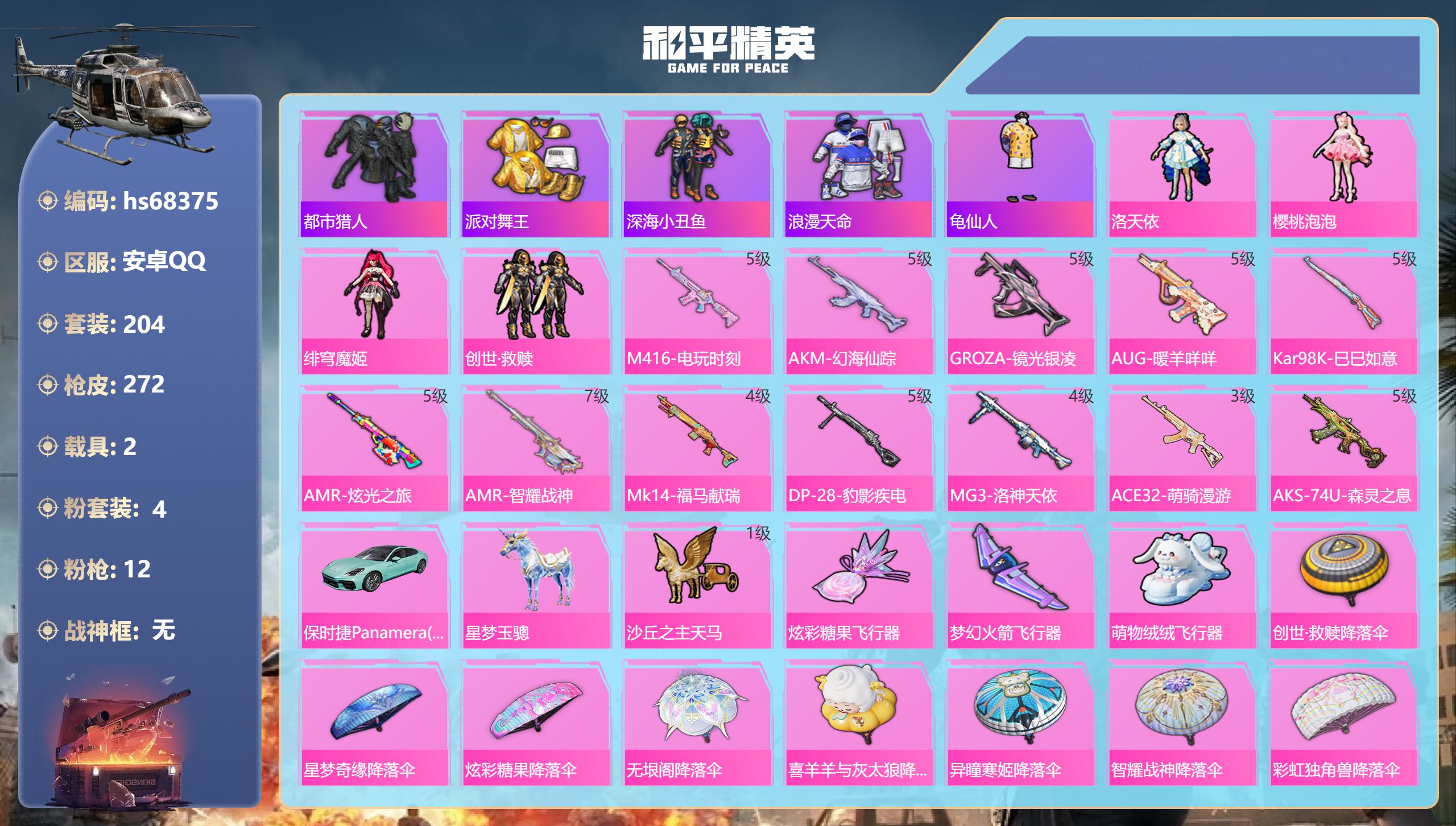 PX_2552841-,安卓手Q-15王牌印记-4粉装-12特效枪-2载具-83512热力值-204套装-272枪皮-4卓越印记-3传奇印记 【4粉装】角色-绯穹魔姬,套装-创世·救赎,角色-樱桃泡泡,角色-洛天依 【12特效枪】AKS-74U-森灵之息/5级,DP-28-豹影疾电/5级,ACE32-萌骑漫游/3级,Kar98K-巳巳如意/5级,AMR-炫光之旅/5级,AKM-幻海仙踪/5级,GROZA-镜光银凌/5级,Mk14-福马献瑞/4级,M416-电玩时刻/5级,AUG-暖羊咩咩/5级,MG3-洛神天依/4级,AMR-智耀战神/7级 【5稀有紫装】都市猎人,派对舞王,深海小丑鱼,浪漫天命,龟仙人 【2稀有载具】保时捷Panamera(梦幻青),星梦玉骢 【203稀有时装】洛天依,樱桃泡泡,绯穹魔姬,创世·幻影,创世·救赎,迅捷龙虾,SS38特训,都市猎人,浪漫天命,龟仙人,深海小丑鱼,派对舞王,申公豹,粉雾星云,萌趣咩咩,异域银装,纯白跃动,白糯汤圆,街头风暴,糖霜甜心,鱼渊荷华,俏兔智灵,大橘大利,燕燕于飞,战术大师,紫俏灵猫,马上有钱,晶辉守护,香桃花海,蝶变,瑰梦爱神,巳巳如意,粉恋花,湖畔霞光,极地流光,元素星魂,午间小调,彩虹兔,琴音绮想,极速光影,雪绒豹,玄霖雨神,画境星梦,朱霞炽焰,狂鲨锋刃,阳光菠萝,游乐,凌霄紫焰,粉黛兰香,云魄琉璃,擎苍青焰,炫彩糖果,萌鸡速递,元气之梦,书海巡游,风迹短诗,蜜露汐语,薄荷星砂,秘语星愿,云朵鹅,顶瓜瓜,雪国风尚,蓝冰羽,恋语绒绒,青翼流星,紫幽梦,SS35特训,SS29特训,SS31特训,SS33特训,SS32特训,SS36特训,湖雨初晴,福星高照,雪兔飞飞,都市漫游者,虎虎生威吉莉,夏日音浪,龙的传人,潮流炫酷,白熊同盟,SS37特训,SS28特训,特训学院,猎鹰,青年教官,橘黑制服,红色运动,黄色运动,蓝色运动,极速竞梦,黄色伏地魔,飞驰魅影,白色伏地魔,音速流光,热血青春,酒红色名流,湖蓝色名流,黄色名流,酷潮明星,顽皮玉兔,绯格组合,SS26特训,酷萌兔限定,漫步者,空岛之星,热情海星,黑色伏地魔,黎明保卫者,炫蓝之夏,纯真浪花,SS34特训,骑行爱好者,竞技名士,蓝色守护者,深蓝色名流,猛禽,SS30特训,长空猛禽,特战装甲,旭日情侣,街头潮人,怒火燎原,冷焰舞者,惊鸿侠骨,魅力单车,灼焰舞者,水银刺客,猎梦纪元,甜心亚梦,虚音幻奏,幻世战舞者,战地督导,青涩时光,牛气满满,娇憨猪猪,冰川特警,极速红龙,狙击之神,沙漠毒蛇,红釉青花,鹰眼刺客,雨过天青,福马献瑞,冰冻风暴,冷酷挑战者,完美偶像,人气偶像,幻影武者,破蛋小黄鸡,潮流游乐家,摇滚舞王,蓝彩潮人,绮丽涂鸦,耀眼新星,竞技达人朋克,淡雅花蕊,野性战心,海岛探路者,破晓战魂,霓虹街区,森林游猎者,田园牧歌,都市魅力,轻风白浪,耀粉歌者,探宝勇士,SS12特训,SS27特训,牛气冲天,SS18特训,飞行日记,SS17特训,竞技角斗士,瑞龙福将,团圆交子,异彩先驱,霓虹极客,空投萌叽,SS19特训,光之冒险,SS20特训,SS21特训,玉兔迎春,深海梦境,SS22特训,SS23特训,夏日倾情,甜蜜熊情侣,缤纷果语,莱茵河畔,SS14特训,天籁歌者,电音精灵,海盐绵绵冰,老实芭蕉,王牌教练,柠萌假日,粉红小猪,SS24特训,鹤鸣,SS25特训,锦衣飞扬 【271稀有枪械】M416-电玩时刻/5级,AKM-幻海仙踪/5级,GROZA-镜光银凌/5级,AUG-暖羊咩咩/5级,Kar98K-巳巳如意/5级,AMR-炫光之旅/5级,AMR-智耀战神/7级,Mk14-福马献瑞/4级,DP-28-豹影疾电/5级,MG3-洛神天依/4级,ACE32-萌骑漫游/3级,AKS-74U-森灵之息/5级,QBZ-纯真浪花,AWM-纯真浪花,汤姆逊-纯真浪花,DBS-乌木金纹,AA12-G-纯真浪花,平底锅-纯真浪花,P1911-创世·救赎,Famas-墨龙九天,AMR-墨龙九天,DBS-创世·救赎,汤姆逊-星梦奇缘,MK20-H-星梦奇缘,SCAR-L-海盐豹豹,GROZA-海盐豹豹,SLR-金丰海韵,Mk14-冰河战士,UZI-冰河战士,M16A4-冰河战士,MK20-H-乌木金纹,短管霰弹-圣域龙灵,DBS-风迹短诗,莫辛纳甘-风迹短诗,Mini14-鸡智如我,AKM-绿洲时空,Win94-乌木金纹,MK12-风迹短诗,MK12-乌木金纹,SVD-冷漠罗丽,破片手榴弹-爆破雪人,S12K-极意拳锋,PKM-紫幽梦,MG3-霓彩脉冲,ACE32-画境星梦,M1加兰德-画境星梦,MP5K-画境星梦,M762-登顶巅峰,Mk14-紫幽梦,蜜獾-乌木金纹,M762-云朵鹅,S1897-紫幽梦,SVD-云朵鹅,P92-紫幽梦,SPAS-12-狂鲨锋刃,M417-玩趣呆呆,MK20-H-狂鲨锋刃,AUG-冰晶雪宝,铝热弹-炫彩糖果,UZI-炫彩糖果,ARX-像素花束,大砍刀-像素花束,AA12-G-画境星梦,平底锅-画境星梦,M249-冰晶雪宝,Mk47-风迹短诗,JS9-凌霄紫焰,MG-36-凌霄紫焰,平底锅-紫幽梦,UMP45-海盐豹豹,ARX-凌霄紫焰,AKS-74U-乌木金纹,AKM-涂鸦街区,蜜獾-风迹短诗,P92-凌霄紫焰,AMR-喜羊羊与灰太狼,Famas-乌木金纹,Famas-霓彩脉冲,SPAS-12-云朵鹅,破片手榴弹-拽到爆炸,十字弩-异瞳寒姬,S1897-糯团青竹,信号枪-异瞳寒姬,平底锅-凌霄紫焰,Mk14-薄荷星砂,AKS-74U-鸡智如我,汤姆逊-智耀战神,S12K-智耀战神,沙漠之鹰-云朵鹅,烟雾弹-冰氧夏日,MG3-智耀战神,Mk14-紫晶流影,MG-36-薄荷星砂,大砍刀-云朵鹅,PKM-啾咪啾咪,SVD-霓彩脉冲,SLR-霓彩脉冲,平底锅-属我最6,SCAR-L-彩虹符号,AUG-紫晶流影,S12K-霓彩脉冲,M416-魔童闹海,敖闰,AMR-鸡智如我,AKM-霓彩脉冲,M416-红色方程式,M416-蓝色火焰,M416-糯团青竹,AKM-影袭,AKM-彩虹符号,AKM-海渊国主,AKM-破晓战魂,AKM-龙的传人,AKM-灼热熔岩,SCAR-L-红色方程式,SCAR-L-玉兔迎春,SCAR-L-炫彩节奏,M16A4-幻世战舞者,M16A4-甜心亚梦,GROZA-春暖花开,GROZA-异彩先驱,GROZA-影袭,GROZA-田园牧歌,GROZA-彩虹符号,AUG-耀粉歌者,AUG-甜蜜菠萝,QBZ-飞驰魅影,QBZ-洛神天依,QBZ-彩虹符号,M762-瑞龙福将,M762-牛气冲天,M762-天降萌叽,M762-萌物绒绒,Mk47-乌木金纹,Mk47-炫光之旅,Mk47-洛神天依,G36C-乌木金纹,AC-VAL-甜心亚梦,AC-VAL-乌木金纹,蜜獾-天