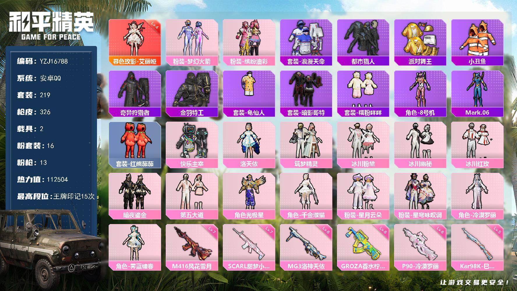 PX_2558743-??力,哥特,粉熊包】YXc29635-【无二次协助处理】【因赛季更新游戏段付以上号为准!】 安卓Q-1稀有1载具7粉装6特效枪8热门151套装211枪皮,,7印记,历史超级王牌12星, 【1稀有】,浪漫天命, 【1载具】,拉轰奶龙龙, 【7粉装】,天使彩虹糖,甜心巧克力,洛天依,未来歌姬,冷漠罗丽,羊梦糖心,歌者泠鸢, 【6特效枪】,M416-电玩时刻,(5级),AKS-74U-星穹咏叹调,(7级),Kar98K-巳巳如意,(5级),DP-28-豹影疾电,(5级),汤姆逊-热量炸弹,(5级),MG3-洛神天依,(7级), 【8热门】,龟仙人,雪山精英,鹰眼刺客,AG战队服,暗影哥特,漫步者,破蛋小黄鸡,黑色刀锋, 【2背包】,精灵迷巫背包,萌熊伴侣背包,