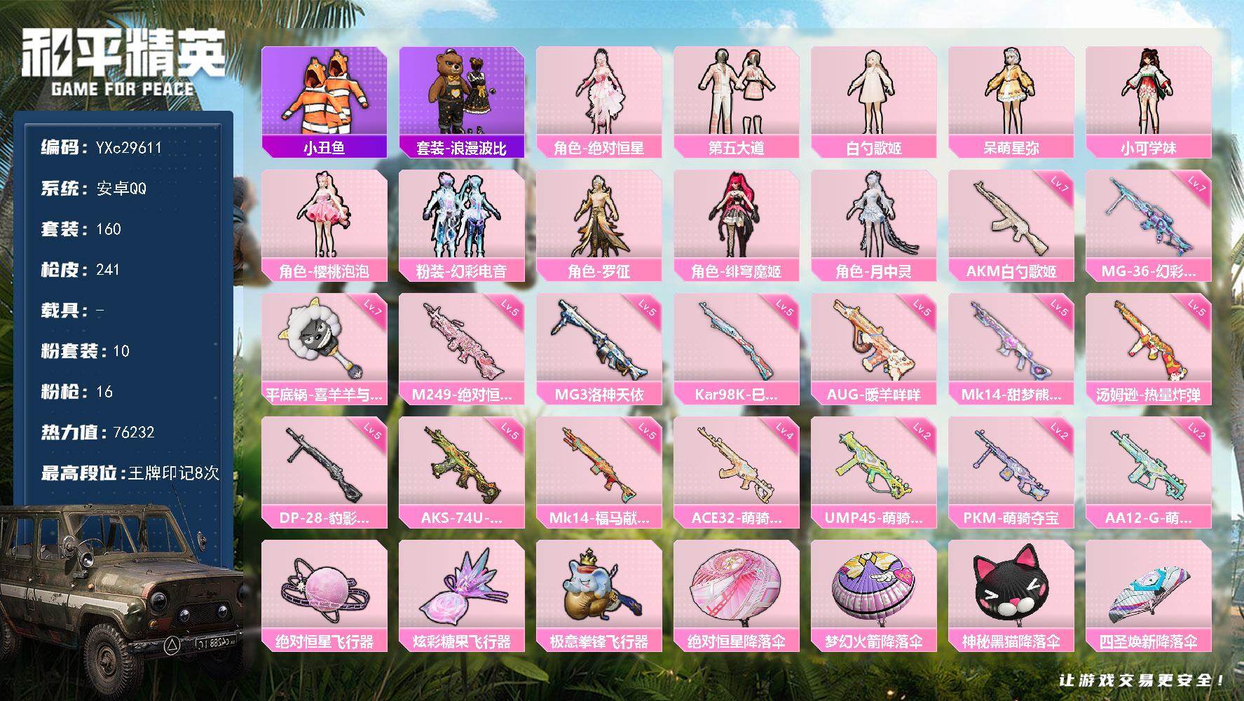 PX_2558728-??灵,小丑鱼,满地铁天赋】YXc29611-【可二次】【因赛季更新游戏段付以上号为准!】 ,安卓Q-10粉装16特效枪8热门160套装241枪皮,,8印记,历史超级王牌6星, 【10粉装】,绯穹魔姬,月中灵,罗征,樱桃泡泡,白勺歌姬,呆萌星弥,小可学妹,绝对恒星,幻彩电音,第五大道, 【16特效枪】,AKM-白勺歌姬,(7级),AKS-74U-森灵之息,(5级),Kar98K-巳巳如意,(5级),MG-36-幻彩电音,(7级),DP-28-豹影疾电,(5级),AUG-暖羊咩咩,(5级),Mk14-甜梦熊击,(5级),汤姆逊-热量炸弹,(5级),M249-绝对恒星,(5级),MG3-洛神天依,(5级),Mk14-福马献瑞,(5级),AA12-G-萌骑幻想,(2级),PKM-萌骑夺宝,(2级),UMP45-萌骑冒险,(2级),ACE32-萌骑漫游,(4级),平底锅-喜羊羊与灰太狼,(7级), 【8热门】,小丑鱼,浪漫假日,大橘为重,浪漫波比,团圆交子,瑞龙福将,英勇保护者,M762-瑞龙福将, 【2头盔】,童趣迷兔头盔,甜蜜誓约头盔, 【2背包】,梦幻火箭背包,神秘黑猫背包,