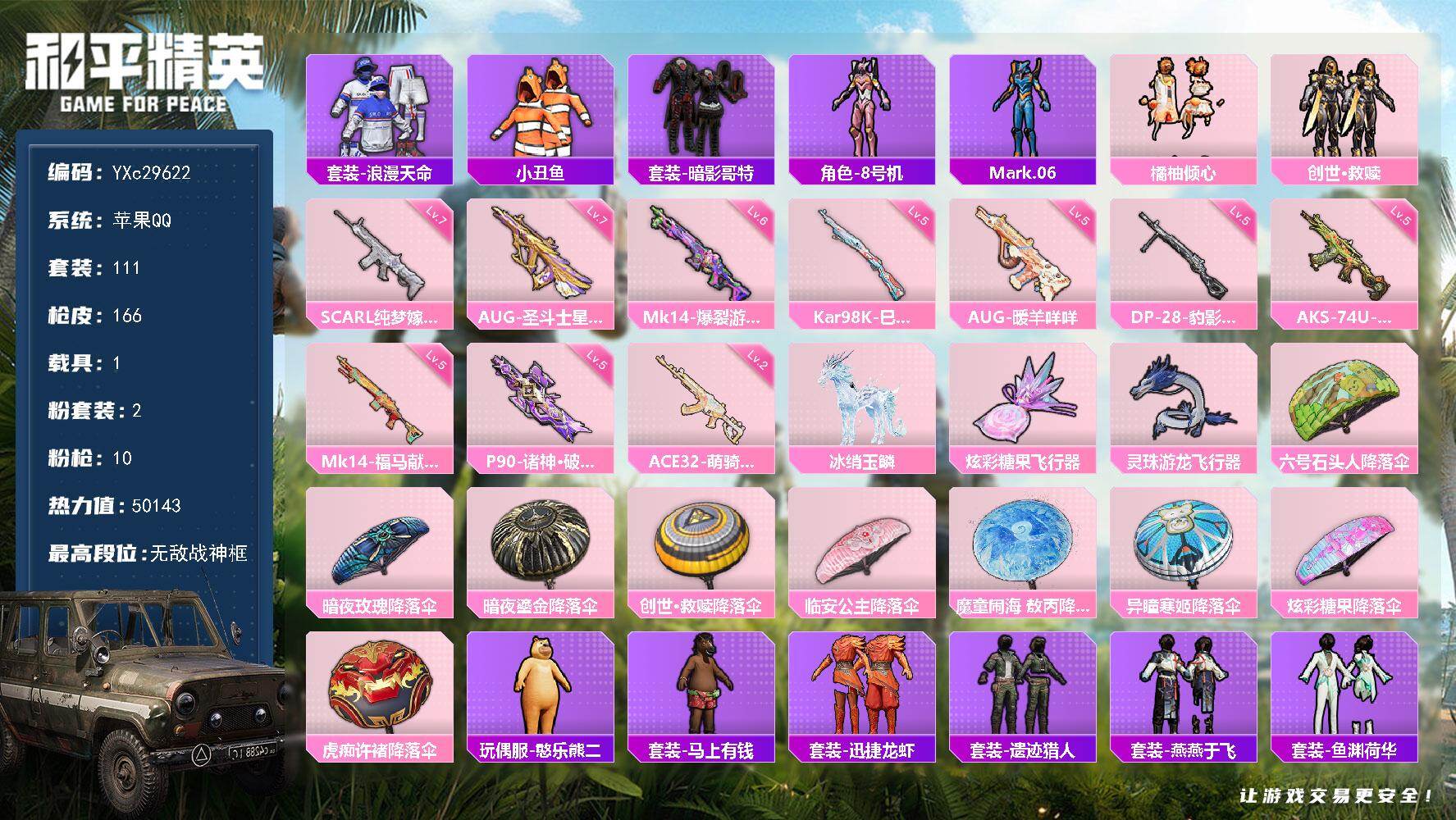 PX_2558737-??框,哥特,满地铁天赋】YXc29622-【无二次协助处理】【因赛季更新游戏段付以上号为准!】 ,苹果Q-1稀有1载具2粉装9特效枪10热门111套装166枪皮,5印记,历史无敌战神, 【1稀有】,浪漫天命, 【1载具】,冰绡玉鳞, 【2粉装】,创世救赎,橘柚倾心, 【9特效枪】,SCAR-L-纯梦嫁纱,(7级),AKS-74U-森灵之息,(5级),Kar98K-巳巳如意,(5级),DP-28-豹影疾电,(5级),AUG-圣斗士星矢,(7级),AUG-暖羊咩咩,(5级),Mk14-爆裂游戏,(6级),Mk14-福马献瑞,(5级),ACE32-萌骑漫游,(2级), 【10热门】,8号机,Mark.06,小丑鱼,呆萌铁蟹,鹰眼刺客,暗影哥特,狂沙舞者,漫步者,破蛋小黄鸡,M24-奇异狩猎者, 【1头盔】,梦幻火箭头盔,