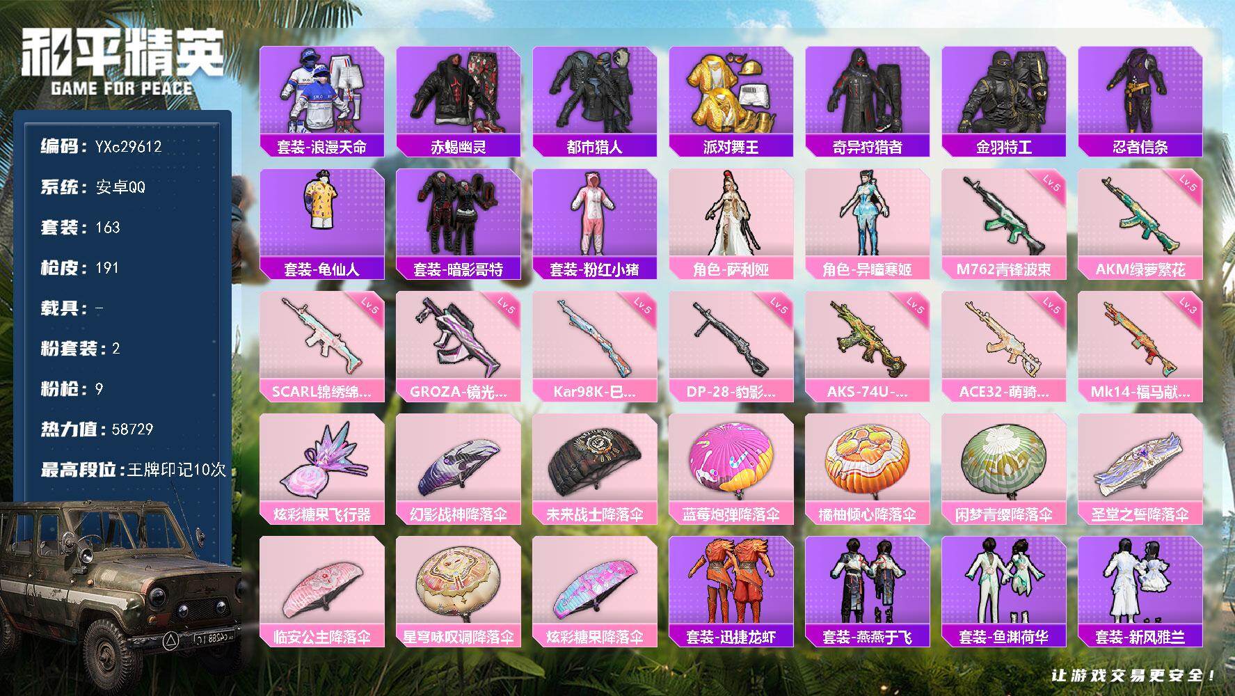 PX_2558749-??,赤蝎,金鞋,哥特】YXc29612-【无二次协助处理】【因赛季更新游戏段付以上号为准!】 ,安卓Q-6稀有2粉装9特效枪17热门163套装191枪皮,10印记,历史超级王牌17星, 【6稀有】,奇异狩猎者,赤蝎幽灵,都市猎人,浪漫天命,派对舞王,派对舞王(金靴子), 【2粉装】,萨利娅,异瞳寒姬, 【9特效枪】,SCAR-L-锦绣绵绵,(5级),AKS-74U-森灵之息,(5级),AKM-绿萝繁花,(5级),Kar98K-巳巳如意,(5级),M762-青锋波束,(5级),DP-28-豹影疾电,(5级),GROZA-镜光银凌,(5级),Mk14-福马献瑞,(3级),ACE32-萌骑漫游,(5级), 【17热门】,龟仙人,东方飞龙,鹰眼刺客,金羽特工,暗影哥特,团圆交子,瑞龙福将,粉红小猪,忍者信条,酷熊伴侣,漫步者,破蛋小黄鸡,极速红龙,M762-奇异狩猎者,M762-瑞龙福将,M24-奇异狩猎者,S686-奇异狩猎者, 【1头盔】,幻影战神头盔, 【1背包】,幻影战神背包,