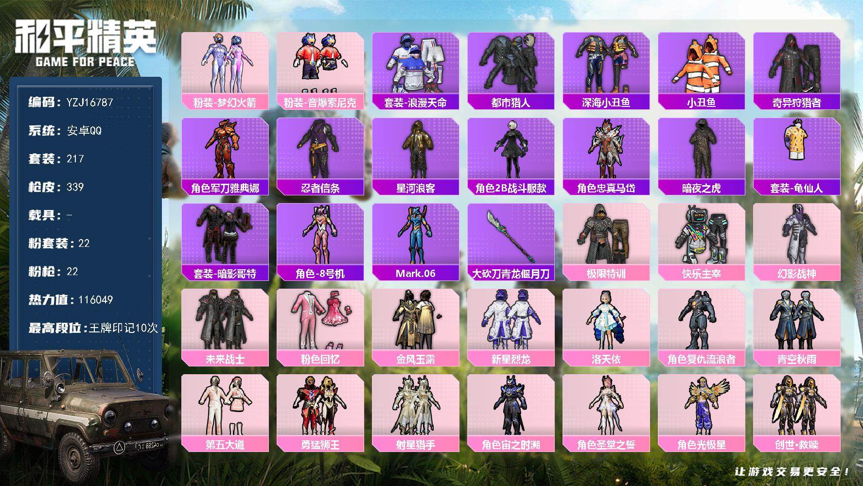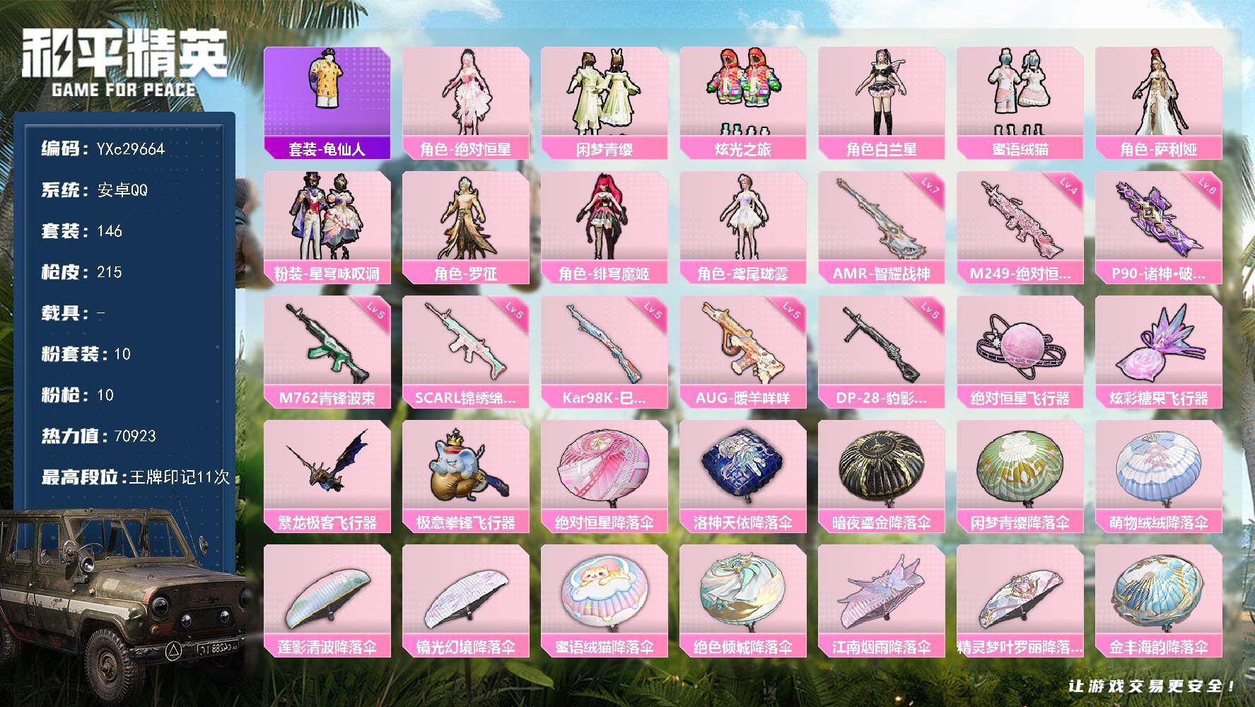 PX_2558753-无二次,安卓Q-6稀有22粉装22特效枪28热门217套装339枪皮,116049热力值,极品精氪号,地铁满天赋,满级至情至圣,新款三色螳螂,新火箭少女,洛天依,第五大道,幻影战神,小白龙,快乐主宰,圣堂之誓,创世救赎,极限特训,都市,奇异狩猎者,暗夜之虎,红眼罩,深海小丑鱼,天命,裁决冥王,2P小姐姐,6级AUG超新星,5级AK梦之光华,10印记,历史超级王牌19星,【6稀有】,奇异狩猎者,M416-黄金龙骨,AWM-黄金龙骨,AKM-百万伏特,都市猎人,浪漫天命,【22粉装】,觉醒初号机,圣堂之誓,梦幻火箭,绯穹魔姬,光极星,洛天依,金风玉露,桃粉嫣然,创世救赎,幻影战神,射星猎手,宙之时溯,勇猛狮王,快乐主宰,青空秋雨,粉色回忆,极限特训,未来战士,第五大道,新星烈龙,音爆索尼克,复仇流浪者,【22特效枪】,M416-五爪金龙,(1级),SCAR-L-锦绣绵绵,(5级),M416-心之恋语,(2级),AKM-炫紫旋律,(4级),AKS-74U-森灵之息,(5级),Kar98K-巳巳如意,(5级),M762-鬼刀,(2级),DP-28-豹影疾电,(5级),AUG-许七安,(1级),AUG-超新星,(6级),GROZA-镜光银凌,(5级),M416-至情至圣,(9级),AKM-梦之光华,(5级),MG3-洛神天依,(4级),信号枪-金乌曜日,(2级),Mk14-福马献瑞,(5级),AA12-G-萌骑幻想,(2级),PKM-萌骑夺宝,(1级),UMP45-萌骑冒险,(1级),ACE32-萌骑漫游,(2级),SPAS-12-音爆索尼克,(5级),Vector-环太平洋,(5级),【28热门】,8号机,Mark.06,小丑鱼,龟仙人,暗夜之虎,2B战斗服款,狮王雄心,暗夜之虎,迅捷狂鲨,深海小丑鱼,裁决冥王,暗影哥特,醒狮腾龙,团圆交子,瑞龙福将,星河浪客,忍者信条,水银刺客,狂沙舞者,漫步者,玄武圣者,破蛋小黄鸡,军刀雅典娜,英勇保护者,弄潮海豚,M416-快乐主宰,M762-瑞龙福将,M24-奇异狩猎者,【3飞行器】,炎氏战神飞行翼,千面幻镜飞行器,闪光银龙飞行器,【4头盔】,梦幻火箭头盔,幻影战神头盔,深海小丑鱼头盔,金羽特工头盔,【5背包】,梦幻火箭背包,百万伏特背包,幻影战神背包,萌熊伴侣背包,金羽特工背包,营地ID:929419820,