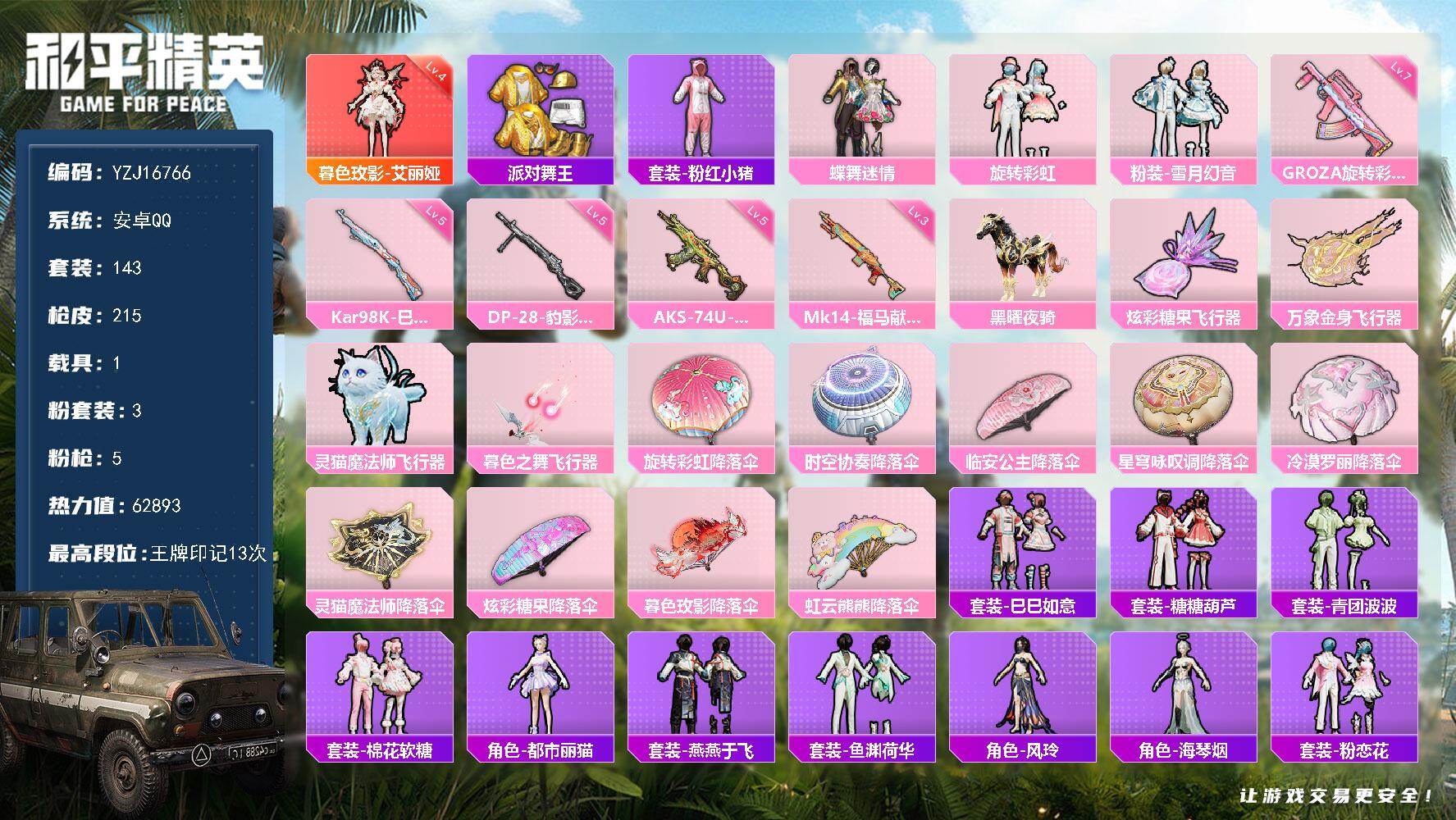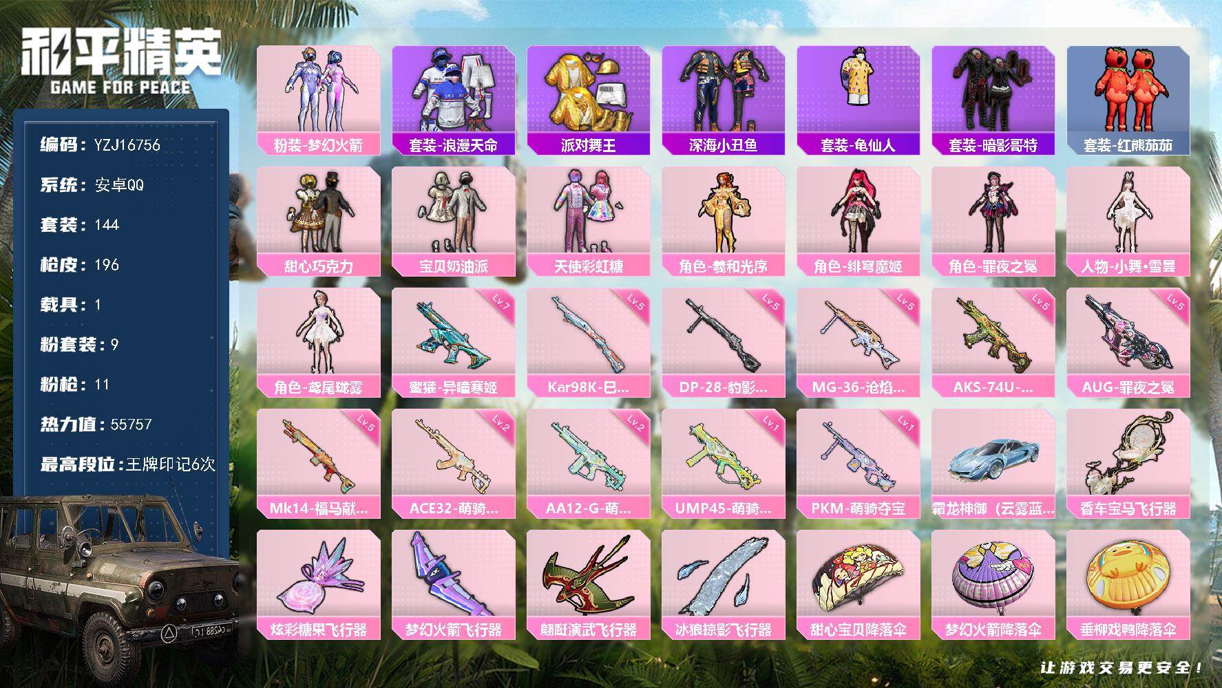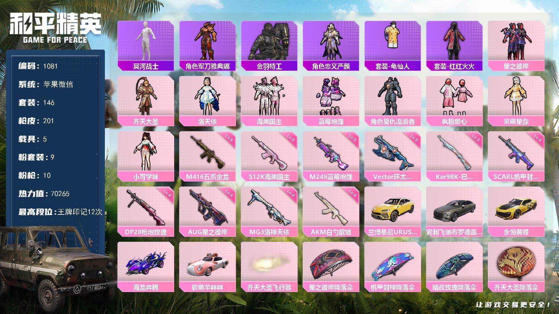 PX_2558783-?,冥河战士,洛天依,军刀雅典娜,红红火火,齐天大圣,苹果,微信-9粉装-10特效枪-5载具-1粉色飞行器-70265热力值-12王牌印记-146套装-201枪皮 【热门品类】:套装-冥河战士,角色-军刀雅典娜,套装-金羽特工,角色-忠义严颜,套装-龟仙人,套装-红红火火 【粉色套装】:粉装-星之彼岸,粉装-齐天大圣,角色-洛天依,粉装-海渊国主,粉装-蓝莓炮弹,角色-复仇流浪者,粉装-飒粉甜心,角色-呆萌星弥,角色-小可学妹 【粉色枪皮等级】:AKM-白勺歌姬(四级),SCAR-L-机甲封神(四级),M416-五爪金龙(六级),AUG-星之彼岸(四级),Vector-环太平洋(五级),Kar98K-巳巳如意(五级),S12K-海渊国主(五级),M249-蓝莓炮弹(五级),DP-28-枪炮玫瑰(四级),MG3-洛神天依(四级) 【粉色载具】:兰博基尼URUS(明艳黄),宾利飞驰(布罗德盖棕双色),永恒黄蜂,海龙奔腾,软萌羊咩咩 【粉色枪皮】:AKM-白勺歌姬,SCAR-L-机甲封神,M416-五爪金龙,AUG-星之彼岸,Vector-环太平洋,Kar98K-巳巳如意,S12K-海渊国主,M249-蓝莓炮弹,DP-28-枪炮玫瑰,MG3-洛神天依 【粉色飞行器】:齐天大圣飞行器 【粉色降落伞】:星之彼岸降落伞,机甲封神降落伞,暗夜玫瑰降落伞,齐天大圣降落伞,洛神天依降落伞,海渊国主降落伞,环太平洋降落伞,垂柳戏鸭降落伞,青空秋雨降落伞,飒粉甜心降落伞,白勺歌姬降落伞 【稀有套装】:套装-龟仙人,玩偶服-酷勇熊大,套装-巳巳如意,套装-雪国风尚,套装-马上有钱,角色-临安公主,套装-燕燕于飞,套装-鱼渊荷华,套装-霓虹热舞 【稀有枪皮】:AKM-墨染幽兰,AKM-夜灯,AKM-彩虹符号,AKM-星之彼岸,AKM-海渊国主,AKM-环太平洋,AKM-萌趣颜团子,AKM-虎虎生威,AKM-霓虹街区,M16A4-冥河战士,M16A4-凝视深渊,M16A4-幻世战舞者,M16A4-甜心亚梦,SCAR-L-暗夜玫瑰,SCAR-L-炫彩节奏,SCAR-L-玉兔迎春,SCAR-L-碧影闪光,M416-暗夜行者,M416-月影鸳鸯,M416-红色方程式,GROZA-2B战斗服款,GROZA-异彩先驱,GROZA-懵萌河马,GROZA-春暖花开,GROZA-治愈之星,GROZA-田