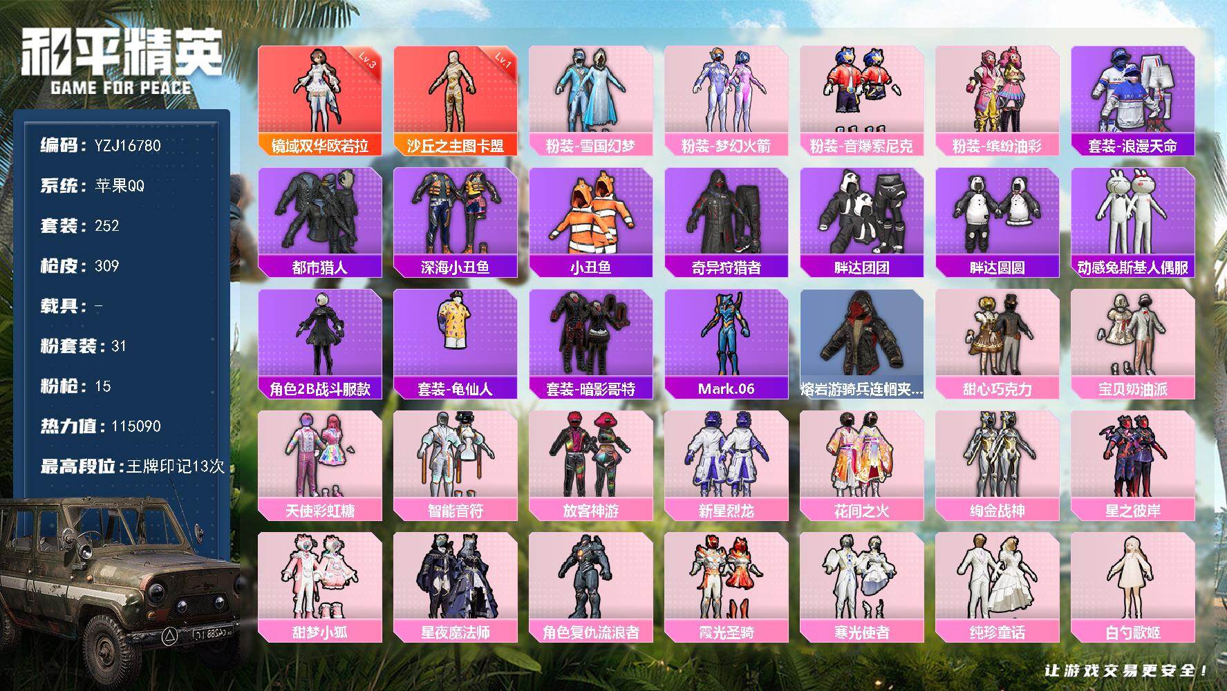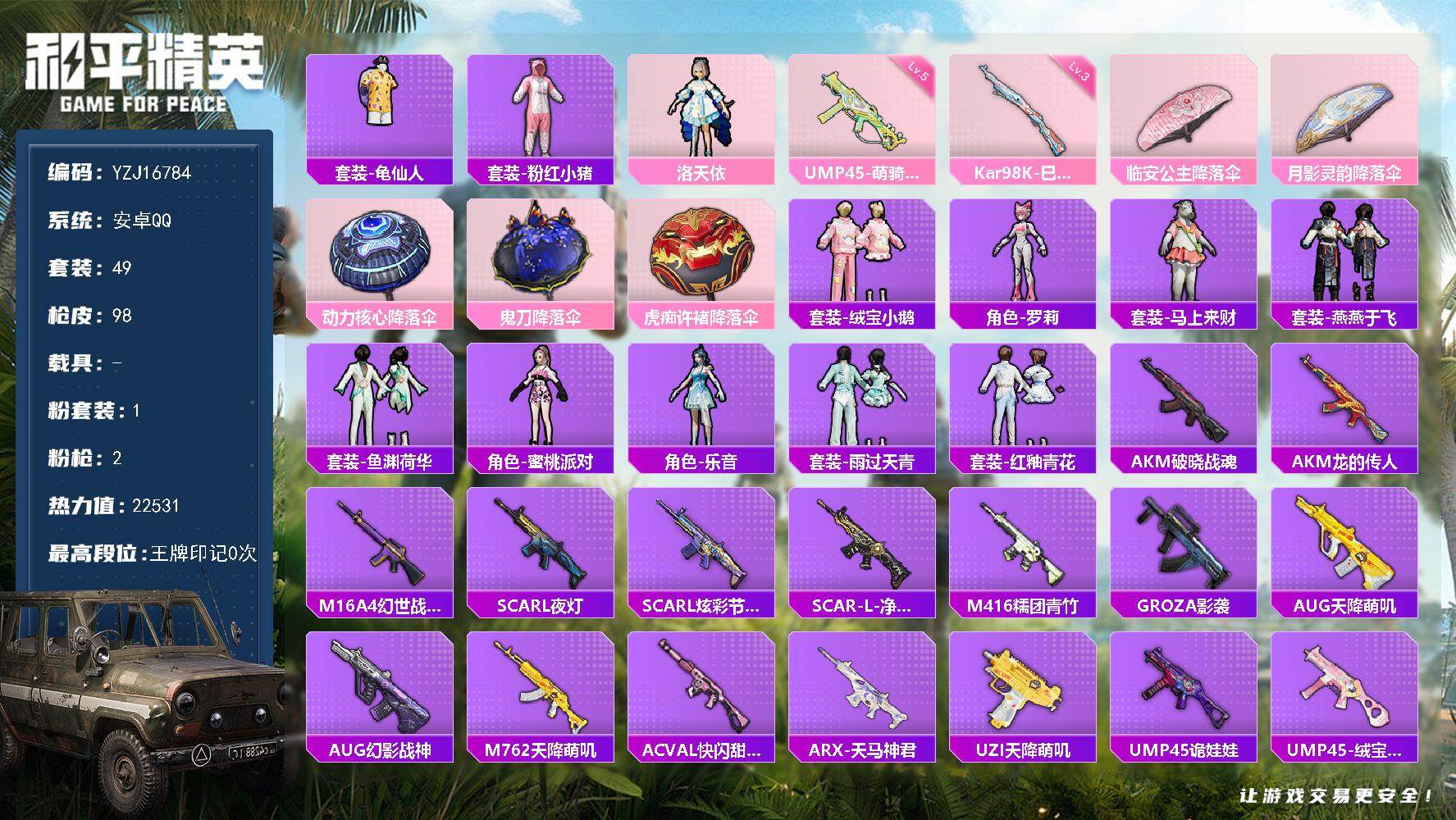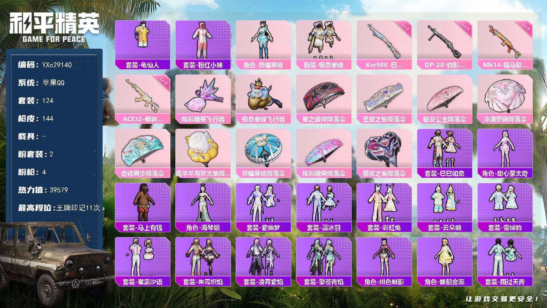PX_2558783-?,冥河战士,洛天依,军刀雅典娜,红红火火,齐天大圣,苹果,微信-9粉装-10特效枪-5载具-1粉色飞行器-70265热力值-12王牌印记-146套装-201枪皮 【热门品类】:套装-冥河战士,角色-军刀雅典娜,套装-金羽特工,角色-忠义严颜,套装-龟仙人,套装-红红火火 【粉色套装】:粉装-星之彼岸,粉装-齐天大圣,角色-洛天依,粉装-海渊国主,粉装-蓝莓炮弹,角色-复仇流浪者,粉装-飒粉甜心,角色-呆萌星弥,角色-小可学妹 【粉色枪皮等级】:AKM-白勺歌姬(四级),SCAR-L-机甲封神(四级),M416-五爪金龙(六级),AUG-星之彼岸(四级),Vector-环太平洋(五级),Kar98K-巳巳如意(五级),S12K-海渊国主(五级),M249-蓝莓炮弹(五级),DP-28-枪炮玫瑰(四级),MG3-洛神天依(四级) 【粉色载具】:兰博基尼URUS(明艳黄),宾利飞驰(布罗德盖棕双色),永恒黄蜂,海龙奔腾,软萌羊咩咩 【粉色枪皮】:AKM-白勺歌姬,SCAR-L-机甲封神,M416-五爪金龙,AUG-星之彼岸,Vector-环太平洋,Kar98K-巳巳如意,S12K-海渊国主,M249-蓝莓炮弹,DP-28-枪炮玫瑰,MG3-洛神天依 【粉色飞行器】:齐天大圣飞行器 【粉色降落伞】:星之彼岸降落伞,机甲封神降落伞,暗夜玫瑰降落伞,齐天大圣降落伞,洛神天依降落伞,海渊国主降落伞,环太平洋降落伞,垂柳戏鸭降落伞,青空秋雨降落伞,飒粉甜心降落伞,白勺歌姬降落伞 【稀有套装】:套装-龟仙人,玩偶服-酷勇熊大,套装-巳巳如意,套装-雪国风尚,套装-马上有钱,角色-临安公主,套装-燕燕于飞,套装-鱼渊荷华,套装-霓虹热舞 【稀有枪皮】:AKM-墨染幽兰,AKM-夜灯,AKM-彩虹符号,AKM-星之彼岸,AKM-海渊国主,AKM-环太平洋,AKM-萌趣颜团子,AKM-虎虎生威,AKM-霓虹街区,M16A4-冥河战士,M16A4-凝视深渊,M16A4-幻世战舞者,M16A4-甜心亚梦,SCAR-L-暗夜玫瑰,SCAR-L-炫彩节奏,SCAR-L-玉兔迎春,SCAR-L-碧影闪光,M416-暗夜行者,M416-月影鸳鸯,M416-红色方程式,GROZA-2B战斗服款,GROZA-异彩先驱,GROZA-懵萌河马,GROZA-春暖花开,GROZA-治愈之星,GROZA-田