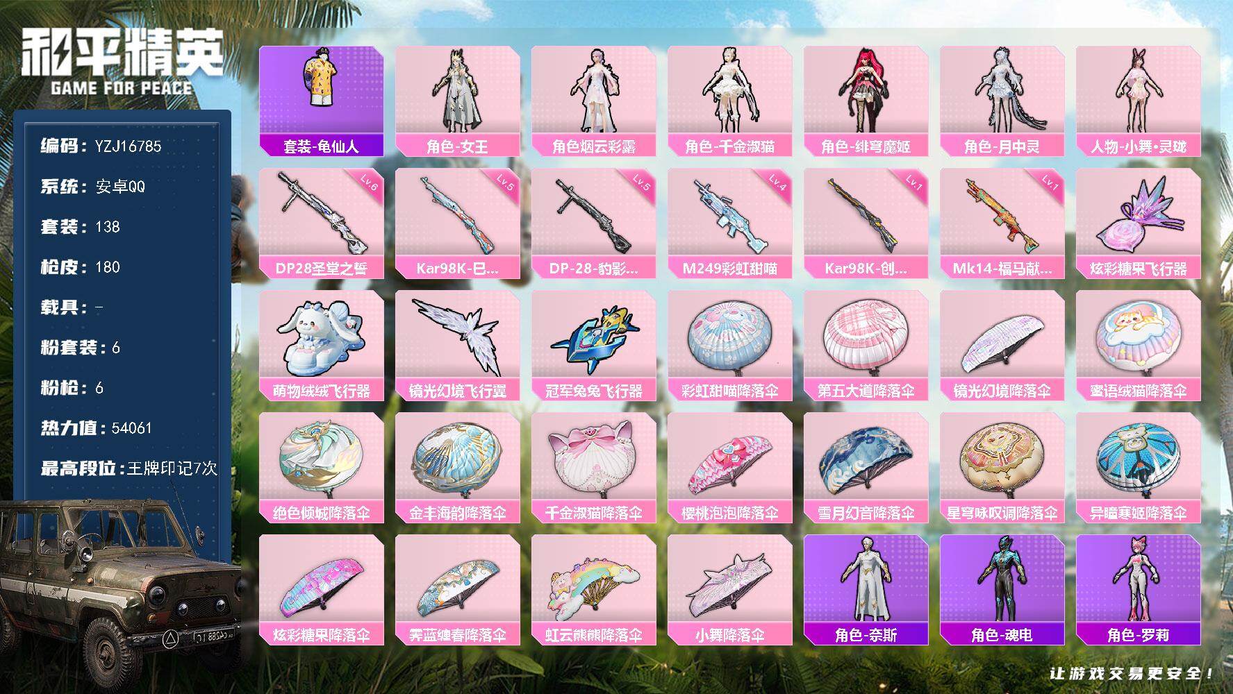 PX_2558773-可二次,安卓Q-6粉装6特效枪1热门138套装180枪皮,54021热力值,极品小女号,小舞灵珑,千金淑猫,女王,烟云彩露,月中灵,6级DP28圣堂之誓,7印记,历史卓越王牌9星,【6粉装】,绯穹魔姬,女王,小舞灵珑,千金淑猫,月中灵,烟云彩露,【6特效枪】,Kar98K-巳巳如意,(5级),DP-28-豹影疾电,(5级),DP-28-圣堂之誓,(6级),Kar98K-创世救赎,(1级),M249-彩虹甜喵,(4级),Mk14-福马献瑞,(1级),【1热门】,龟仙人,【2飞行器】,镜光幻境飞行翼,萌物绒绒飞行器,营地ID:930550476,