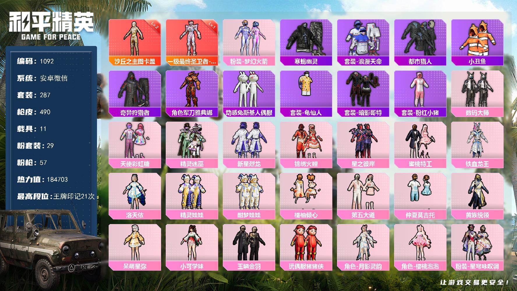 PX_2558782-,微信-2神装-天赋8级-29粉装-57特效枪-11载具-27粉色飞行器-184703热力值-21王牌印记-287套装-490枪皮 【红色神装等级】:最终圣卫者-帕修斯(一级),沙丘之主-图卡盟(二级) 【红色角色神装】:最终圣卫者-帕修斯,沙丘之主-图卡盟 【热门品类】:粉装-梦幻火箭,套装-寒蝎幽灵,套装-浪漫天命,套装-都市猎人,套装-小丑鱼,套装-奇异狩猎者,角色-军刀雅典娜,套装-动感兔斯基人偶服,套装-龟仙人,套装-暗影哥特,套装-粉红小猪 【粉色套装】:粉装-数码大师,粉装-天使彩虹糖,粉装-精灵迷巫,粉装-梦幻火箭,粉装-新星烈龙,粉装-锦绣火鲤,粉装-星之彼岸,粉装-蜜桃特工,粉装-铁血龙王,角色-洛天依,粉装-精灵娃娃,粉装-酣梦娃娃,粉装-橘柚倾心,粉装-第五大道,粉装-仲夏莫吉托,粉装-黄族统领,角色-呆萌星弥,角色-小可学妹,粉装-玉鳞金羽,玩偶服-猪猪侠,角色-月影灵韵,角色-樱桃泡泡,粉装-星穹咏叹调,粉装-幻彩电音,角色-狂魅哈莉,角色-狂魇小丑,角色-罗征,角色-荧海星豚,角色-羊梦糖心 【粉色枪皮等级】:AKM-甜心宝贝(四级),AKM-炫紫旋律(一级),AKM-梦之光华(一级),AKM-星际浪客(一级),AKM-盖世英雄(七级),AKM-白勺歌姬(一级),SCAR-L-机甲封神(一级),SCAR-L-青春物语(一级),SCAR-L-天蓬元帅(六级),SCAR-L-纯梦嫁纱(一级),SCAR-L-锦绣绵绵(五级),SCAR-L-金蛇镇世(一级),M416-五爪金龙(七级),M416-心之恋语(一级),M416-风花雪月(一级),M416-至情至圣(一级),M416-墨龙九天(一级),M416-女娲灵识(一级),M416-灵猫魔法师(六级),GROZA-焦糖拿铁(一级),GROZA-圣辉之星(五级),AUG-星之彼岸(一级),AUG-圣斗士星矢(五级),M762-激战未来(一级),M762-甜心娃娃(五级),蜜獾-荧海星豚(四级),UMP45-恐龙拽拽(五级),Vector-飒粉甜心(一级),Vector-最终圣卫者(三级),汤姆逊-热量炸弹(五级),野牛-绯月迷踪(四级),AKS-74U-信仰神谕(一级),AKS-74U-星穹咏叹调(一级),AKS-74U-无垠阁(三级),P90-粉樱探戈(一级),P90-魔童闹海,敖丙(三