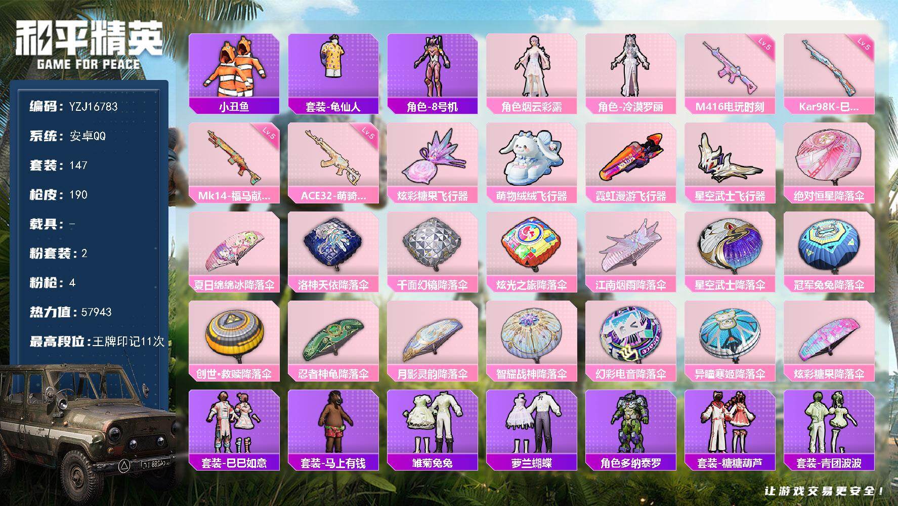 PX_2558793-可二次,安卓Q-1稀有2粉装4特效枪6热门147套装190枪皮,57943热力值,极品小女号,烟云彩露,冷漠罗丽,云朵鹅,海盐绵绵冰,粉螳螂,小丑鱼,豚鼠丹丹,满级M4电玩,11印记,历史超级王牌16星,【1稀有】,AKM-缤纷海域,【2粉装】,烟云彩露,冷漠罗丽,【4特效枪】,M416-电玩时刻,(5级),Kar98K-巳巳如意,(5级),Mk14-福马献瑞,(5级),ACE32-萌骑漫游,(5级),【6热门】,8号机,小丑鱼,龟仙人,豚鼠丹丹,破蛋小黄鸡,极速红龙,【1飞行器】,萌物绒绒飞行器,【1头盔】,深海小丑鱼头盔,营地ID:723278002,