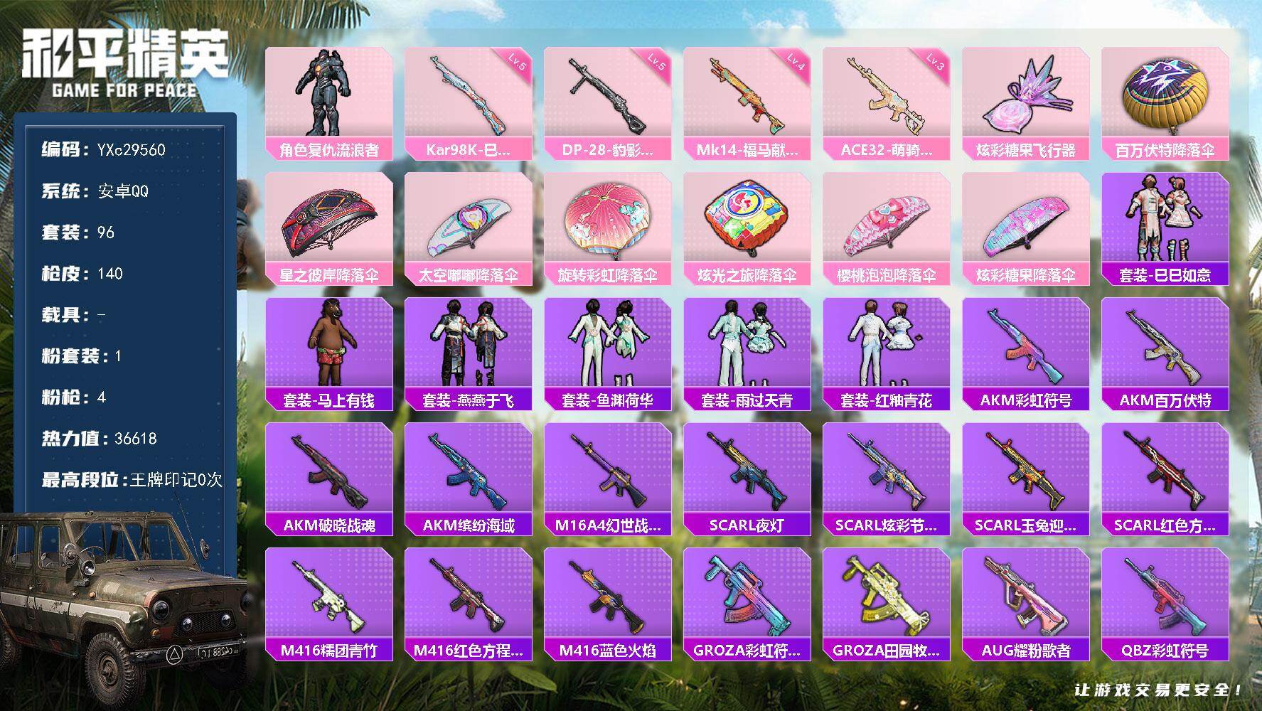 PX_2558871-0-【可二次】【因赛季更新游戏段付以上号为准!】 ,安卓Q-2稀有1粉装4特效枪4热门96套装140枪皮,,历史荣耀皇冠Ⅳ, 【2稀有】,AKM-缤纷海域,AKM-百万伏特, 【1粉装】,复仇流浪者, 【4特效枪】,Kar98K-巳巳如意,(5级),DP-28-豹影疾电,(5级),Mk14-福马献瑞,(4级),ACE32-萌骑漫游,(3级), 【4热门】,迅捷狂鲨,豚鼠丹丹,破蛋小黄鸡,S686-奇异狩猎者