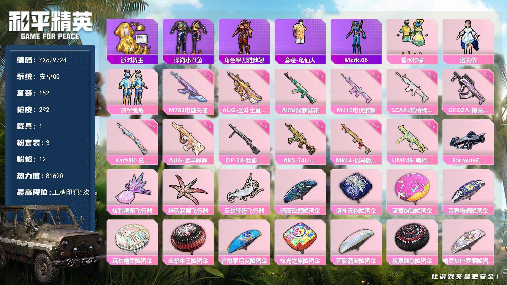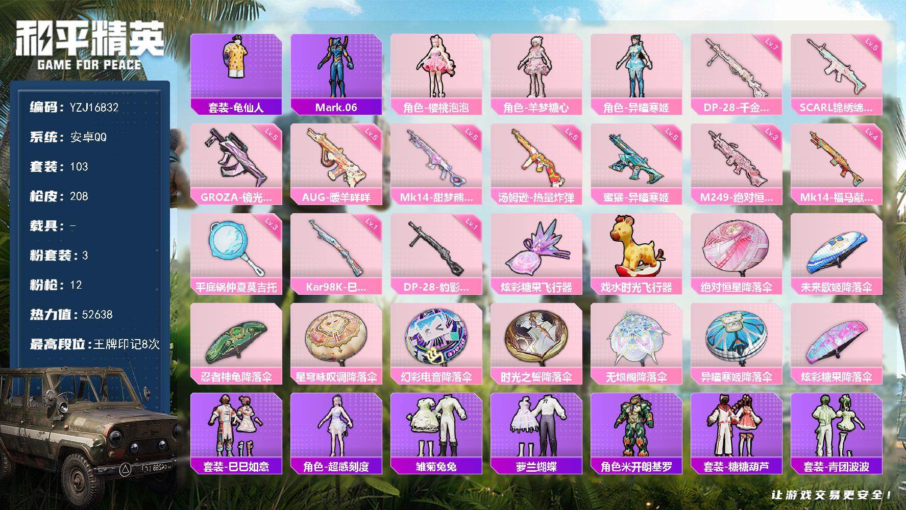 PX_2558861-可二次,安卓Q-3粉装12特效枪5热门103套装208枪皮,精品女号,地铁满天赋,羊梦糖心,樱桃泡泡,云朵鹅,快闪甜心,春光漫游,蓝螳螂,TT战队服,满级DP28千金淑猫,满级AUG暖羊,8印记,历史传奇王牌15星,【3粉装】,异瞳寒姬,樱桃泡泡,羊梦糖心,52638热力值,8印记,历史传奇王牌15星,【3粉装】,异瞳寒姬,樱桃泡泡,羊梦糖心,【12特效枪】,SCAR-L-锦绣绵绵,(5级),Kar98K-巳巳如意,(1级),DP-28-千金淑猫,(7级),DP-28-豹影疾电,(1级),AUG-暖羊咩咩,(5级),蜜獾-异瞳寒姬,(5级),Mk14-甜梦熊击,(5级),GROZA-镜光银凌,(5级),汤姆逊-热量炸弹,(5级),M249-绝对恒星,(3级),Mk14-福马献瑞,(4级),平底锅-仲夏莫吉托,(3级),【5热门】,Mark.06,龟仙人,TT战队服,漫步者,破蛋小黄鸡,营地ID:951557415,
