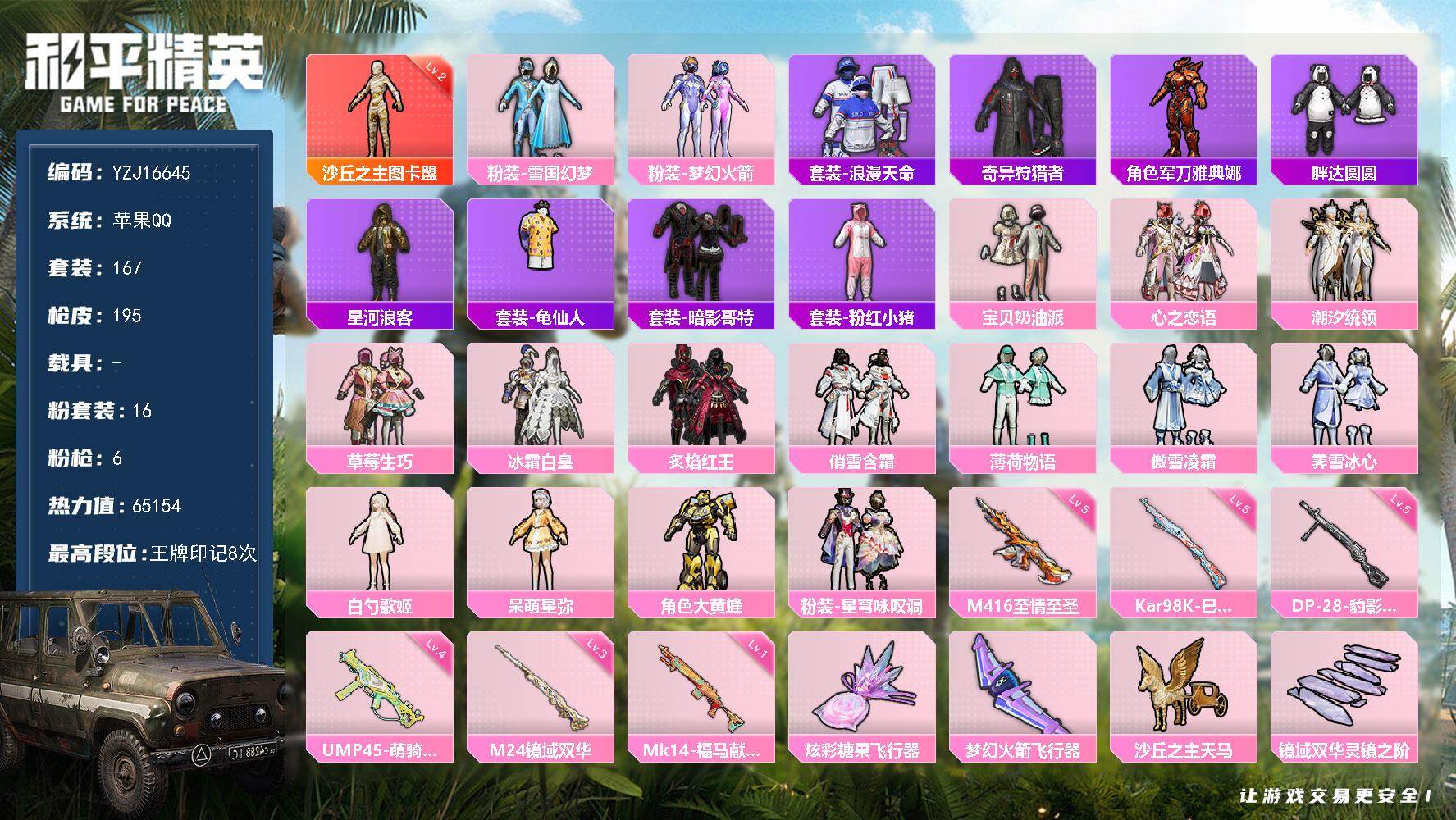 PX_2558857-可二次-苹果Q-1红装2稀有16粉装6特效枪23热门【极品神装素材号,2级图卡盟,火箭少女,雪国,白勺,呆萌,大黄蜂,奶油派,霁雪冰心,胖达圆圆,4AM战队服,蜘蛛侠,星河浪客,青涩年华,艾伦沃克,红眼罩,天命,5级M4至情至圣,1级沙丘之主天马,1级龙翔九天,暗夜玫瑰背包,雪国精灵背包头盔,伙伴-小拳击手,伙伴-四级包嘟嘟,7款飞行器】167套装195枪皮,65154热力值,8印记,历史卓越王牌4星,【1红装】,沙丘之主-图卡盟,(2级),【2稀有】,奇异狩猎者,浪漫天命,【16粉装】,梦幻火箭,雪国幻梦,宝贝奶油派,大黄蜂,星穹咏叹调,白勺歌姬,呆萌星弥,心之恋语,潮汐统领,草莓生巧,冰霜白皇,炙焰红王,霁雪冰心,傲雪凌霜,薄荷物语,俏雪含霜,【6特效枪】,Kar98K-巳巳如意,(5级),DP-28-豹影疾电,(5级),M24-镜域双华,(3级),M416-至情至圣,(5级),Mk14-福马献瑞,(1级),UMP45-萌骑冒险,(4级),【23热门】,龟仙人,青涩年华,奶芙汪汪,恶魔喵喵,胖达圆圆,4AM战队服,暗影哥特,团圆交子,星河浪客,粉红小猪,冰爽海盐,薄荷蓝莓,抹茶蜜豆,蓝甜马卡龙,粉甜马卡龙,破蛋小黄鸡,极速红龙,军刀雅典娜,AKM-奇异狩猎者,M762-奇异狩猎者,M762-瑞龙福将,M24-奇异狩猎者,M24-香水柠檬,【2飞行器】,龙翔九天飞行器,梦幻火箭飞行器,【7头盔】,童趣迷兔头盔,梦幻火箭头盔,雪国精灵头盔,甜心宝贝头盔,心之恋语头盔,马卡龙头盔,夏日绵绵冰头盔,【6背包】,梦幻火箭背包,雪国精灵背包,甜心宝贝背包,放客神游背包,心之恋语背包,马卡龙背包,营地ID:731653790