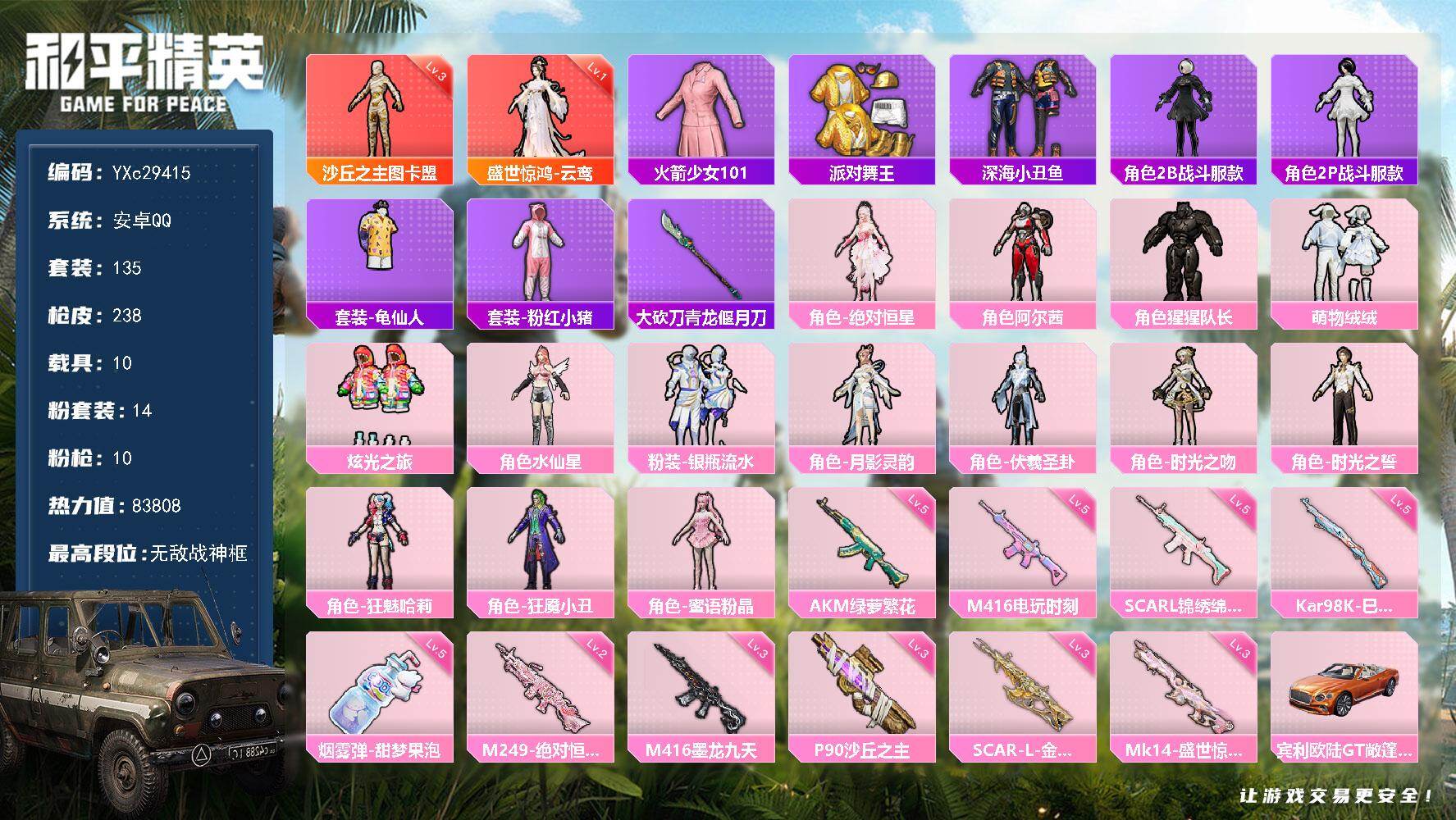 PX_2558863-??老1号!战神框,3级图卡盟,云鸾,老101,金鞋】YXc29415-【无二次】【因赛季更新游戏段付以上号为准!】 ,安卓Q-2红装4稀有10载具14粉装10特效枪8热门135套装238枪皮,13印记,历史无敌战神, 【2红装】,盛世惊鸿-云鸾,(1级),沙丘之主-图卡盟,(3级), 【4稀有】,火箭少女101,AKM-缤纷海域,派对舞王,派对舞王(金靴子), 【10载具】,宾利添越(浅瞪羚棕),宾利BATUR(极速紫),宾利欧陆GT火焰橘,虚妄之影(炫耀紫),宾利飞驰布罗德盖棕双色,Formula(巅峰兰),幻影随行,擎天重拳,永恒黄蜂,护世瑞兽, 【14粉装】,蜜语粉晶,狂魅哈莉,水仙星,狂魇小丑,时光之吻,月影灵韵,猩猩队长,阿尔茜,炫光之旅,时光之誓,伏羲圣卦,绝对恒星,银瓶流水,萌物绒绒, 【10特效枪】,SCAR-L-金蛇镇世,(3级),SCAR-L-锦绣绵绵,(5级),M416-墨龙九天,(3级),M416-电玩时刻,(5级),P90-沙丘之主,(3级),AKM-绿萝繁花,(5级),Kar98K-巳巳如意,(5级),Mk14-盛世惊鸿,(3级),M249-绝对恒星,(2级),烟雾弹-甜梦果泡,(5级), 【8热门】,龟仙人,2B战斗服款,2P战斗服款,迅捷狂鲨,深海小丑鱼,粉红小猪,破蛋小黄鸡,弄潮海豚, 【3飞行器】,龙翔九天飞行器,萌物绒绒飞行器,炎氏战神飞行翼, 【1头盔】,深海小丑鱼头盔, 【1背包】,深海小丑鱼背包,