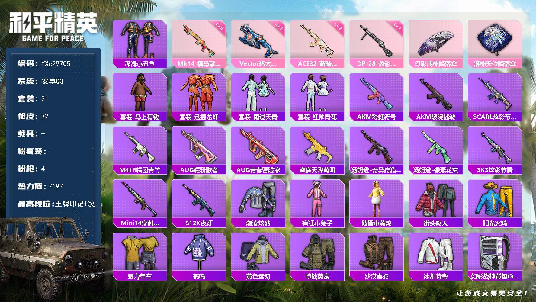 PX_2558869-??尾】YXc29705-【可二次】【因赛季更新游戏段付以上号为准!】 ,安卓Q-4特效枪2热门21套装32枪皮,1印记,历史超级王牌4星, 【4特效枪】,DP-28-豹影疾电,(1级),Mk14-福马献瑞,(5级),ACE32-萌骑漫游,(2级),Vector-环太平洋,(3级), 【2热门】,深海小丑鱼,破蛋小黄鸡, 【1背包】,幻影战神背包