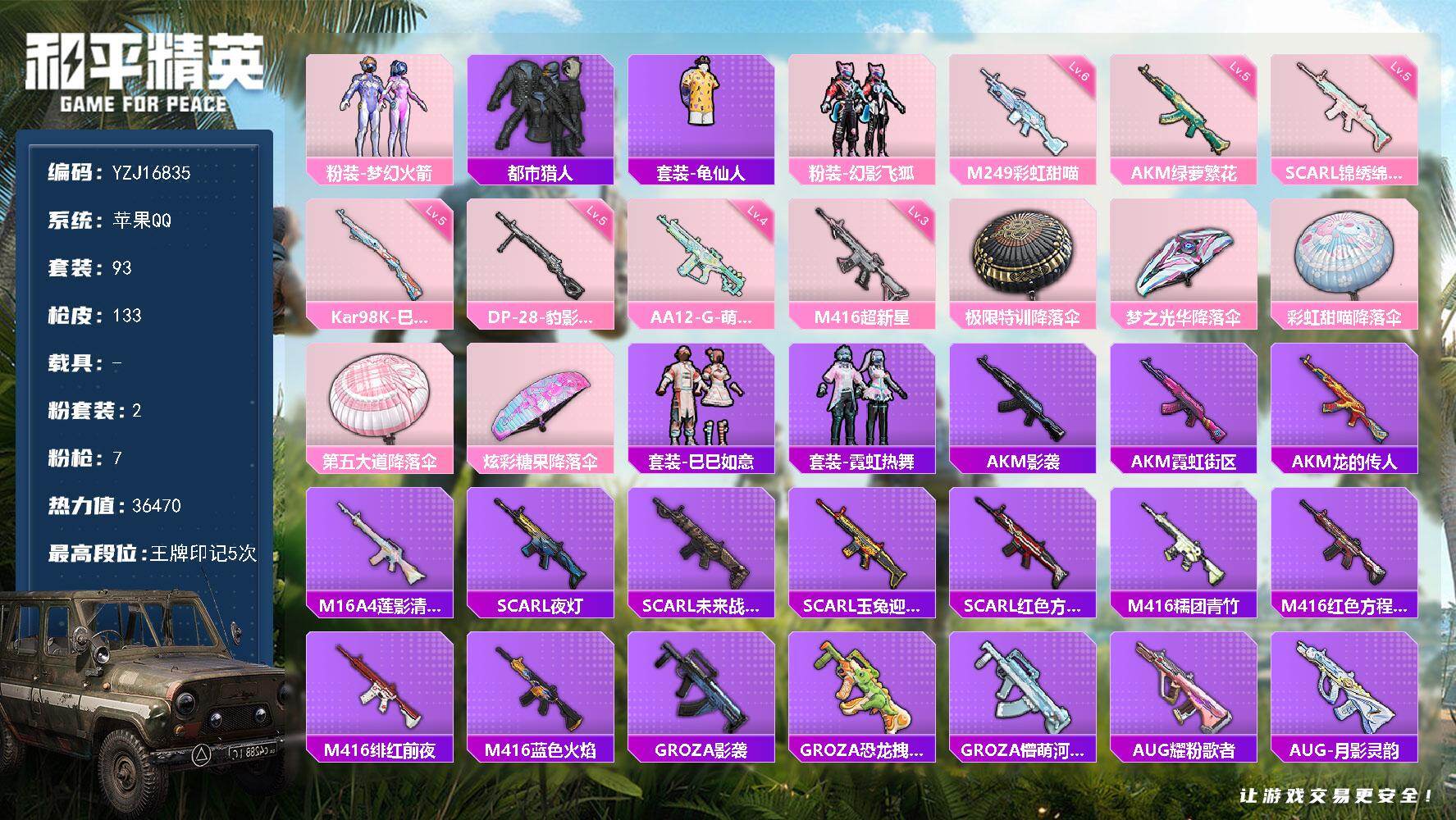 PX_2558875-不可二次,苹果Q-1稀有2粉装7特效枪5热门93套装133枪皮,极品小号,地铁满天赋,双字ID(妄嵜)8位数Q不带4!,M4超新星,幻影飞狐,都市,冰公主,6级M249彩虹甜喵,满级AK绿萝,,36470热力值,5印记,历史超级王牌12星,【1稀有】,都市猎人,【2粉装】,梦幻火箭,幻影飞狐,【7特效枪】,SCAR-L-锦绣绵绵,(5级),M416-超新星,(3级),AKM-绿萝繁花,(5级),Kar98K-巳巳如意,(5级),DP-28-豹影疾电,(5级),M249-彩虹甜喵,(6级),AA12-G-萌骑幻想,(4级),【5热门】,龟仙人,鹰眼刺客,漫步者,破蛋小黄鸡,极速红龙,【1头盔】,梦幻火箭头盔,【1背包】,深海小丑鱼背包,营地ID:941004656,