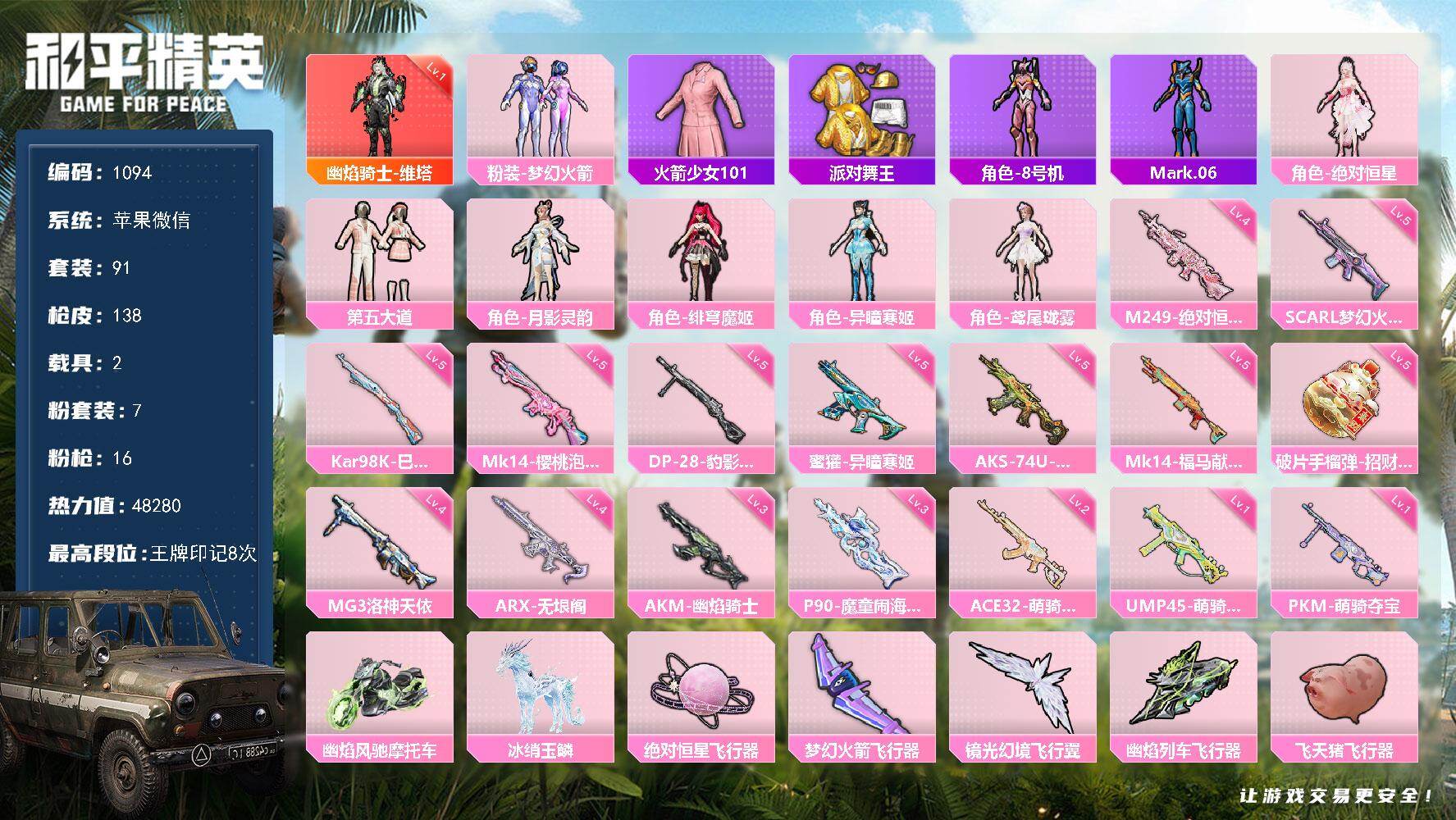 PX_2559664-制可尝试解除,老101,火箭少女,派对舞王,幽焰骑士-维塔(一级),苹果,微信-1神装-7粉装-16特效枪-2载具-6粉色飞行器-48280热力值-8王牌印记-91套装-138枪皮 【红色神装等级】:幽焰骑士-维塔(一级) 【红色角色神装】:幽焰骑士-维塔 【热门品类】:粉装-梦幻火箭,套装-火箭少女101,套装-派对舞王,角色-8号机,角色-Mark.06 【粉色套装】:角色-绝对恒星,粉装-梦幻火箭,粉装-第五大道,角色-月影灵韵,角色-绯穹魔姬,角色-异瞳寒姬,角色-鸢尾珑雾 【粉色枪皮等级】:AKM-幽焰骑士(三级),SCAR-L-梦幻火箭(五级),蜜獾-异瞳寒姬(五级),ACE32-萌骑漫游(二级),ARX-无垠阁(四级),UMP45-萌骑冒险(一级),AKS-74U-森灵之息(五级),P90-魔童闹海,敖丙(三级),Kar98K-巳巳如意(五级),Mk14-樱桃泡泡(五级),Mk14-福马献瑞(五级),M249-绝对恒星(四级),DP-28-豹影疾电(五级),MG3-洛神天依(四级),PKM-萌骑夺宝(一级),破片手榴弹-招财进宝(五级) 【粉色载具】:幽焰风驰摩托车,冰绡玉鳞 【粉色枪皮】:AKM-幽焰骑士,SCAR-L-梦幻火箭,蜜獾-异瞳寒姬,ACE32-萌骑漫游,ARX-无垠阁,UMP45-萌骑冒险,AKS-74U-森灵之息,P90-魔童闹海,敖丙,Kar98K-巳巳如意,Mk14-樱桃泡泡,Mk14-福马献瑞,M249-绝对恒星,DP-28-豹影疾电,MG3-洛神天依,PKM-萌骑夺宝,破片手榴弹-招财进宝 【粉色飞行器】:绝对恒星飞行器,梦幻火箭飞行器,镜光幻境飞行翼,幽焰列车飞行器,飞天猪飞行器,灵珠游龙飞行器 【粉色降落伞】:绝对恒星降落伞,幻影战神降落伞,梦幻火箭降落伞,洛神天依降落伞,沙丘之主降落伞,星梦奇缘降落伞,幽焰骑士降落伞,魔童闹海,敖丙降落伞,异瞳寒姬降落伞 【稀有套装】:角色-超感刻度,角色-甜心蒙太奇,套装-雪国风尚,套装-马上有钱,套装-迅捷龙虾,套装-尼罗河传说,套装-燕燕于飞,套装-鱼渊荷华,角色-绛羽幽主,套装-朱霞炽焰,套装-凌霄紫焰,套装-擎苍青焰,角色-绯色魅影,角色-紫俏灵猫,套装-书海巡游,套装-画境星梦,套装-琴音绮想,套装-雨过天青,套装-红釉青花,套装-燕雀桃枝 【稀有枪皮】:AKM-龙的传