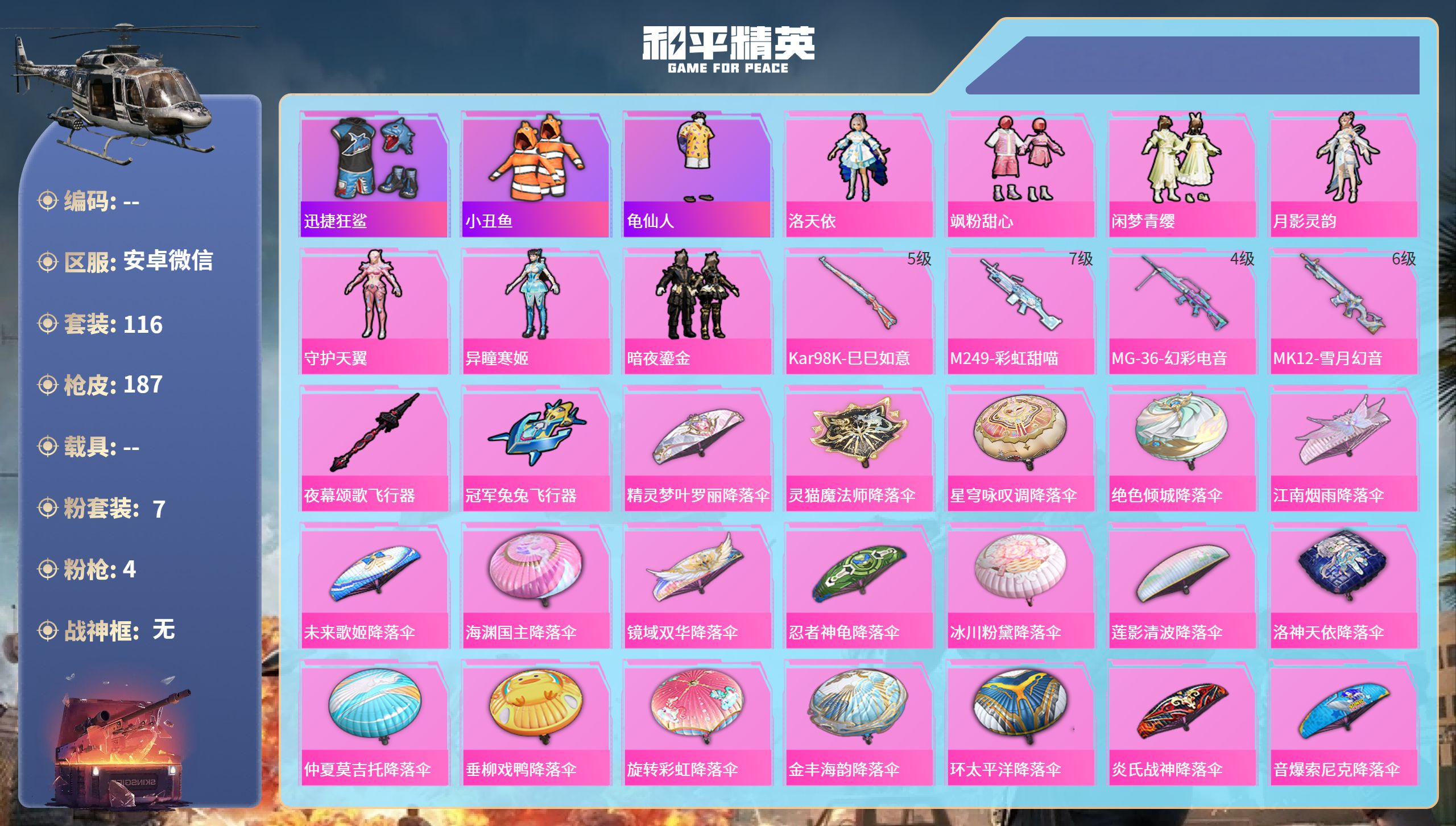 PX_2552175-安卓微信-15王牌印记-7粉装-4特效枪-54813热力值-116套装-187枪皮-6卓越印记-3传奇印记 【7粉装】套装-暗夜鎏金,角色-月影灵韵,套装-闲梦青缨,角色-守护天翼,角色-洛天依,角色-异瞳寒姬,套装-飒粉甜心 【4特效枪】M249-彩虹甜喵/7级,MK12-雪月幻音/6级,Kar98K-巳巳如意/5级,MG-36-幻彩电音/4级 【3稀有紫装】迅捷狂鲨,小丑鱼,龟仙人 【116稀有时装】洛天依,飒粉甜心,闲梦青缨,月影灵韵,守护天翼,异瞳寒姬,暗夜鎏金,龟仙人,小丑鱼,迅捷狂鲨,萌趣咩咩,龙魂突击队,铁血战翼,小熊娃娃,异域银装,先驱飞行员,霜刃之御,摩登魅猫,街头风暴,星途旅人,冰河战士,鱼渊荷华,青团波波,大橘大利,燕燕于飞,海琴烟,战术大师,雏菊兔兔,糖糖葫芦,香桃花海,蝶变,棉花软糖,夜瞳黯灵,游乐,顶瓜瓜,银尘,SS35特训,机械征服者,SS29特训,萝兰蝴蝶,SS31特训,SS33特训,SS32特训,无暇誓言,SS36特训,贝斯之夜,焰鹰斗篷,龙的传人,军刀雅典娜,果汁能量,SS37特训,蝶吟花词,SS28特训,绯格组合,涂山之恋,SS26特训,野性山猫,空岛之星,SS34特训,竞技名士,SS30特训,长空猛禽,特战装甲,旭日情侣,冷焰舞者,惊鸿侠骨,魅力单车,灼焰舞者,云霞荷露,春光漫游,极地朋克,幻世战舞者,特殊使命,青涩时光,牛气满满,娇憨猪猪,冰川特警,麻辣教官,幽夜迷踪,破蛋小黄鸡,快闪甜心,梦幻奶油,酸甜橘柚,竞技达人朋克,玲珑飞花,海岛探路者,霓虹街区,都市魅力,探宝勇士,SS27特训,牛气冲天,情公主,飞行日记,熠彩粉晶,SS19特训,光之冒险,晨曦薄雾,SS20特训,SS21特训,玉兔迎春,深海梦境,SS22特训,SS23特训,飞狐塔尔斯,缤纷果语,莱茵河畔,天籁歌者,幻羽潜行,海盐绵绵冰,老实芭蕉,王牌教练,荣耀,柠萌假日,SS24特训,SS25特训,锦衣飞扬 【187稀有枪械】Kar98K-巳巳如意/5级,M249-彩虹甜喵/7级,MG-36-幻彩电音/4级,MK12-雪月幻音/6级,GROZA-奶油梦幻熊,DBS-乌木金纹,Vector-创世·救赎,蜜獾-精灵梦叶罗丽,S1897-精灵梦叶罗丽,SCAR-L-海盐豹豹,平底锅-精灵梦叶罗丽,GROZA-海盐豹豹,TMP-9-霓彩节奏,野牛-雏菊兔兔,蝎式手枪-金丰海韵,Mk14-冰河战士,平底锅-雏菊兔兔,M762-雏菊兔兔,Mini14-雏菊兔兔,R1895-雏菊兔兔,UZI-冰河战士,M16A4-冰河战士,MK20-H-乌木金纹,Win94-乌木金纹,MK12-乌木金纹,R45-幻彩电音,M24-幻彩电音,蜜獾-乌木金纹,M417-玩趣呆呆,Mini14-绯穹魔姬,短管霰弹-星穹咏叹调,UMP45-海盐豹豹,AKS-74U-乌木金纹,电击枪-喜羊羊与灰太狼,Famas-乌木金纹,信号枪-异瞳寒姬,AKS-74U-鸡智如我,烟雾弹-冰氧夏日,GROZA-荧海星豚,DBS-荧海星豚,SLR-霓彩脉冲,M416-红色方程式,M416-蓝色火焰,M416-糯团青竹,AKM-星兔领航员,AKM-星之彼岸,AKM-彩虹符号,AKM-缤纷海域,AKM-江南烟雨,AKM-龙的传人,SCAR-L-玉兔迎春,SCAR-L-暗夜玫瑰,SCAR-L-炫彩节奏,SCAR-L-粉锦千层,M16A4-幻世战舞者,M16A4-莲影清波,GROZA-2B战斗服款,AUG-耀粉歌者,AUG-天降萌叽,QBZ-洛神天依,QBZ-未来歌姬,M762-彩虹符号,M762-暗夜鎏金,M762-天降萌叽,Mk47-乌木金纹,Mk47-炫光之旅,Mk47-洛神天依,G36C-暗夜玫瑰,AC-VAL-天降萌叽,AC-VAL-闲梦青缨,AC-VAL-快闪甜心,AC-VAL-乌木金纹,蜜獾-天降萌叽,蜜獾-千面幻镜,蜜獾-垂柳戏鸭,蜜獾-娇憨猪猪,Famas-镜域双华,Kar98K-梦幻火箭,Kar98K-王子的夏天,Kar98K-洛神天依,M24-乌木金纹,M24-仲夏莫吉托,M24-炫彩节奏,AWM-天降萌叽,AWM-焰鹰斗篷,AWM-垂柳戏鸭,Win94-夏日绵绵冰,莫辛纳甘-蜜语绒猫,莫辛纳甘-乌木金纹,莫辛纳甘-银碳小老虎,AMR-乌木金纹,AMR-镜光幻境,AMR-妙趣可丽,M200-惊鸿侠骨,SKS-糯团青竹,SKS-未来歌姬,Mini14-旋转彩虹,Mini14-耀粉歌者,Mini14-星夜魔法师,Mk14-乌木金纹,Mk14-是爱神辣,SLR-彩虹符号,SLR-娇憨猪猪,M417-惊鸿侠骨,MK20-H-快闪甜心,MK20-H-莲影清波,UZI-娇憨猪猪,UZI-天降萌叽,UZI-啾咪啾咪,UMP45-涂山之恋,UMP45-夜灯,UMP45-仲夏莫吉托,Vector-生命誓言,Vector-焰鹰斗篷,汤姆逊-天降萌叽,汤姆逊-炫彩节奏,汤姆逊-暗夜鎏金,野牛-青春冒险家,MP5K-乌木金纹,P90-乌木金纹,P90-快闪甜心,P90-玩趣呆呆,S686-彩虹符号,S1897-炫彩节奏,S12K-守护天翼,S12K-幻世战舞者,S12K-娇憨猪猪,S12K-音爆索尼克,DBS-焰鹰斗篷,DBS-歌者泠鸢,AA12-G-萌物绒绒,M249-彩虹符号,M249-糯团青竹,M249-莲影清波,M249-星之彼岸,DP-28-焰鹰斗篷,DP-28-旋转彩虹,DP-28-Alan,Walker潮音版,DP-28-齐天大圣,MG3-惊鸿侠骨,MG3-幻世战舞者,MG3-乌木金纹,MG3-摩登王国,沙漠之鹰-旋转彩虹,沙漠之鹰-快闪甜心,TMP-9-江南烟雨,平底锅-惊鸿侠骨,平底锅-空岛之星,平底锅-光之冒险,平底锅-娇憨猪猪,平底锅-快闪甜心,平底锅-焰鹰斗篷,撬棍-幻世战舞者,战术弩-江南烟雨,爆炸猎弓-鎏金朋克,爆炸猎弓-惊鸿侠骨,破片手榴弹-呆爆全场,M200-罪夜之冕,SPAS-12-罪夜之冕,Kar98K-顶峰精英,沙漠之鹰-未来领航者,AUG-异域银装,MP5K-未来领航者,QBU-未来领航者,AUG-月影灵韵,MK20-H-糖糖葫芦,MK20-H-星途旅人,野牛-燕燕于飞,M200-乌木金纹,SPAS-12-燕燕于飞,蝎式手枪-燕燕于飞,十字弩-异域银装,SCAR-L-星途旅人,蜜獾-糖糖葫芦,UMP45-糖糖葫芦,SPAS-12-乌木金纹,平底锅-糖糖葫芦,Vector-燕燕于飞,十字弩-燕燕于飞,AKS-74U-鬼刀,破片手榴弹-星途旅人,AMR-鬼刀,平底锅-许七安,P18C-糖糖葫芦,VSS-香桃花海,Mini14-香桃花海,P90-巳巳如意 【7稀有飞行器】马上有福飞行器,光之冒险尾迹,空岛之星尾迹,夜幕颂歌飞行器,顶峰精英尾迹,异域银装飞行器,冠军兔兔飞行器 【34稀有背包】赞萌露比背包(3级),垂柳戏鸭背包(3级),绯穹魔姬背包(3级),龟仙人龟壳背包(3级),守护天翼背包(3级),