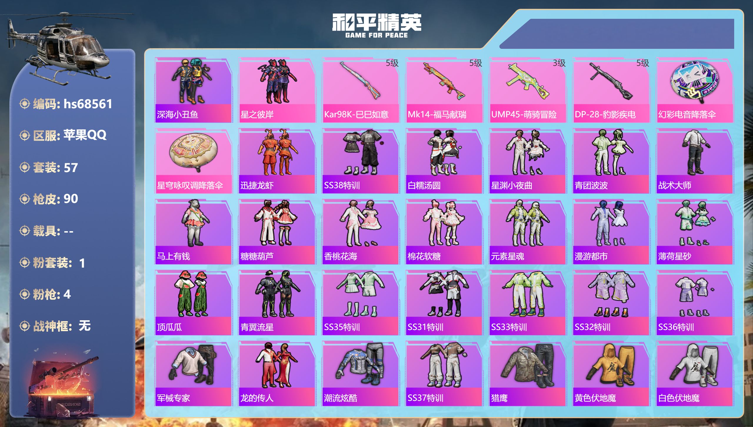 PX_2554316-,苹果手Q-3王牌印记-1粉装-4特效枪-22479热力值-57套装-90枪皮-3卓越印记 【1粉装】套装-星之彼岸 【4特效枪】DP-28-豹影疾电/5级,UMP45-萌骑冒险/3级,Kar98K-巳巳如意/5级,Mk14-福马献瑞/5级 【1稀有紫装】深海小丑鱼 【57稀有时装】星之彼岸,迅捷龙虾,SS38特训,深海小丑鱼,白糯汤圆,星渊小夜曲,青团波波,战术大师,马上有钱,糖糖葫芦,香桃花海,棉花软糖,元素星魂,漫游都市,薄荷星砂,顶瓜瓜,青翼流星,SS35特训,SS31特训,SS33特训,SS32特训,SS36特训,军械专家,龙的传人,潮流炫酷,SS37特训,猎鹰,黄色伏地魔,白色伏地魔,黑色伏地魔,SS34特训,竞技名士,猛禽,SS30特训,魅力单车,极地朋克,甜蜜菠萝,青涩时光,冰川特警,狙击之神,红釉青花,鹰眼刺客,雨过天青,福马献瑞,冰冻风暴,玲珑侠影,幻影武者,破蛋小黄鸡,疯狂小兔子,绮丽涂鸦,竞技达人朋克,海岛探路者,缤纷果语,海盐绵绵冰,老实芭蕉,王牌教练,鹤鸣 【89稀有枪械】Kar98K-巳巳如意/5级,Mk14-福马献瑞/5级,UMP45-萌骑冒险/3级,DP-28-豹影疾电/5级,DBS-乌木金纹,P1911-创世·救赎,SCAR-L-海盐豹豹,MK20-H-乌木金纹,Mini14-鸡智如我,MK12-乌木金纹,蜜獾-乌木金纹,SPAS-12-狂鲨锋刃,MK20-H-狂鲨锋刃,ARX-像素花束,大砍刀-像素花束,破片手榴弹-海盐豹豹,UMP45-海盐豹豹,AKS-74U-乌木金纹,Famas-乌木金纹,Mk14-薄荷星砂,烟雾弹-冰氧夏日,MG-36-薄荷星砂,M24-天降萌叽,S1897-荧海星豚,平底锅-属我最6,AUG-紫晶流影,M416-红色方程式,M416-蓝色火焰,AKM-破晓战魂,AKM-龙的传人,SCAR-L-夜灯,SCAR-L-炫彩节奏,M16A4-幻世战舞者,GROZA-影袭,AUG-天降萌叽,QBZ-彩虹符号,M762-天降萌叽,AC-VAL-天降萌叽,Kar98K-影袭,AWM-天降萌叽,SKS-炫彩节奏,Mini14-耀粉歌者,UZI-炫彩节奏,UZI-红色方程式,UZI-影袭,UZI-天降萌叽,UZI-啾咪啾咪,UMP45-夜灯,Vector-生命誓言,汤姆逊-天降萌叽,MP5K-乌木金纹,P90-玩趣呆呆,S686-红色方程式,S686-生命誓言,S12K-玩趣呆呆,DP-28-彩虹符号,MG3-幻世战舞者,Kar98K-顶峰精英,撬棍-冰晶雪宝,S686-千金淑猫,ACE32-冰晶雪宝,AUG-异域银装,VSS-虎痴许褚,MK20-H-糖糖葫芦,M200-乌木金纹,SCAR-L-星途旅人,大砍刀-鬼刀,蜜獾-糖糖葫芦,UMP45-糖糖葫芦,SPAS-12-乌木金纹,平底锅-糖糖葫芦,AKS-74U-鬼刀,破片手榴弹-星途旅人,M16A4-雨过天青,GROZA-福马献瑞,蜜獾-启元战纹,AMR-雨过天青,SLR-乌木金纹,AA12-G-雨过天青,PKM-雨过天青,沙漠之鹰-雨过天青,燃烧瓶-福马献瑞,P90-紫矿核心,P18C-糖糖葫芦,SPAS-12-福马献瑞,VSS-香桃花海,Mini14-香桃花海,汤姆逊-像素花束,P90-巳巳如意 【3稀有飞行器】马上有福飞行器,破刃行动尾迹,顶峰精英尾迹 【9稀有背包】狂鲨锋刃背包(3级),糖糖葫芦背包(3级),虹云熊熊背包(3级),雪国风尚背包(3级),龙的传人背包(3级),福马献瑞背包(3级),智谋强哥背包(3级),香桃花海背包(3级),精灵梦叶罗丽背包(3级) 【19稀有降落伞】SS36王牌降落伞,幻彩电音降落伞,狂鲨锋刃降落伞,星穹咏叹调降落伞,会说话的汤姆猫降落伞,雨过天青降落伞,福马献瑞降落伞,野性觉醒降落伞,绒兔团圆降落伞,钢铁雄心降落伞,绚烂橙彩降落伞,普通降落伞,星途旅人降落伞,SS30王牌降落伞,糖糖葫芦降落伞,香桃花海降落伞,电竞之星降落伞,蓝海之火降落伞,幻世战舞者降落伞 【10稀有头盔】狂鲨锋刃头盔(3级),喜羊羊与灰太狼头盔(3级),环太平洋头盔(3级),糖糖葫芦头盔(3级),千金淑猫头盔(3级),海盐豹豹头盔(3级),荒原烈焰头盔(3级),福马献瑞头盔(3级),玉兔迎春头盔(3级),香桃花海头盔(3级)