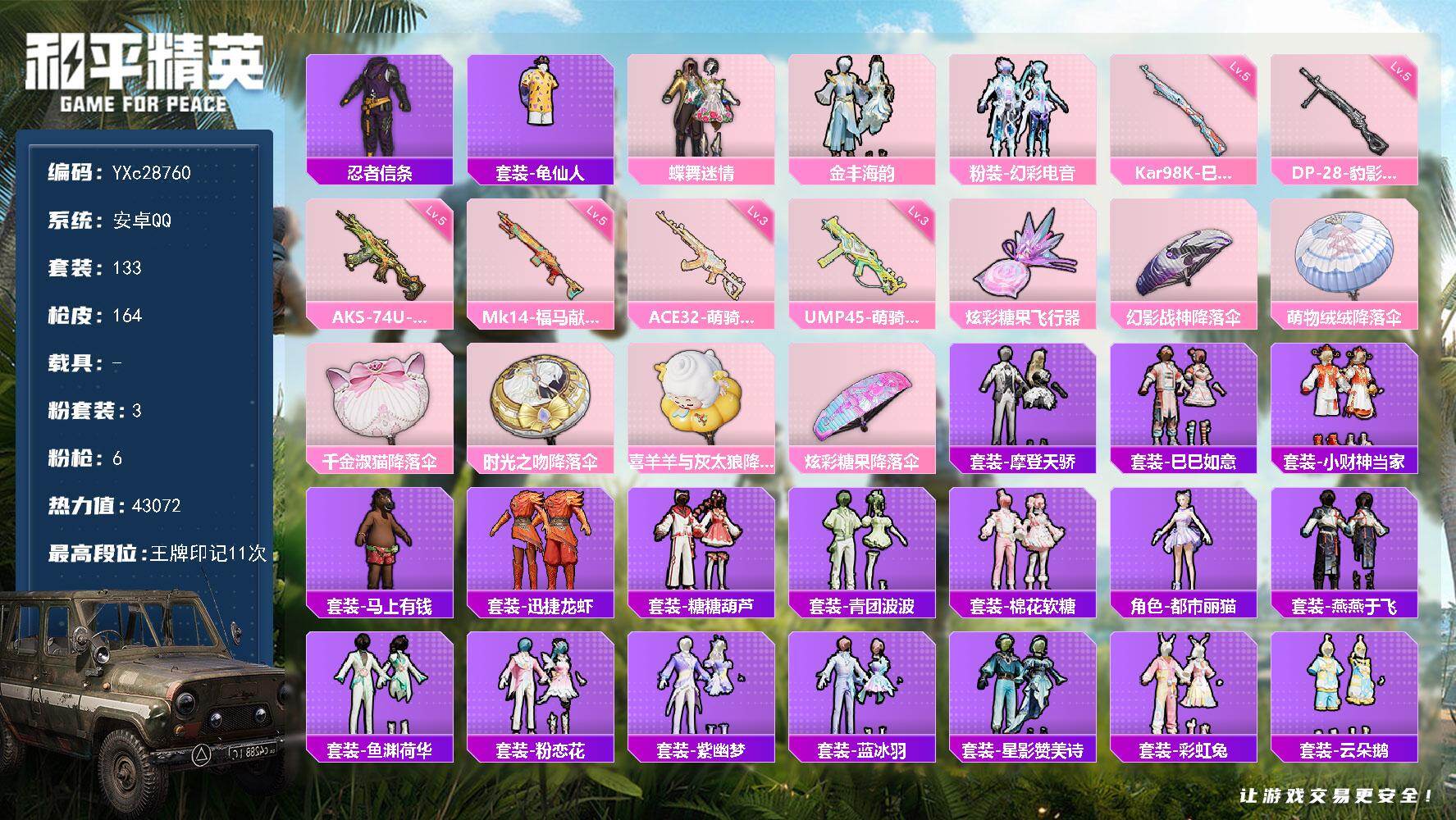 PX_2549847-??铁天赋】YXc28760-【可二次】【因赛季更新游戏段付以上号为准!】 ,安卓Q-3粉装6特效枪5热门133套装164枪皮,,11印记,历史传奇王牌10星, 【3粉装】,蝶舞迷情,金丰海韵,幻彩电音, 【6特效枪】,AKS-74U-森灵之息,(5级),Kar98K-巳巳如意,(5级),DP-28-豹影疾电,(5级),Mk14-福马献瑞,(5级),UMP45-萌骑冒险,(3级),ACE32-萌骑漫游,(3级), 【5热门】,龟仙人,鹰眼刺客,忍者信条,漫步者,破蛋小黄鸡, 【1头盔】,幻影战神头盔, 【1背包】,幻影战神背包,