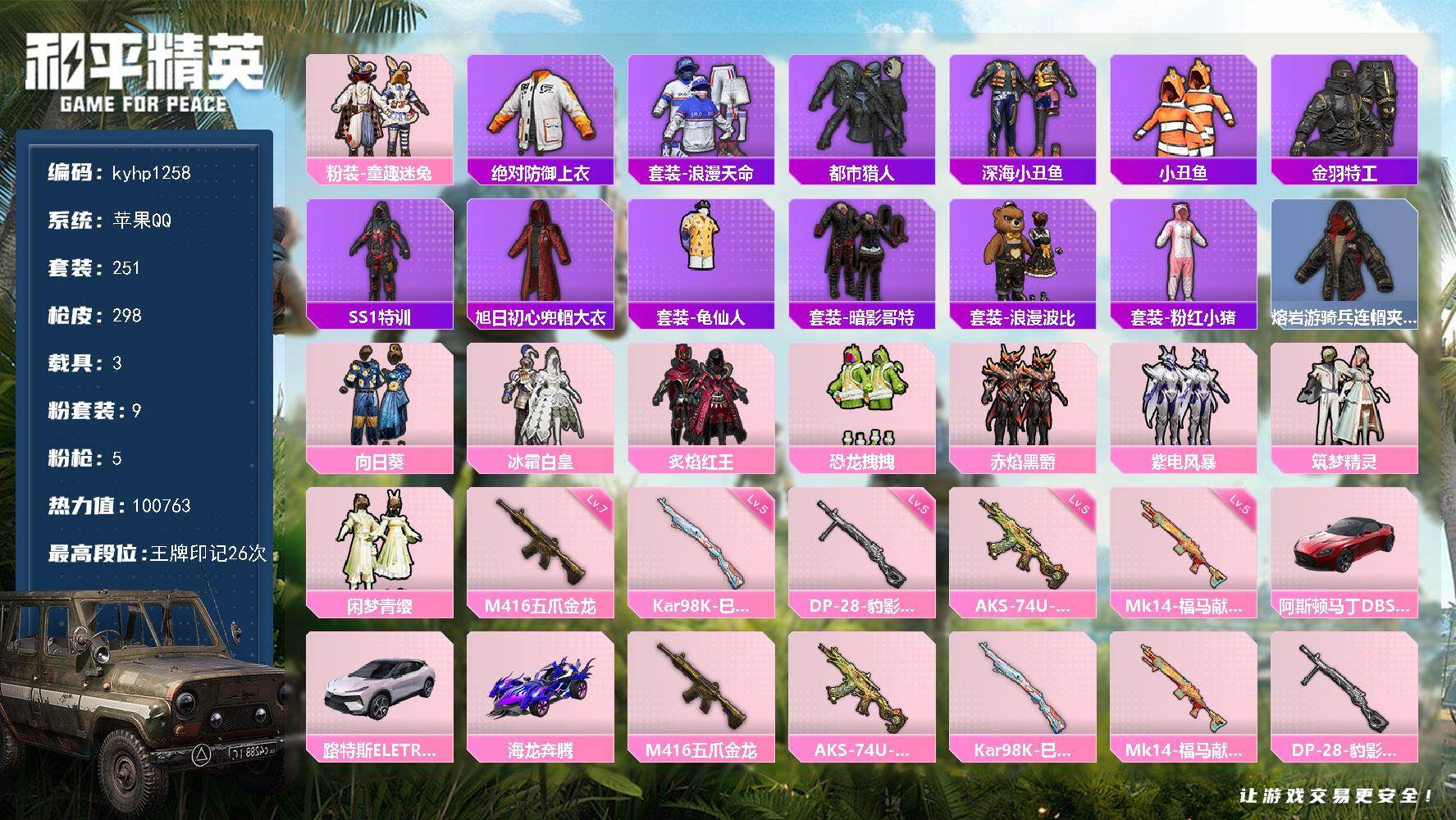 PX_2549843--9粉装-5特效枪-3载具-3粉色飞行器-100763热力值-26王牌印记-251套装-298枪皮 【热门品类】:粉装-童趣迷兔,绝对防御上衣,套装-浪漫天命,套装-都市猎人,套装-深海小丑鱼,套装-小丑鱼,套装-金羽特工,套装-SS1特训,旭日初心兜帽大衣,套装-龟仙人,套装-暗影哥特,套装-浪漫波比,套装-粉红小猪,熔岩游骑兵连帽夹克 【粉色套装】:粉装-向日葵,粉装-冰霜白皇,