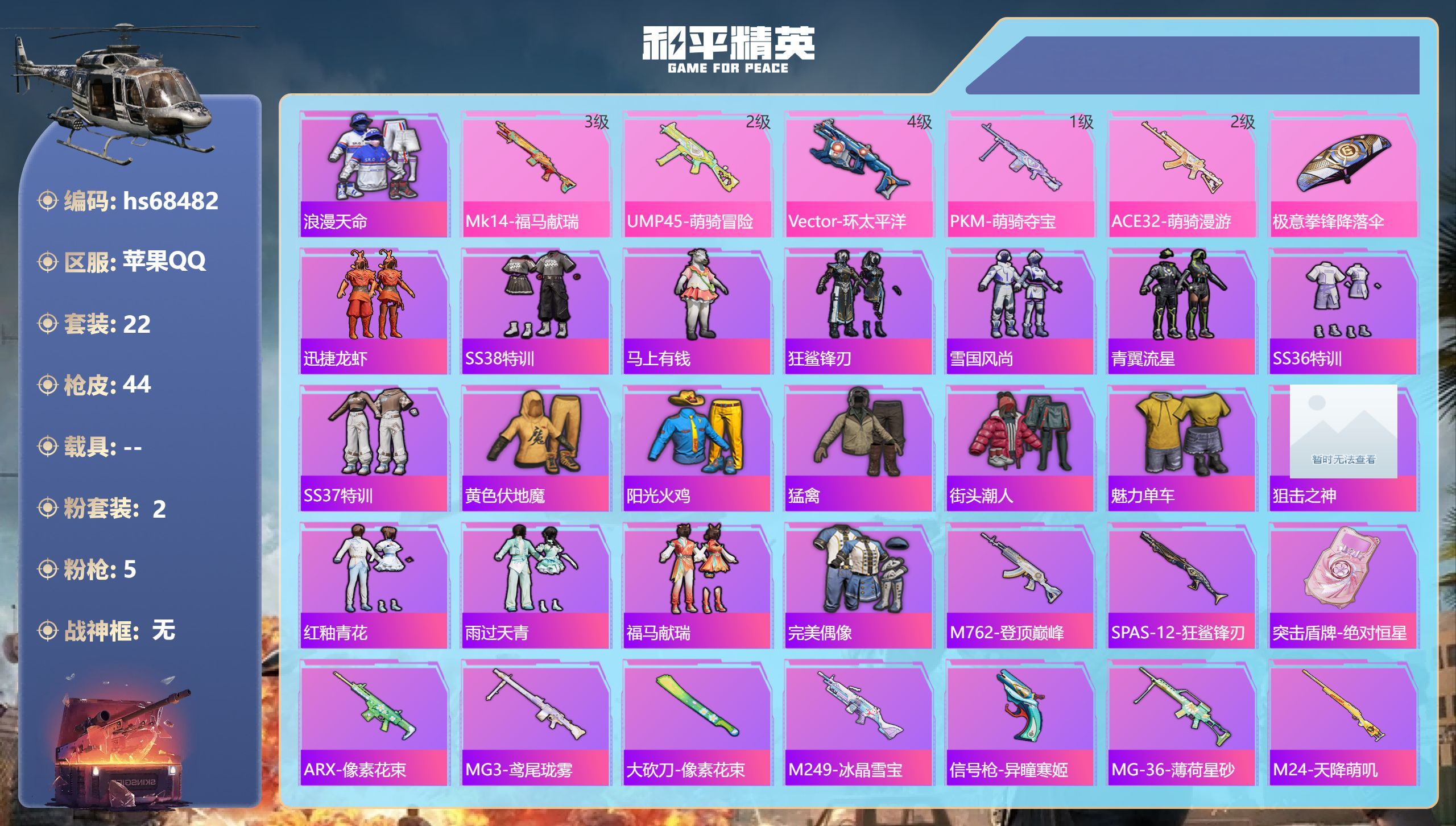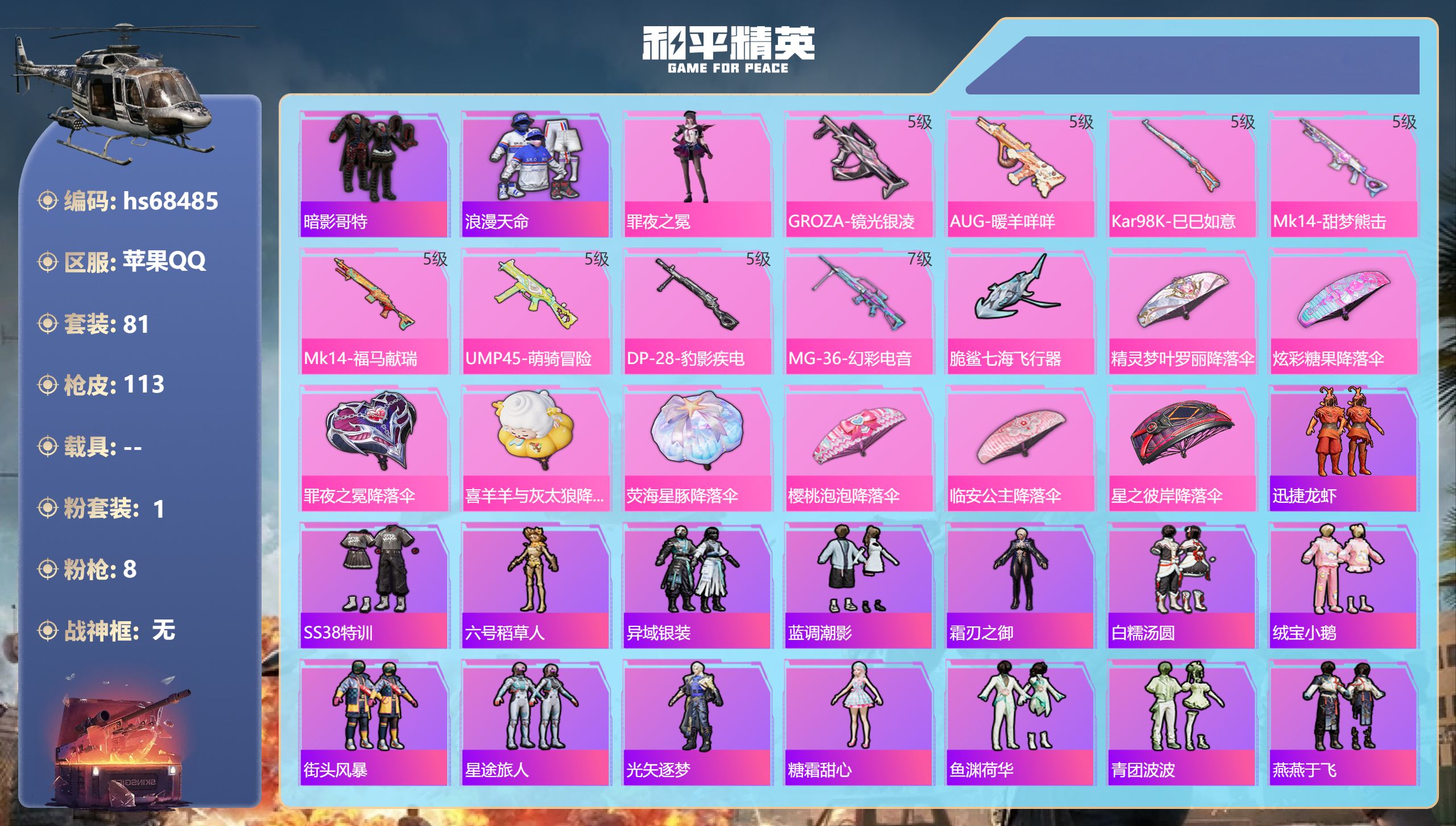 PX_2553772-,苹果手Q-8王牌印记-1粉装-8特效枪-30445热力值-81套装-113枪皮-1卓越印记 【1粉装】角色-罪夜之冕 【8特效枪】Mk14-甜梦熊击/5级,UMP45-萌骑冒险/5级,AUG-暖羊咩咩/5级,MG-36-幻彩电音/7级,GROZA-镜光银凌/5级,Kar98K-巳巳如意/5级,DP-28-豹影疾电/5级,Mk14-福马献瑞/5级 【2稀有紫装】暗影哥特,浪漫天命 【80稀有时装】罪夜之冕,迅捷龙虾,SS38特训,六号稻草人,浪漫天命,暗影哥特,异域银装,蓝调潮影,霜刃之御,白糯汤圆,绒宝小鹅,街头风暴,星途旅人,光矢逐梦,糖霜甜心,鱼渊荷华,青团波波,燕燕于飞,NV战队服,战术大师,智谋强哥,马上有钱,糖糖葫芦,小狗蛇点点,香桃花海,巳巳如意,粉恋花,棉花软糖,狂鲨锋刃,云魄琉璃,萌鸡速递,元气之梦,薄荷星砂,顶瓜瓜,雪国风尚,蓝冰羽,恋语绒绒,青翼流星,紫幽梦,SS35特训,SS31特训,SS33特训,SS32特训,SS36特训,龙的传人,潮流炫酷,智慧之神,SS37特训,黄色运动,白色伏地魔,阳光火鸡,麦兜,黑色伏地魔,SS34特训,竞技名士,深蓝色名流,SS30特训,长空猛禽,旭日情侣,街头潮人,冷焰舞者,魅力单车,灼焰舞者,浪漫假日,战地督导,春日漫步,狙击之神,红釉青花,雨过天青,福马献瑞,幻影武者,凛冬战士,蓝彩潮人,绮丽涂鸦,海岛探路者,核芯基因,团圆交子,夏日倾情,王牌教练,柠萌假日 【113稀有枪械】GROZA-镜光银凌/5级,AUG-暖羊咩咩/5级,Kar98K-巳巳如意/5级,Mk14-甜梦熊击/5级,Mk14-福马献瑞/5级,UMP45-萌骑冒险/5级,DP-28-豹影疾电/5级,MG-36-幻彩电音/7级,MK20-H-乌木金纹,Mini14-鸡智如我,Win94-乌木金纹,MK12-乌木金纹,PKM-紫幽梦,MG3-霓彩脉冲,Mk14-紫幽梦,蜜獾-乌木金纹,S1897-紫幽梦,P92-紫幽梦,SPAS-12-狂鲨锋刃,M417-玩趣呆呆,MK20-H-狂鲨锋刃,铝热弹-炫彩糖果,ARX-像素花束,大砍刀-像素花束,M249-冰晶雪宝,平底锅-紫幽梦,AKS-74U-乌木金纹,AKM-涂鸦街区,爆炸猎弓-喜羊羊与灰太狼,AMR-喜羊羊与灰太狼,Famas-乌木金纹,Famas-霓彩脉冲,M249-无面战甲,破片手榴弹-拽到爆炸,S1897-糯团青竹,Mk14-薄荷星砂,AKS-74U-鸡智如我,烟雾弹-冰氧夏日,AKS-74U-粉粉喵呜,MG-36-薄荷星砂,PKM-啾咪啾咪,爆炸猎弓-雪月幻音,SLR-霓彩脉冲,平底锅-属我最6,SCAR-L-彩虹符号,P1911-无面战甲,AUG-紫晶流影,S12K-霓彩脉冲,AMR-鸡智如我,AKM-霓彩脉冲,M416-红色方程式,AKM-破晓战魂,AKM-龙的传人,SCAR-L-夜灯,AUG-耀粉歌者,M762-彩虹符号,M762-天降萌叽,UZI-红色方程式,UMP45-夜灯,P90-玩趣呆呆,S686-彩虹符号,S12K-夜灯,DBS-彩虹符号,M249-糯团青竹,电击枪-辉云木星,Kar98K-顶峰精英,撬棍-冰晶雪宝,MG3-火熔核心,JS9-蓝晶绮麟,AC-VAL-荒原烈焰,ACE32-冰晶雪宝,AUG-异域银装,MP5K-未来领航者,UMP45-绒宝小鹅,汤姆逊-樱桃泡泡,MK20-H-糖糖葫芦,野牛-燕燕于飞,M200-乌木金纹,SPAS-12-燕燕于飞,蝎式手枪-燕燕于飞,十字弩-异域银装,SCAR-L-星途旅人,S686-巳巳如意,蜜獾-糖糖葫芦,UMP45-糖糖葫芦,SPAS-12-乌木金纹,平底锅-糖糖葫芦,Vector-燕燕于飞,十字弩-燕燕于飞,破片手榴弹-星途旅人,AMR-鬼刀,M16A4-雨过天青,GROZA-福马献瑞,蜜獾-启元战纹,AMR-雨过天青,PKM-小狗蛇点点,SLR-乌木金纹,P1911-小狗蛇点点,AA12-G-雨过天青,PKM-雨过天青,沙漠之鹰-雨过天青,平底锅-许七安,MG3-蓝晶绮麟,P90-紫矿核心,P18C-糖糖葫芦,SCAR-L-小狗蛇点点,VSS-香桃花海,Mini14-香桃花海,汤姆逊-像素花束,P90-巳巳如意,破片手榴弹-巳巳如意,M416-绿洲时空,MG3-火熔核心 【6稀有飞行器】狂鲨锋刃飞行器,马上有福飞行器,鸡智如我飞行器,脆鲨七海飞行器,顶峰精英尾迹,异域银装飞行器 【14稀有背包】狂鲨锋刃背包(3级),炫彩糖果背包(3级),喜羊羊与灰太狼背包(3级),紫幽梦背包(3级),萌鸡速递背包(3级),薄荷星砂背包(3级),巳巳如意背包(3级),糖糖葫芦背包(3级),异域银装背包(3级),雪国风尚背包(3级),临安公主背包(3级),福马献瑞背包(3级),智谋强哥背包(3级),香桃花海背包(3级) 【39稀有降落伞】精灵梦叶罗丽降落伞,SS35王牌降落伞,SS36王牌降落伞,SS32王牌降落伞,属我最6降落伞,炫彩糖果降落伞,萌萌史莱姆降落伞,狂鲨锋刃降落伞,雨过天青降落伞,罪夜之冕降落伞,紫幽梦降落伞,SS34王牌降落伞,喜羊羊与灰太狼降落伞,百战成名降落伞,SS33王牌降落伞,竞逐热浪降落伞,一举夺葵降落伞,荧海星豚降落伞,野性觉醒降落伞,巳巳如意降落伞,绚烂橙彩降落伞,普通降落伞,化学天才降落伞,闻鸡启五降落伞,樱桃泡泡降落伞,星途旅人降落伞,异域银装降落伞,燕燕于飞降落伞,SS31王牌降落伞,镭金极速降落伞,小狗蛇点点降落伞,临安公主降落伞,SS30王牌降落伞,糖糖葫芦降落伞,香桃花海降落伞,勇者同行降落伞,星之彼岸降落伞,电竞之星降落伞,幻世战舞者降落伞 【17稀有头盔】甜蜜菠萝头盔(3级),雪国风尚头盔(3级),狂鲨锋刃头盔(3级),炫彩糖果头盔(3级),紫幽梦头盔(3级),喜羊羊与灰太狼头盔(3级),薄荷星砂头盔(3级),粉黛兰香头盔(3级),萌鸡速递头盔(3级),巳巳如意头盔(3级),糖糖葫芦头盔(3级),异域银装头盔(3级),月影灵韵头盔(3级),深海小丑鱼头盔(3级),福马献瑞头盔(3级),香桃花海头盔(3级),绒兔团圆头盔(3级)