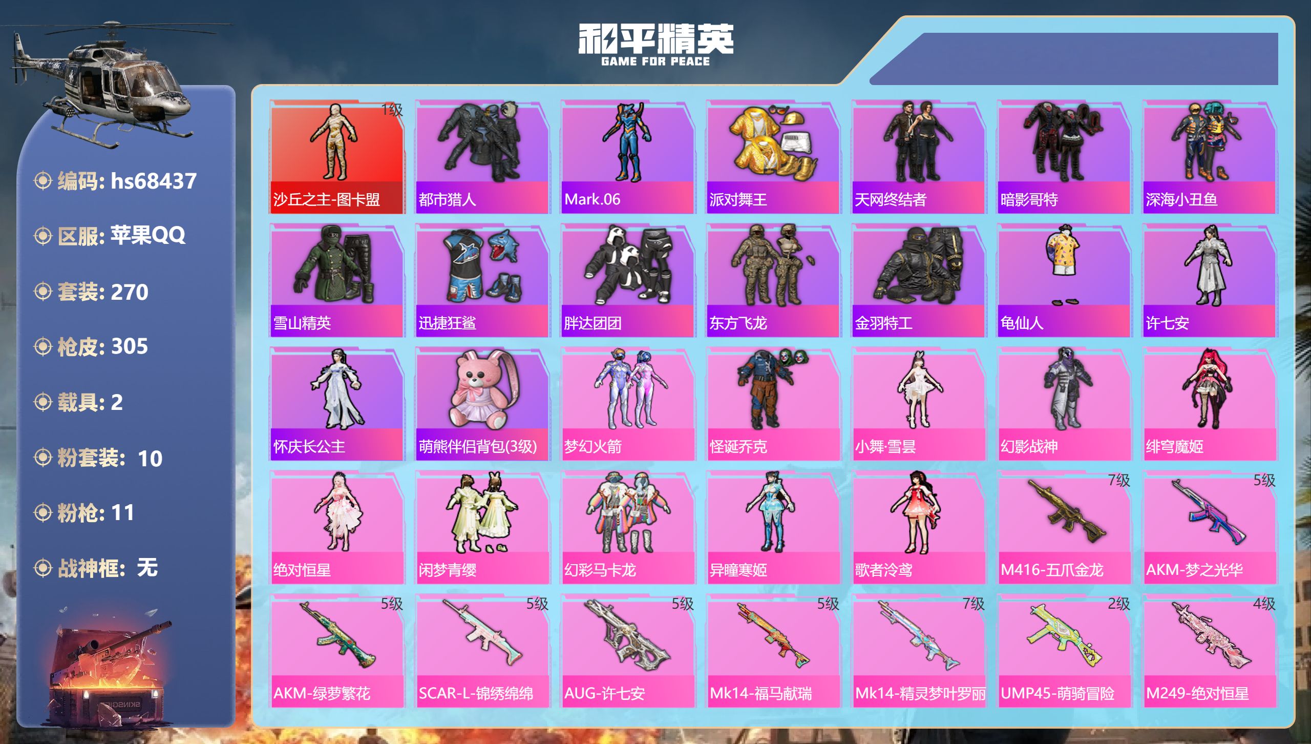 PX_2554186-,苹果手Q-5王牌印记-7粉装-14特效枪-52914热力值-107套装-184枪皮-3卓越印记-2传奇印记 【7粉装】套装-宝贝奶油派,角色-绯穹魔姬,套装-甜心巧克力,角色-烬夜之誓,套装-天使彩虹糖,套装-幻影战神,角色-冷漠罗丽 【14特效枪】DP-28-豹影疾电/5级,SCAR-L-魔童闹海,哪吒/3级,ACE32-萌骑漫游/4级,M24-镜域双华/3级,AKS-74U-森灵之息/5级,GROZA-镜光银凌/5级,MG-36-沧焰双生/5级,Kar98K-巳巳如意/5级,M416-风花雪月/7级,Mk14-福马献瑞/5级,Mk14-甜梦熊击/5级,AUG-暖羊咩咩/5级,AA12-G-萌骑幻想/3级,汤姆逊-热量炸弹/5级 【4稀有紫装】都市猎人,派对舞王,浪漫天命,小丑鱼 【107稀有时装】甜心巧克力,宝贝奶油派,天使彩虹糖,烬夜之誓,幻影战神,绯穹魔姬,冷漠罗丽,迅捷龙虾,SS38特训,都市猎人,浪漫天命,小丑鱼,派对舞王,狂沙舞者,花面小丑,异域银装,白糯汤圆,星渊小夜曲,霜纹水星,鱼渊荷华,大橘大利,燕燕于飞,战术大师,智谋强哥,馥郁金蕊,马上有钱,晶辉守护,墨青刃影,巳巳如意,粉恋花,午间小调,彩虹兔,时希公主,琴音绮想,乐音,灵公主,夜幕侵蚀,雪绒豹,画境星梦,乐游熊熊,朱霞炽焰,狂鲨锋刃,懒羊羊,凌霄紫焰,粉黛兰香,擎苍青焰,炫彩糖果,绯色魅影,萌鸡速递,元气之梦,书海巡游,风迹短诗,圣穹绘梦,诡诞巡游,错位像素,蜜露汐语,薄荷星砂,秘语星愿,云朵鹅,顶瓜瓜,雪国风尚,白辉玉蕊,蓝冰羽,恋语绒绒,青翼流星,紫幽梦,新风雅兰,SS35特训,SS31特训,SS33特训,SS32特训,SS36特训,军械专家,龙的传人,SS37特训,红色运动,蓝色运动,白色伏地魔,黄色名流,漫步者,黑色伏地魔,SS34特训,竞技名士,猛禽,长空猛禽,特战装甲,旭日情侣,街头潮人,魅力单车,浪漫假日,狙击之神,红釉青花,鹰眼刺客,雨过天青,福马献瑞,冰冻风暴,玲珑侠影,完美偶像,破蛋小黄鸡,暗金炫舞,海岛探路者,森林游猎者,奈斯,弄潮海豚,夏日倾情,缤纷果语,天籁歌者 【185稀有枪械】SCAR-L-魔童闹海,哪吒/3级,M24-镜域双华/3级,M416-风花雪月/7级,GROZA-镜光银凌/5级,AUG-暖羊咩咩/5级,Kar98K-巳巳如意/5级,Mk14-甜梦熊击/5级,Mk14-福马献瑞/5级,汤姆逊-热量炸弹/5级,DP-28-豹影疾电/5级,ACE32-萌骑漫游/4级,MG-36-沧焰双生/5级,AA12-G-萌骑幻想/3级,AKS-74U-森灵之息/5级,SLR-墨龙九天,SCAR-L-海盐豹豹,短管霰弹-圣域龙灵,DBS-风迹短诗,莫辛纳甘-风迹短诗,Mini14-鸡智如我,M416-错位像素,AKM-绿洲时空,Win94-乌木金纹,MK12-风迹短诗,MK12-乌木金纹,F57-魔童闹海,敖闰,SVD-冷漠罗丽,撬棍-冷漠罗丽,烟雾弹-冰澜龙吟,破片手榴弹-爆破雪人,PKM-紫幽梦,MG3-霓彩脉冲,DBS-幻彩电音,QBU-夜幕侵蚀,ACE32-画境星梦,SCAR-L-冷漠罗丽,M1加兰德-画境星梦,MP5K-画境星梦,Mk14-幻星舰长,Mk14-紫幽梦,蜜獾-乌木金纹,M762-云朵鹅,S1897-紫幽梦,SVD-云朵鹅,P92-紫幽梦,蜜獾-绯穹魔姬,AWM-绿洲时空,汤姆逊-错位像素,SPAS-12-狂鲨锋刃,M417-玩趣呆呆,MK20-H-狂鲨锋刃,AUG-冰晶雪宝,铝热弹-炫彩糖果,UZI-炫彩糖果,UMP45-绿洲时空,M416-萌萌史莱姆,M249-萌萌史莱姆,AA12-G-画境星梦,平底锅-画境星梦,M249-冰晶雪宝,SKS-乐游熊熊,Mk47-风迹短诗,JS9-凌霄紫焰,MG-36-凌霄紫焰,平底锅-紫幽梦,燃烧瓶-甜梦桃焰,破片手榴弹-海盐豹豹,UMP45-海盐豹豹,ARX-凌霄紫焰,AKS-74U-乌木金纹,AKM-涂鸦街区,蜜獾-风迹短诗,P92-凌霄紫焰,SCAR-L-乐游熊熊,Famas-乌木金纹,Famas-霓彩脉冲,SPAS-12-云朵鹅,破片手榴弹-拽到爆炸,十字弩-异瞳寒姬,UMP45-夜幕侵蚀,S1897-糯团青竹,平底锅-无垠阁,信号枪-异瞳寒姬,平底锅-凌霄紫焰,Mk14-薄荷星砂,沙漠之鹰-云朵鹅,烟雾弹-冰氧夏日,AKS-74U-粉粉喵呜,MG3-智耀战神,Mk14-紫晶流影,MG-36-薄荷星砂,SCAR-L-绿洲时空,蜜獾-青瓷战姬,大砍刀-云朵鹅,PKM-啾咪啾咪,沙漠之鹰-圣穹绘梦,M24-天降萌叽,M200-爆裂游戏,SVD-霓彩脉冲,SLR-霓彩脉冲,平底锅-属我最6,SCAR-L-彩虹符号,蜜獾-绿洲时空,S12K-霓彩脉冲,Kar98k-最终圣卫者,AMR-鸡智如我,AKM-霓彩脉冲,AKM-影袭,AKM-江南烟雨,SCAR-L-夜灯,M16A4-幻世战舞者,GROZA-影袭,AUG-甜蜜菠萝,QBZ-彩虹符号,M762-甜心宝贝,Kar98K-影袭,M24-影袭,SKS-金玉无双,Mini14-金玉无双,UZI-影袭,UZI-天降萌叽,UZI-啾咪啾咪,UMP45-生命誓言,UMP45-夜灯,Vector-生命誓言,P90-玩趣呆呆,S686-彩虹符号,S12K-夜灯,DBS-彩虹符号,M249-星之彼岸,DP-28-甜心宝贝,MG3-幻世战舞者,MG3-镜域双华,平底锅-激战未来,撬棍-甜心宝贝,M200-罪夜之冕,SPAS-12-罪夜之冕,撬棍-冰晶雪宝,DBS-绿洲时空,MG3-火熔核心,F57-灵驹仙姬,Win94-晶梦幻蝶,ACE32-冰晶雪宝,燃点复合弓-罪夜之冕,突击盾牌-虎痴许褚,AUG-异域银装,莫辛纳甘-辉光之愿,VSS-虎痴许褚,JS9-辉云木星,MK20-H-樱桃泡泡,DBS-辉云木星,野牛-燕燕于飞,M200-乌木金纹,SPAS-12-燕燕于飞,蝎式手枪-燕燕于飞,十字弩-异域银装,M16A4-极夜星羊,S686-巳巳如意,P90-金蛇镇世,SPAS-12-乌木金纹,Vector-燕燕于飞,十字弩-燕燕于飞,大砍刀-盛世惊鸿,M16A4-雨过天青,GROZA-福马献瑞,蜜獾-启元战纹,AMR-雨过天青,PKM-小狗蛇点点,SLR-乌木金纹,AA12-G-雨过天青,PKM-雨过天青,沙漠之鹰-雨过天青,燃烧瓶-福马献瑞,P90-紫矿核心,GROZA-紫矿核心,SPAS-12-福马献瑞,Vector-荒原烈焰,S12K-蓝晶绮麟,Mini14-香桃花海,S12K-辉光之愿,汤姆逊-像素花束,P90-巳巳如意,破片手榴弹-巳巳如意,DBS-绿洲时空,MG3-火熔核心 【13稀有飞行器】沙丘之主天马/1级,雀灵庇佑飞行器,幻星舰长飞行器,狂鲨锋刃飞行器,马上有福飞行器,暮色之舞飞行器/1级,鸡智如我飞行器,炫彩糖果飞行器,登顶巅峰飞行器,破刃行动尾迹,提桶跑路飞