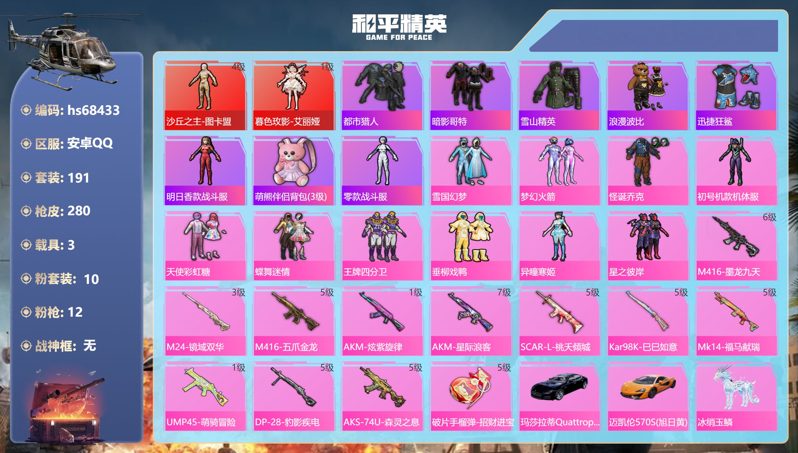 PX_2553925-,安卓手Q-7王牌印记-2红装-10粉装-12特效枪-3载具-99637热力值-191套装-280枪皮-1卓越印记 【2红装】暮色玫影-艾丽娅/1级,沙丘之主-图卡盟/4级 【10粉装】套装-梦幻火箭,套装-天使彩虹糖,套装-蝶舞迷情,套装-星之彼岸,套装-雪国幻梦,套装-垂柳戏鸭,角色-异瞳寒姬,角色-初号机款机体服,套装-王牌四分卫,套装-怪诞乔克 【12特效枪】DP-28-豹影疾电/5级,AKM-星际浪客/7级,AKM-炫紫旋律/1级,AKS-74U-森灵之息/5级,Mk14-福马献瑞/5级,UMP45-萌骑冒险/1级,M416-五爪金龙/5级,SCAR-L-桃夭倾城/5级,M24-镜域双华/3级,Kar98K-巳巳如意/5级,M416-墨龙九天/6级,破片手榴弹-招财进宝/5级 【8稀有紫装】都市猎人,暗影哥特,雪山精英,浪漫波比,迅捷狂鲨,明日香款战斗服,萌熊伴侣背包(3级),零款战斗服 【3稀有载具】玛莎拉蒂Quattroporte(夜幕蓝),迈凯伦570S(旭日黄),冰绡玉鳞 【190稀有时装】图卡盟/4级,艾丽娅/1级,雪国幻梦,梦幻火箭,怪诞乔克,初号机款机体服,天使彩虹糖,蝶舞迷情,王牌四分卫,垂柳戏鸭,异瞳寒姬,星之彼岸,迅捷龙虾,SS38特训,都市猎人,雪山精英,暗影哥特,迅捷狂鲨,零款战斗服,明日香款战斗服,浪漫波比,暗夜行者,萌趣咩咩,红熊茄茄,海上生明月,龙魂突击队,异域银装,幸运青,摩登魅猫,街头风暴,星途旅人,青团波波,战术大师,怪笑疯兔,雏菊兔兔,马上有钱,糖糖葫芦,巳巳如意,午间小调,琴音绮想,画境星梦,朱霞炽焰,狂鲨锋刃,阳光菠萝,美羊羊,凌霄紫焰,擎苍青焰,萌鸡速递,元气之梦,书海巡游,风迹短诗,漫游都市,薄荷星砂,秘语星愿,蓝海鲸歌,雪国风尚,青翼流星,SS35特训,机械英豪,机械征服者,SS29特训,萝兰蝴蝶,SS31特训,SS33特训,SS32特训,SS16特训,暴风机械师,时空追击者,超人强,SS36特训,红酒骑士,福星高照,暗夜契约,纯白誓言,龙的传人,智慧之神,白熊同盟,萌黄之夏,SS37特训,SS28特训,超能拳王,猎鹰,黄色运动,阳光火鸡,绯格组合,SS26特训,漫步者,空岛之星,黎明保卫者,SS34特训,骑行爱好者,竞技名士,蓝色守护者,雨林探路者,SS30特训,长空猛禽,竞技勇士朋克,特战装甲,灰色格斗者,甜蜜告白,街头潮人,怒火燎原,魅力单车,春光漫游,夜莺强袭者,丛林猎人,传奇侦探,幻世战舞者,战地督导,牛气满满,娇憨猪猪,冰川特警,龙腾端午,夏雨游龙,燃烧卡路里,荷畔雨呱,狙击之神,红釉青花,麻辣教官,鹰眼刺客,雨过天青,福马献瑞,冰冻风暴,完美偶像,SS11特训,青春冒险家,破蛋小黄鸡,潮流游乐家,疯狂小兔子,朱雀圣者,快闪甜心,白虎圣者,北国孤狼,SS6特训,拳皇97草薙京,炽焰拳师,格斗专家,星光纪元,奇迹天团,淡雅花蕊,玲珑飞花,原初圣火,逆风勇士,海岛探路者,跃动心情,核芯基因,精神漫游,和煦暖阳,霓虹街区,田园牧歌,萌趣颜团子,轻风白浪,SS10特训,特种颜团子,耀粉歌者,探宝勇士,星夜迷魅,琉璃情波,SS12特训,SS27特训,牛气冲天,迅捷之星,治愈之星,科技之星,飞行日记,熠彩粉晶,光之冒险,SS20特训,SS21特训,玉兔迎春,SS22特训,SS23特训,呆萌铁蟹,甜蜜熊情侣,缤纷果语,SS14特训,迪迦奥特曼,艾克斯奥特曼,幻彩翩翩,吉莉礼服,王牌教练,柠萌假日,粉红小猪,微雨春柳,鹤鸣,快乐星愿,星梦畅游,蝎王蛇后,SS15特训,舞夜骑士 【281稀有枪械】M416-墨龙九天/6级,M24-镜域双华/3级,M416-五爪金龙/5级,AKM-炫紫旋律/1级,AKM-星际浪客/7级,SCAR-L-桃夭倾城/5级,Kar98K-巳巳如意/5级,Mk14-福马献瑞/5级,UMP45-萌骑冒险/1级,DP-28-豹影疾电/5级,AKS-74U-森灵之息/5级,破片手榴弹-招财进宝/5级,DBS-乌木金纹,Famas-墨龙九天,SLR-墨龙九天,野牛-雏菊兔兔,平底锅-雏菊兔兔,M762-雏菊兔兔,Mini14-雏菊兔兔,R1895-雏菊兔兔,UZI-冰河战士,MK20-H-乌木金纹,DBS-风迹短诗,莫辛纳甘-风迹短诗,Mini14-鸡智如我,AKM-绿洲时空,Win94-乌木金纹,MK12-风迹短诗,MK12-乌木金纹,烟雾弹-冰澜龙吟,破片手榴弹-爆破雪人,ACE32-画境星梦,M1加兰德-画境星梦,MP5K-画境星梦,M762-登顶巅峰,蜜獾-绯穹魔姬,AWM-绿洲时空,SPAS-12-狂鲨锋刃,MK20-H-狂鲨锋刃,AUG-冰晶雪宝,突击盾牌-绝对恒星,铝热弹-炫彩糖果,UZI-炫彩糖果,ARX-像素花束,大砍刀-像素花束,AA12-G-画境星梦,平底锅-画境星梦,M249-冰晶雪宝,Mk47-风迹短诗,JS9-凌霄紫焰,MG-36-凌霄紫焰,ARX-凌霄紫焰,AKS-74U-乌木金纹,AKM-涂鸦街区,电击枪-喜羊羊与灰太狼,蜜獾-风迹短诗,爆炸猎弓-喜羊羊与灰太狼,P92-凌霄紫焰,AMR-喜羊羊与灰太狼,Famas-乌木金纹,Famas-霓彩脉冲,破片手榴弹-拽到爆炸,平底锅-无垠阁,平底锅-凌霄紫焰,Mk14-薄荷星砂,AKS-74U-鸡智如我,MG-36-薄荷星砂,SCAR-L-绿洲时空,SVD-霓彩脉冲,SLR-霓彩脉冲,蜜獾-冰澜龙吟,大砍刀-冰澜龙吟,AUG-紫晶流影,S12K-霓彩脉冲,AMR-鸡智如我,AKM-霓彩脉冲,撬棍-火尖枪,M416-潮汐统领,M416-乌木金纹,M416-糯团青竹,M416-暗夜行者,AKM-影袭,AKM-夜灯,AKM-乌木金纹,AKM-星之彼岸,AKM-彩虹符号,AKM-春暖花开,AKM-龙的传人,AKM-灼热熔岩,AKM-萌趣颜团子,SCAR-L-玉兔迎春,SCAR-L-乌木金纹,SCAR-L-夜灯,SCAR-L-炫彩节奏,M16A4-机械英豪,M16A4-幻世战舞者,M16A4-魔法学院,M16A4-乌木金纹,GROZA-春暖花开,GROZA-黑色刀锋,GROZA-影袭,GROZA-田园牧歌,GROZA-彩虹符号,GROZA-治愈之星,AUG-纯梦嫁纱,AUG-冰川粉黛,AUG-青春冒险家,AUG-海螺星光,QBZ-原初圣火,QBZ-相思残雪,QBZ-彩虹符号,M762-拳皇97,M762-乌木金纹,M762-牛气冲天,M762-天降萌叽,Mk47-乌木金纹,Mk47-妙红点点,Mk47-洛神天依,Mk47-青春冒险家,G36C-镜域双华,G36C-时空追击者,AC-VAL-天降萌叽,AC-VAL-快闪甜心,蜜獾-天降萌叽,蜜獾-垂柳戏鸭,蜜獾-桃夭