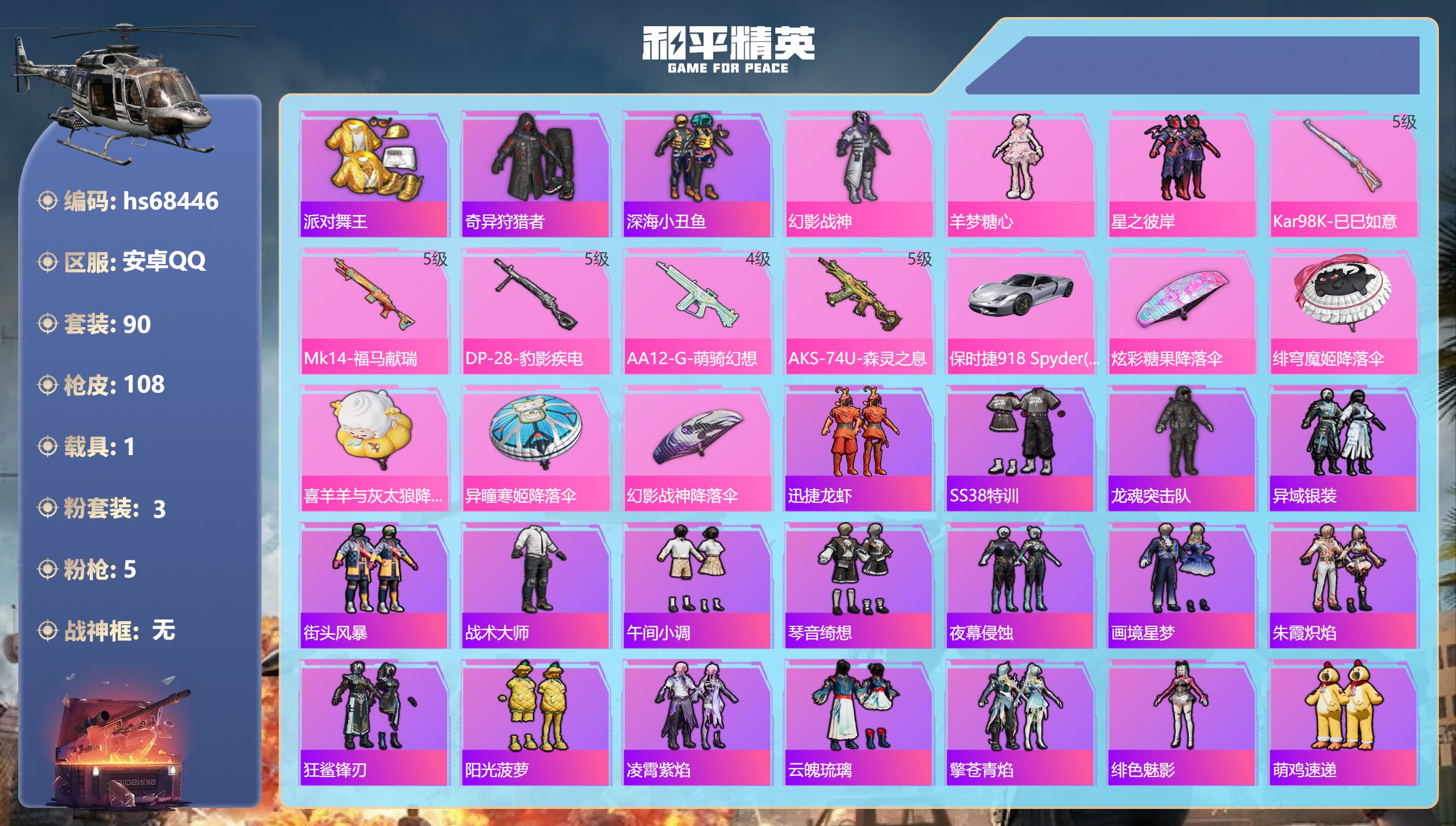 PX_2553933-,安卓手Q-6王牌印记-1红装-8粉装-9特效枪-2载具-48636热力值-108套装-137枪皮-1卓越印记-1传奇印记 【1红装】最终圣卫者-帕修斯/3级 【8粉装】套装-第五大道,角色-奇迹舞步,美雪,角色-千金淑猫,套装-暖熊萌萌,套装-极意拳锋,角色-幻星舰长,角色-绯穹魔姬,套装-星穹咏叹调 【9特效枪】Mk14-樱桃泡泡/5级,SCAR-L-魔童闹海,哪吒/3级,Mk14-福马献瑞/5级,AKM-暮色玫影/3级,M416-暖熊萌萌/4级,Kar98K-巳巳如意/4级,M417-第五大道/3级,DP-28-豹影疾电/5级,MG-36-沧焰双生/5级 【1稀有紫装】小丑鱼 【2稀有载具】保时捷911,敞篷版(星珀红),最终圣卫者摩托车 【108稀有时装】帕修斯/3级,第五大道,千金淑猫,暖熊萌萌,绯穹魔姬,幻星舰长,奇迹舞步,美雪,星穹咏叹调,极意拳锋,迅捷龙虾,SS38特训,小丑鱼,粉团憨憨,红熊茄茄,糯粉咩咩,异域银装,都市丽猫,白糯汤圆,街头风暴,糖霜甜心,鱼渊荷华,大橘大利,燕燕于飞,碧青流霞,芝莓熊熊,战术大师,智谋强哥,馥郁金蕊,香桃花海,巳巳如意,粉恋花,午间小调,彩虹兔,乐音,极速光影,雪绒豹,朱霞炽焰,狂鲨锋刃,夜瞳黯灵,游乐,美羊羊,凌霄紫焰,云魄琉璃,擎苍青焰,萌鸡速递,小鸟芋圆,元气之梦,风迹短诗,漫游都市,薄荷星砂,秘语星愿,云朵鹅,顶瓜瓜,雪国风尚,蓝冰羽,青翼流星,萌萌史莱姆,紫幽梦,马上来财,小熊蜂蜜罐,SS35特训,SS31特训,SS33特训,SS32特训,SS36特训,龙的传人,SS37特训,特训学院,猎鹰,红色运动,黄色运动,蓝色运动,黄色伏地魔,白色伏地魔,酷潮明星,SS34特训,竞技名士,深蓝色名流,猛禽,长空猛禽,软羊咩咩,冷焰舞者,魅力单车,青涩时光,狙击之神,红釉青花,雨过天青,福马献瑞,玲珑侠影,破蛋小黄鸡,疯狂小兔子,蓝彩潮人,海岛探路者,幻世保卫者,都市魅力,耀粉歌者,玉兔迎春,弄潮海豚,呆萌铁蟹,缤纷果语,滨海厨神,莱茵河畔,香榭午后,天籁歌者,电音精灵,老实芭蕉,王牌教练,柠萌假日 【137稀有枪械】AKM-暮色玫影/3级,SCAR-L-魔童闹海,哪吒/3级,M416-暖熊萌萌/4级,Kar98K-巳巳如意/4级,Mk14-福马献瑞/5级,Mk14-樱桃泡泡/5级,DP-28-豹影疾电/5级,M417-第五大道/3级,MG-36-沧焰双生/5级,DBS-乌木金纹,MK20-H-乌木金纹,DBS-风迹短诗,莫辛纳甘-风迹短诗,汤姆逊-幻星舰长,Win94-乌木金纹,MK12-风迹短诗,MK12-乌木金纹,SVD-冷漠罗丽,PKM-紫幽梦,R45-幻彩电音,Mk14-幻星舰长,Mk14-紫幽梦,M24-幻彩电音,蜜獾-乌木金纹,M762-云朵鹅,S1897-紫幽梦,SVD-云朵鹅,P92-紫幽梦,蜜獾-绯穹魔姬,M249-绯穹魔姬,SPAS-12-狂鲨锋刃,M417-玩趣呆呆,MK20-H-狂鲨锋刃,铝热弹-炫彩糖果,UZI-炫彩糖果,M416-萌萌史莱姆,ARX-像素花束,M249-萌萌史莱姆,UMP45-极意拳锋,Mini14-绯穹魔姬,大砍刀-像素花束,TMP-9-萌萌史莱姆,AWM-奇迹舞步,M249-冰晶雪宝,Mk47-风迹短诗,JS9-凌霄紫焰,MG-36-凌霄紫焰,平底锅-紫幽梦,破片手榴弹-海盐豹豹,AC-VAL-霁蓝缠春,UMP45-海盐豹豹,ARX-凌霄紫焰,AKS-74U-乌木金纹,AKM-涂鸦街区,蜜獾-风迹短诗,爆炸猎弓-喜羊羊与灰太狼,P92-凌霄紫焰,Famas-乌木金纹,SPAS-12-云朵鹅,破片手榴弹-拽到爆炸,平底锅-凌霄紫焰,Mk14-薄荷星砂,汤姆逊-智耀战神,沙漠之鹰-云朵鹅,烟雾弹-冰氧夏日,Mk14-紫晶流影,MG-36-薄荷星砂,大砍刀-云朵鹅,PKM-啾咪啾咪,SVD-霓彩脉冲,SLR-霓彩脉冲,平底锅-属我最6,蜜獾-冰澜龙吟,M16A4-最终圣卫者,AUG-紫晶流影,Kar98k-最终圣卫者,AMR-鸡智如我,野牛-最终圣卫者,AKM-霓彩脉冲,AKM-缤纷海域,SCAR-L-夜灯,SCAR-L-炫彩节奏,M762-第五大道,M762-暖熊萌萌,AC-VAL-天降萌叽,蜜獾-天降萌叽,Kar98K-梦幻火箭,AWM-天降萌叽,Mini14-梦幻火箭,Mini14-耀粉歌者,Mini14-穿刺龙虾,UZI-天降萌叽,UZI-啾咪啾咪,UMP45-生命誓言,UMP45-夜灯,汤姆逊-天降萌叽,S12K-暖熊萌萌,S12K-夜灯,DBS-第五大道,DP-28-彩虹符号,MG3-第五大道,MG3-幻世战舞者,GROZA-暮色玫影,Mk14-阳光菠萝,平底锅-霁蓝缠春,撬棍-暮色玫影,撬棍-冰晶雪宝,MG3-火熔核心,蝎式手枪-千金淑猫,AC-VAL-荒原烈焰,S686-千金淑猫,ACE32-冰晶雪宝,AUG-异域银装,汤姆逊-樱桃泡泡,MK20-H-樱桃泡泡,M24-樱桃泡泡,野牛-燕燕于飞,M200-乌木金纹,SPAS-12-燕燕于飞,蝎式手枪-燕燕于飞,十字弩-异域银装,SPAS-12-乌木金纹,Vector-燕燕于飞,十字弩-燕燕于飞,G36C-霁蓝缠春,M16A4-雨过天青,GROZA-福马献瑞,蜜獾-启元战纹,AMR-雨过天青,SLR-乌木金纹,AA12-G-雨过天青,PKM-雨过天青,沙漠之鹰-雨过天青,燃烧瓶-福马献瑞,GROZA-紫矿核心,汤姆逊-像素花束,MG3-火熔核心 【11稀有飞行器】终晖之翼飞行器,幻星舰长飞行器,狂鲨锋刃飞行器,马上有福飞行器,暮色之舞飞行器/1级,鸡智如我飞行器,奇迹舞步飞行器,登顶巅峰飞行器,破刃行动尾迹,提桶跑路飞行器,异域银装飞行器 【24稀有背包】暖熊萌萌背包(3级),幻星舰长背包(3级),幻彩电音背包(3级),狂鲨锋刃背包(3级),绯穹魔姬背包(3级),奇迹舞步背包(3级),炫彩糖果背包(3级),凌霄紫焰背包(3级),紫幽梦背包(3级),萌鸡速递背包(3级),风迹短诗背包(3级),巳巳如意背包(3级),云朵鹅背包(3级),最终圣卫者背包(3级),暮色玫影背包(3级),霁蓝缠春背包(3级),第五大道背包(3级),千金淑猫背包(3级),异域银装背包(3级),雪国风尚背包(3级),樱桃泡泡背包(3级),福马献瑞背包(3级),荒原烈焰背包(3级),深海小丑鱼背包(3级) 【37稀有降落伞】最终圣卫者降落伞,魔童闹海,敖丙降落伞,SS35王牌降落伞,SS36王牌降落伞,幻星舰长降落伞,冷漠罗丽降落伞,SS32王牌降落伞,炫彩糖果降落伞,萌萌史莱姆降落伞,狂鲨锋刃降落伞,星穹咏叹调降落伞,橘猫汽水