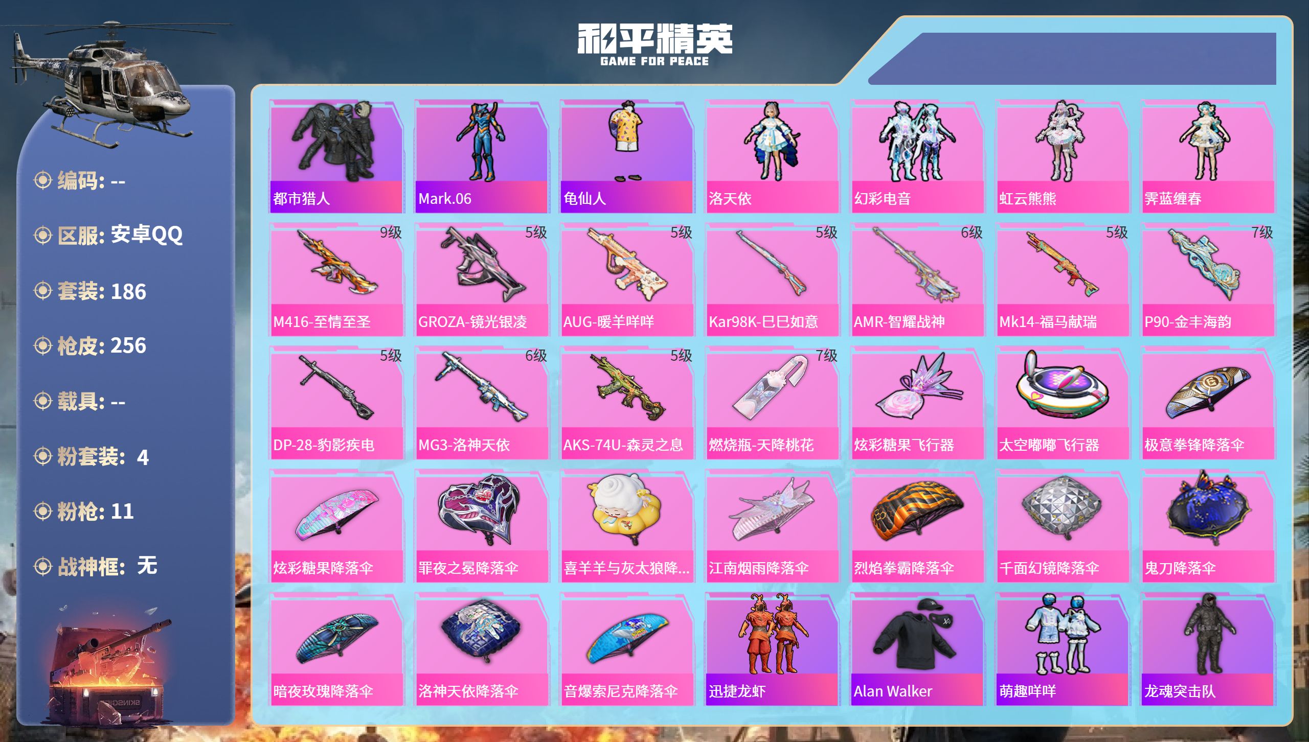 PX_2559592-,安卓手Q-9王牌印记-1粉装-7特效枪-32407热力值-67套装-146枪皮-2卓越印记-1传奇印记 【1粉装】角色-洛天依 【7特效枪】Kar98K-巳巳如意/5级,AA12-G-萌骑幻想/2级,AKS-74U-森灵之息/5级,DP-28-豹影疾电/5级,ACE32-萌骑漫游/3级,Mk14-福马献瑞/5级,Mk14-甜梦熊击/5级 【1稀有紫装】龟仙人 【67稀有时装】洛天依,龟仙人,异域银装,白糯汤圆,鱼渊荷华,大橘大利,燕燕于飞,战术大师,智谋强哥,紫俏灵猫,马上有钱,巳巳如意,午间小调,彩虹兔,时希公主,雪绒豹,朱霞炽焰,狂鲨锋刃,喜羊羊,凌霄紫焰,擎苍青焰,炫彩糖果,萌鸡速递,元气之梦,风迹短诗,漫游都市,薄荷星砂,秘语星愿,云朵鹅,顶瓜瓜,雪国风尚,蓝冰羽,恋语绒绒,紫幽梦,新风雅兰,SS35特训,SS31特训,SS33特训,SS32特训,SS36特训,潮流炫酷,SS37特训,SS28特训,黄色运动,漫步者,黑色伏地魔,SS34特训,竞技名士,SS30特训,长空猛禽,特战装甲,旭日情侣,街头潮人,魅力单车,狙击之神,红釉青花,鹰眼刺客,雨过天青,福马献瑞,冰冻风暴,幽夜迷踪,破蛋小黄鸡,疯狂小兔子,海岛探路者,SS27特训,海盐绵绵冰,王牌教练 【147稀有枪械】Kar98K-巳巳如意/5级,Mk14-甜梦熊击/5级,Mk14-福马献瑞/5级,DP-28-豹影疾电/5级,ACE32-萌骑漫游/3级,AA12-G-萌骑幻想/2级,AKS-74U-森灵之息/5级,DBS-乌木金纹,蜜獾-精灵梦叶罗丽,S1897-精灵梦叶罗丽,SCAR-L-海盐豹豹,Vector-突变脉冲,DBS-风迹短诗,莫辛纳甘-风迹短诗,Mini14-鸡智如我,Win94-乌木金纹,MK12-风迹短诗,MK12-乌木金纹,破片手榴弹-爆破雪人,S12K-极意拳锋,PKM-紫幽梦,DBS-幻彩电音,Mk14-紫幽梦,蜜獾-乌木金纹,M762-云朵鹅,S1897-紫幽梦,SVD-云朵鹅,P92-紫幽梦,M249-绯穹魔姬,SPAS-12-狂鲨锋刃,M417-玩趣呆呆,MK20-H-狂鲨锋刃,AUG-冰晶雪宝,铝热弹-炫彩糖果,UZI-炫彩糖果,M249-冰晶雪宝,Mk47-风迹短诗,JS9-凌霄紫焰,MG-36-凌霄紫焰,平底锅-紫幽梦,破片手榴弹-海盐豹豹,UMP45-海盐豹豹,ARX-凌霄紫焰,AKS-74U-乌木金纹,AKM-涂鸦街区,电击枪-喜羊羊与灰太狼,蜜獾-风迹短诗,爆炸猎弓-喜羊羊与灰太狼,P92-凌霄紫焰,AMR-喜羊羊与灰太狼,Famas-乌木金纹,Famas-霓彩脉冲,SPAS-12-云朵鹅,破片手榴弹-拽到爆炸,十字弩-异瞳寒姬,S1897-糯团青竹,平底锅-凌霄紫焰,Mk14-薄荷星砂,AKS-74U-鸡智如我,汤姆逊-智耀战神,沙漠之鹰-云朵鹅,烟雾弹-冰氧夏日,MG-36-薄荷星砂,大砍刀-云朵鹅,PKM-啾咪啾咪,爆炸猎弓-雪月幻音,SVD-霓彩脉冲,SLR-霓彩脉冲,平底锅-属我最6,蜜獾-鸡智如我,AUG-紫晶流影,S12K-霓彩脉冲,AMR-鸡智如我,AKM-霓彩脉冲,M416-红色方程式,M416-蓝色火焰,AKM-影袭,AKM-破晓战魂,SCAR-L-红色方程式,SCAR-L-夜灯,M16A4-幻世战舞者,GROZA-影袭,GROZA-懵萌河马,AUG-耀粉歌者,AUG-青春冒险家,M762-彩虹符号,蜜獾-天降萌叽,Kar98K-红色方程式,M24-影袭,M24-炫彩节奏,AWM-天降萌叽,SKS-糯团青竹,Mini14-耀粉歌者,Mk14-治愈之星,UZI-红色方程式,UZI-影袭,UZI-天降萌叽,UZI-啾咪啾咪,UMP45-蓝色火焰,UMP45-生命誓言,Vector-生命誓言,汤姆逊-耀粉歌者,汤姆逊-天降萌叽,MP5K-乌木金纹,P90-飞驰魅影,P90-玩趣呆呆,S686-彩虹符号,S12K-破晓战魂,S12K-玩趣呆呆,S12K-夜灯,DBS-彩虹符号,M249-破晓战魂,M249-糯团青竹,DP-28-彩虹符号,MG3-幻世战舞者,撬棍-冰晶雪宝,MG3-火熔核心,ACE32-冰晶雪宝,AUG-异域银装,汤姆逊-樱桃泡泡,MK20-H-星途旅人,野牛-燕燕于飞,M200-乌木金纹,SPAS-12-燕燕于飞,蝎式手枪-燕燕于飞,十字弩-异域银装,S686-巳巳如意,SPAS-12-乌木金纹,Vector-燕燕于飞,十字弩-燕燕于飞,AKM-荧星灵猫,M16A4-雨过天青,GROZA-福马献瑞,蜜獾-启元战纹,AMR-雨过天青,SLR-乌木金纹,AA12-G-雨过天青,PKM-雨过天青,沙漠之鹰-雨过天青,燃烧瓶-福马献瑞,P90-紫矿核心,GROZA-紫矿核心,VSS-香桃花海,汤姆逊-像素花束,P90-巳巳如意,破片手榴弹-巳巳如意,MG3-火熔核心 【5稀有飞行器】狂鲨锋刃飞行器,马上有福飞行器,鸡智如我飞行器,炫彩糖果飞行器,异域银装飞行器 【19稀有背包】狂鲨锋刃背包(3级),炫彩糖果背包(3级),喜羊羊与灰太狼背包(3级),异瞳寒姬背包(3级),凌霄紫焰背包(3级),紫幽梦背包(3级),萌鸡速递背包(3级),薄荷星砂背包(3级),风迹短诗背包(3级),巳巳如意背包(3级),云朵鹅背包(3级),异域银装背包(3级),忍者神龟背包(3级),金蛇镇世背包(3级),福马献瑞背包(3级),荒原烈焰背包(3级),智谋强哥背包(3级),时空追击者背包(3级),冰河战士背包(3级) 【35稀有降落伞】海盐豹豹降落伞,精灵梦叶罗丽降落伞,SS28王牌降落伞,SS35王牌降落伞,SS36王牌降落伞,SS32王牌降落伞,炫彩糖果降落伞,绝对恒星降落伞,狂鲨锋刃降落伞,雨过天青降落伞,福马献瑞降落伞,紫幽梦降落伞,SS34王牌降落伞,喜羊羊与灰太狼降落伞,百战成名降落伞,凌霄紫焰降落伞,SS33王牌降落伞,风迹短诗降落伞,云朵鹅降落伞,一举夺葵降落伞,野性觉醒降落伞,时光之誓降落伞,SS27王牌降落伞,钢铁雄心降落伞,都市猎人降落伞,巳巳如意降落伞,普通降落伞,化学天才降落伞,白昼之火降落伞,异域银装降落伞,燕燕于飞降落伞,SS31王牌降落伞,寂夜之火降落伞,电竞之星降落伞,蓝海之火降落伞 【17稀有头盔】雪国风尚头盔(3级),桃粉嫣然头盔(3级),冷漠罗丽头盔(3级),狂鲨锋刃头盔(3级),炫彩糖果头盔(3级),紫幽梦头盔(3级),喜羊羊与灰太狼头盔(3级),薄荷星砂头盔(3级),异瞳寒姬头盔(3级),萌鸡速递头盔(3级),凌霄紫焰头盔(3级),雪月幻音头盔(3级),风迹短诗头盔(3级),云朵鹅头盔(3级),海盐豹豹头盔(3级),异域银装头盔(3级),福马献瑞头盔(3级)