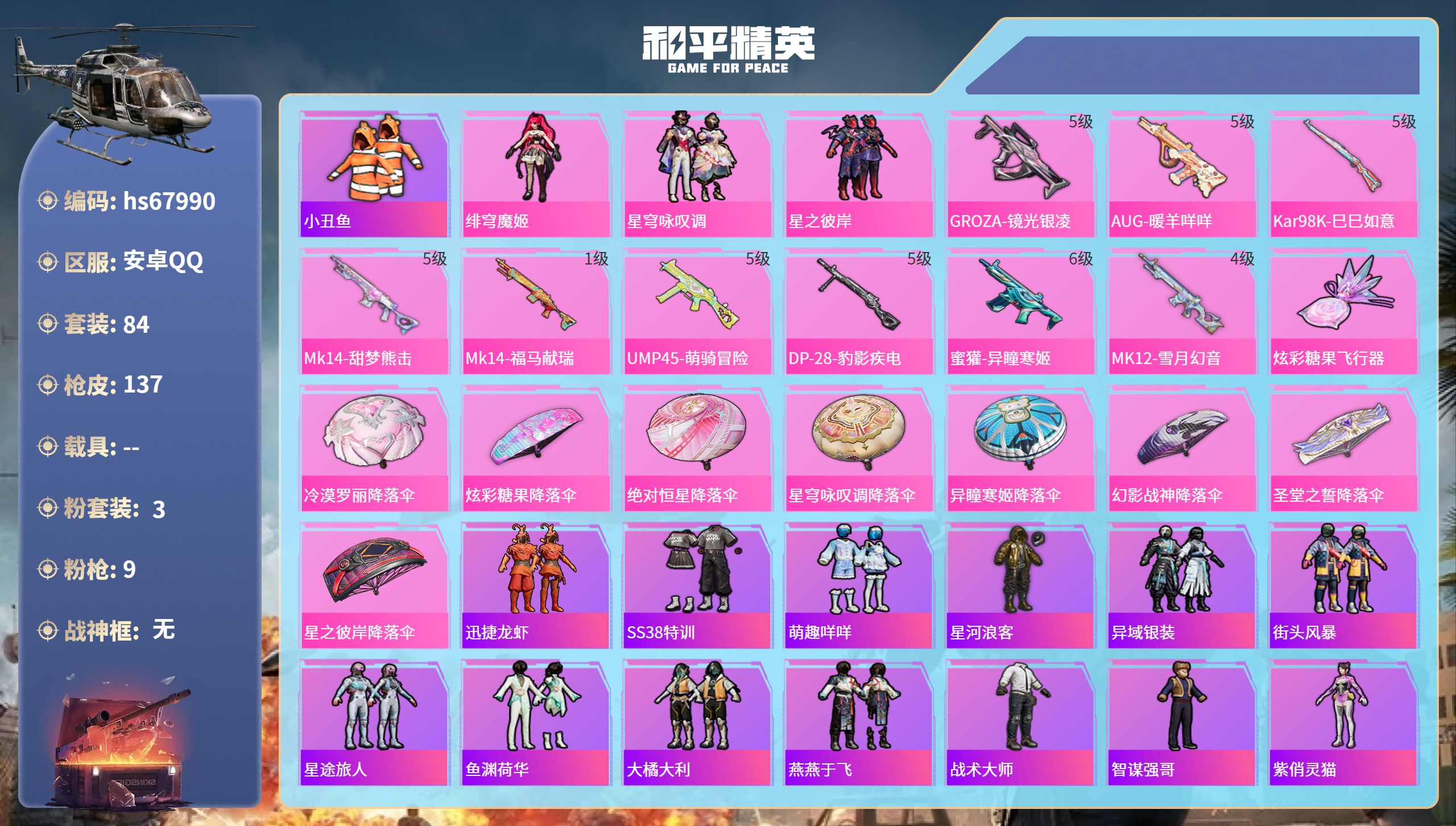 PX_2546672-安卓手Q-2王牌印记-3粉装-9特效枪-35334热力值-84套装-137枪皮 【3粉装】套装-星穹咏叹调,角色-绯穹魔姬,套装-星之彼岸 【9特效枪】DP-28-豹影疾电/5级,UMP45-萌骑冒险/5级,蜜獾-异瞳寒姬/6级,Mk14-甜梦熊击/5级,MK12-雪月幻音/4级,GROZA-镜光银凌/5级,AUG-暖羊咩咩/5级,Mk14-福马献瑞/1级,Kar98K-巳巳如意/5级 【1稀有紫装】小丑鱼 【84稀有时装】绯穹魔姬,星穹咏叹调,星之彼岸,迅捷龙虾,SS38特训,小丑鱼,萌趣咩咩,星河浪客,异域银装,街头风暴,星途旅人,鱼渊荷华,大橘大利,燕燕于飞,战术大师,智谋强哥,紫俏灵猫,香桃花海,蝶变,巳巳如意,元素星魂,午间小调,彩虹兔,琴音绮想,灵公主,雪绒豹,画境星梦,星影赞美诗,朱霞炽焰,狂鲨锋刃,游乐,懒羊羊,凌霄紫焰,粉黛兰香,擎苍青焰,炫彩糖果,绯色魅影,萌鸡速递,元气之梦,风迹短诗,漫游都市,薄荷星砂,秘语星愿,云朵鹅,雪国风尚,蓝冰羽,恋语绒绒,青翼流星,紫幽梦,SS35特训,SS33特训,SS36特训,SS37特训,猎鹰,黄色运动,黄色伏地魔,阳光火鸡,湖蓝色名流,漫步者,SS34特训,特战装甲,旭日情侣,街头潮人,冷焰舞者,魅力单车,幻世战舞者,狙击之神,红釉青花,雨过天青,福马献瑞,玲珑侠影,完美偶像,人气偶像,破蛋小黄鸡,暗金炫舞,破晓战魂,幻世保卫者,耀粉歌者,光之冒险,呆萌铁蟹,缤纷果语,滨海厨神,王牌教练,柠萌假日 【137稀有枪械】GROZA-镜光银凌/5级,AUG-暖羊咩咩/5级,Kar98K-巳巳如意/5级,Mk14-甜梦熊击/5级,Mk14-福马献瑞/1级,UMP45-萌骑冒险/5级,DP-28-豹影疾电/5级,蜜獾-异瞳寒姬/6级,MK12-雪月幻音/4级,SCAR-L-海盐豹豹,M16A4-冰河战士,MK20-H-乌木金纹,DBS-风迹短诗,莫辛纳甘-风迹短诗,Mini14-鸡智如我,AKM-绿洲时空,Win94-乌木金纹,MK12-风迹短诗,MK12-乌木金纹,破片手榴弹-爆破雪人,S12K-极意拳锋,PKM-紫幽梦,MG3-霓彩脉冲,DBS-幻彩电音,ACE32-画境星梦,M1加兰德-画境星梦,MP5K-画境星梦,Mk14-紫幽梦,蜜獾-乌木金纹,M762-云朵鹅,S1897-紫幽梦,SVD-云朵鹅,P92-紫幽梦,AWM-绿洲时空,SPAS-12-狂鲨锋刃,MK20-H-狂鲨锋刃,AUG-冰晶雪宝,铝热弹-炫彩糖果,UZI-炫彩糖果,UMP45-绿洲时空,ARX-像素花束,MG3-鸢尾珑雾,大砍刀-像素花束,AA12-G-画境星梦,G36C-星穹咏叹调,平底锅-画境星梦,M249-冰晶雪宝,Kar98K-星穹咏叹调,Mk47-风迹短诗,JS9-凌霄紫焰,MG-36-凌霄紫焰,平底锅-紫幽梦,UMP45-海盐豹豹,ARX-凌霄紫焰,AKS-74U-乌木金纹,AKM-涂鸦街区,蜜獾-风迹短诗,P92-凌霄紫焰,Famas-乌木金纹,Famas-霓彩脉冲,SPAS-12-云朵鹅,M249-无面战甲,破片手榴弹-拽到爆炸,十字弩-异瞳寒姬,S1897-糯团青竹,信号枪-异瞳寒姬,平底锅-凌霄紫焰,Mk14-薄荷星砂,MK20-H-蛇蝎美人,AKS-74U-鸡智如我,沙漠之鹰-云朵鹅,烟雾弹-冰氧夏日,Mk14-紫晶流影,MG-36-薄荷星砂,SCAR-L-绿洲时空,大砍刀-云朵鹅,PKM-啾咪啾咪,AUG-绝对恒星,SVD-霓彩脉冲,SLR-霓彩脉冲,P1911-无面战甲,AUG-紫晶流影,S12K-霓彩脉冲,AMR-鸡智如我,AKM-霓彩脉冲,AKM-江南烟雨,GROZA-影袭,AUG-幻影战神,AUG-天降萌叽,QBZ-彩虹符号,蜜獾-天降萌叽,Kar98K-幻影战神,Kar98K-影袭,SKS-迅猛狂鲨,UZI-炫彩节奏,Vector-生命誓言,汤姆逊-炫彩节奏,MP5K-乌木金纹,P90-玩趣呆呆,S12K-幻影战神,M249-彩虹符号,M249-星之彼岸,DP-28-彩虹符号,MG3-幻世战舞者,Mk14-阳光菠萝,撬棍-冰晶雪宝,MG3-火熔核心,UZI-绿洲时空,ACE32-冰晶雪宝,AUG-异域银装,野牛-燕燕于飞,M200-乌木金纹,SPAS-12-燕燕于飞,蝎式手枪-燕燕于飞,十字弩-异域银装,SCAR-L-星途旅人,S686-巳巳如意,SPAS-12-乌木金纹,Vector-燕燕于飞,十字弩-燕燕于飞,M16A4-雨过天青,GROZA-福马献瑞,蜜獾-启元战纹,AMR-雨过天青,SLR-乌木金纹,AA12-G-雨过天青,PKM-雨过天青,沙漠之鹰-雨过天青,燃烧瓶-福马献瑞,P90-紫矿核心,GROZA-紫矿核心,VSS-香桃花海,Mini14-香桃花海,汤姆逊-像素花束,P90-巳巳如意,破片手榴弹-巳巳如意,MG3-火熔核心 【5稀有飞行器】狂鲨锋刃飞行器,马上有福飞行器,炫彩糖果飞行器,登顶巅峰飞行器,异域银装飞行器 【27稀有背包】冷漠罗丽背包(3级),狂鲨锋刃背包(3级),绝对恒星背包(3级),画境星梦背包(3级),星穹咏叹调背包(3级),炫彩糖果背包(3级),喜羊羊与灰太狼背包(3级),异瞳寒姬背包(3级),凌霄紫焰背包(3级),粉黛兰香背包(3级),紫幽梦背包(3级),萌鸡速递背包(3级),薄荷星砂背包(3级),风迹短诗背包(3级),雪月幻音背包(3级),巳巳如意背包(3级),云朵鹅背包(3级),幻影战神背包(3级),蝶变背包(3级),拳皇・狂花道背包(3级),异域银装背包(3级),雪国风尚背包(3级),福马献瑞背包(3级),智谋强哥背包(3级),香桃花海背包(3级),深海小丑鱼背包(3级),冰河战士背包(3级) 【37稀有降落伞】无面战甲降落伞,SS35王牌降落伞,SS36王牌降落伞,冷漠罗丽降落伞,炫彩糖果降落伞,绝对恒星降落伞,狂鲨锋刃降落伞,星穹咏叹调降落伞,雨过天青降落伞,福马献瑞降落伞,画境星梦降落伞,紫幽梦降落伞,蛇蝎美人降落伞,百战成名降落伞,异瞳寒姬降落伞,凌霄紫焰降落伞,竞逐热浪降落伞,风迹短诗降落伞,云朵鹅降落伞,一举夺葵降落伞,月下萌萌兔降落伞,都市猎人降落伞,巳巳如意降落伞,普通降落伞,白昼之火降落伞,星途旅人降落伞,异域银装降落伞,燕燕于飞降落伞,海域冒险降落伞,寂夜之火降落伞,香桃花海降落伞,干得PEL亮降落伞,幻影战神降落伞,圣堂之誓降落伞,星之彼岸降落伞,电竞之星降落伞,蓝海之火降落伞 【22稀有头盔】幻影战神头盔(3级),甜蜜菠萝头盔(3级),雪国风尚头盔(3级),狂鲨锋刃头盔(3级),炫彩糖果头盔(3级),绯穹魔
