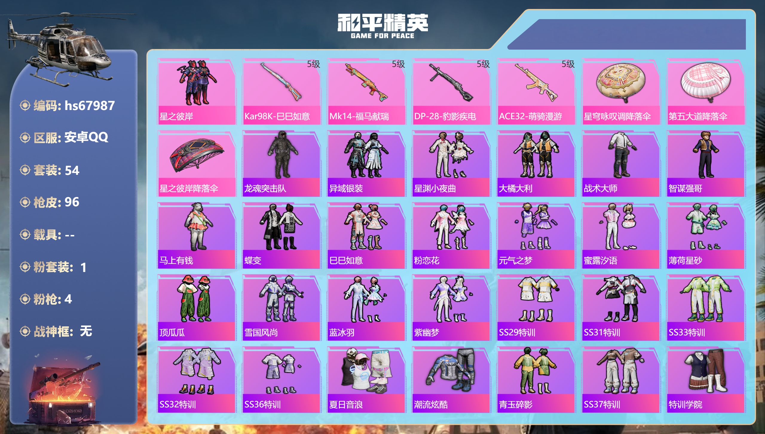 PX_2546762-,安卓手Q-2王牌印记-1粉装-4特效枪-22618热力值-54套装-96枪皮 【1粉装】套装-星之彼岸 【4特效枪】DP-28-豹影疾电/5级,Kar98K-巳巳如意/5级,ACE32-萌骑漫游/5级,Mk14-福马献瑞/5级 【54稀有时装】星之彼岸,龙魂突击队,异域银装,星渊小夜曲,大橘大利,战术大师,智谋强哥,马上有钱,蝶变,巳巳如意,粉恋花,元气之梦,蜜露汐语,薄荷星砂,顶瓜瓜,雪国风尚,蓝冰羽,紫幽梦,SS29特训,SS31特训,SS33特训,SS32特训,SS36特训,夏日音浪,潮流炫酷,青玉碎影,SS37特训,特训学院,蓝色运动,黄色伏地魔,白色伏地魔,黑色伏地魔,炫蓝之夏,SS34特训,竞技名士,长空猛禽,冷焰舞者,幻世战舞者,狙击之神,红釉青花,鹰眼刺客,雨过天青,破蛋小黄鸡,疯狂小兔子,耀粉歌者,探宝勇士,SS19特训,SS20特训,SS21特训,格斗先锋,老实芭蕉,鹤鸣,快乐星愿,星梦畅游 【96稀有枪械】Kar98K-巳巳如意/5级,Mk14-福马献瑞/5级,DP-28-豹影疾电/5级,ACE32-萌骑漫游/5级,SCAR-L-海盐豹豹,Mk14-冰河战士,撬棍-突变脉冲,UZI-冰河战士,M16A4-冰河战士,MK20-H-乌木金纹,MK12-乌木金纹,PKM-紫幽梦,MG3-霓彩脉冲,Mk14-紫幽梦,M24-幻彩电音,蜜獾-乌木金纹,S1897-紫幽梦,P92-紫幽梦,M417-玩趣呆呆,G36C-星穹咏叹调,短管霰弹-星穹咏叹调,M249-冰晶雪宝,平底锅-紫幽梦,UMP45-海盐豹豹,AKS-74U-乌木金纹,AKM-涂鸦街区,AMR-喜羊羊与灰太狼,Famas-乌木金纹,S1897-糯团青竹,Mk14-薄荷星砂,烟雾弹-冰氧夏日,PKM-啾咪啾咪,平底锅-属我最6,AUG-紫晶流影,AMR-鸡智如我,M416-红色方程式,M416-蓝色火焰,AKM-破晓战魂,AKM-灼热熔岩,SCAR-L-红色方程式,SCAR-L-玉兔迎春,SCAR-L-夜灯,SCAR-L-炫彩节奏,M16A4-红色方程式,M16A4-蓝色火焰,M16A4-幻世战舞者,AUG-耀粉歌者,QBZ-彩虹符号,M762-彩虹符号,M762-天降萌叽,Mk47-乌木金纹,AC-VAL-天降萌叽,Kar98K-红色方程式,Kar98K-炫彩节奏,M24-乌木金纹,M24-炫彩节奏,AWM-天降萌叽,SKS-糯团青竹,SKS-炫彩节奏,VSS-彩虹符号,Mini14-耀粉歌者,Mk14-乌木金纹,UZI-红色方程式,UZI-啾咪啾咪,UMP45-蓝色火焰,UMP45-生命誓言,UMP45-夜灯,Vector-生命誓言,汤姆逊-耀粉歌者,野牛-乌木金纹,S686-彩虹符号,S686-红色方程式,S12K-破晓战魂,S12K-幻世战舞者,M249-破晓战魂,M249-糯团青竹,DP-28-彩虹符号,MG3-幻世战舞者,MG3-火熔核心,AUG-异域银装,M200-乌木金纹,十字弩-异域银装,S686-巳巳如意,M16A4-雨过天青,GROZA-福马献瑞,AMR-雨过天青,SLR-乌木金纹,AA12-G-雨过天青,PKM-雨过天青,沙漠之鹰-雨过天青,燃烧瓶-福马献瑞,P90-紫矿核心,VSS-香桃花海,P90-巳巳如意,破片手榴弹-巳巳如意,MG3-火熔核心 【3稀有飞行器】马上有福飞行器,破刃行动尾迹,异域银装飞行器 【13稀有背包】紫幽梦背包(3级),巳巳如意背包(3级),异域银装背包(3级),龙的传人背包(3级),忍者神龟背包(3级),樱桃泡泡背包(3级),雨过天青背包(3级),福马献瑞背包(3级),荒原烈焰背包(3级),智谋强哥背包(3级),炫蓝之夏背包(3级),玉兔迎春背包(3级),冰河战士背包(3级) 【23稀有降落伞】SS32王牌降落伞,属我最6降落伞,星穹咏叹调降落伞,雨过天青降落伞,福马献瑞降落伞,紫幽梦降落伞,SS34王牌降落伞,竞逐热浪降落伞,一举夺葵降落伞,月下萌萌兔降落伞,第五大道降落伞,钢铁雄心降落伞,绿草茵茵降落伞,巳巳如意降落伞,光之冒险降落伞,普通降落伞,比翼双飞降落伞,化学天才降落伞,异域银装降落伞,干得PEL亮降落伞,冰河战士降落伞,星之彼岸降落伞,幻世战舞者降落伞 【10稀有头盔】雪国风尚头盔(3级),狂鲨锋刃头盔(3级),星穹咏叹调头盔(3级),紫幽梦头盔(3级),巳巳如意头盔(3级),异域银装头盔(3级),荒原烈焰头盔(3级),临安公主头盔(3级),玉兔迎春头盔(3级),炫蓝之夏头盔(3级)