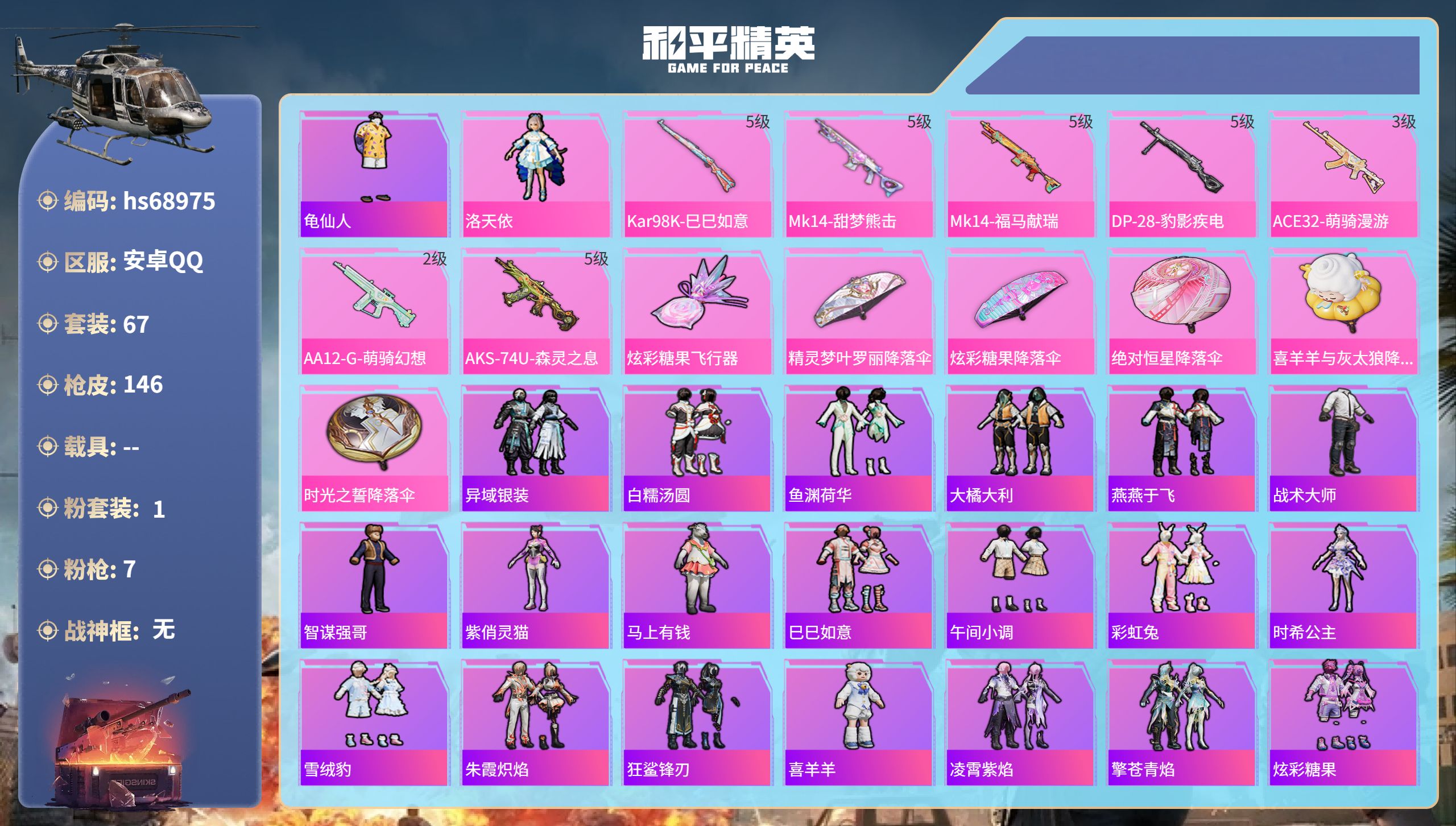 PX_2559592-,安卓手Q-9王牌印记-1粉装-7特效枪-32407热力值-67套装-146枪皮-2卓越印记-1传奇印记 【1粉装】角色-洛天依 【7特效枪】Kar98K-巳巳如意/5级,AA12-G-萌骑幻想/2级,AKS-74U-森灵之息/5级,DP-28-豹影疾电/5级,ACE32-萌骑漫游/3级,Mk14-福马献瑞/5级,Mk14-甜梦熊击/5级 【1稀有紫装】龟仙人 【67稀有时装】洛天依,龟仙人,异域银装,白糯汤圆,鱼渊荷华,大橘大利,燕燕于飞,战术大师,智谋强哥,紫俏灵猫,马上有钱,巳巳如意,午间小调,彩虹兔,时希公主,雪绒豹,朱霞炽焰,狂鲨锋刃,喜羊羊,凌霄紫焰,擎苍青焰,炫彩糖果,萌鸡速递,元气之梦,风迹短诗,漫游都市,薄荷星砂,秘语星愿,云朵鹅,顶瓜瓜,雪国风尚,蓝冰羽,恋语绒绒,紫幽梦,新风雅兰,SS35特训,SS31特训,SS33特训,SS32特训,SS36特训,潮流炫酷,SS37特训,SS28特训,黄色运动,漫步者,黑色伏地魔,SS34特训,竞技名士,SS30特训,长空猛禽,特战装甲,旭日情侣,街头潮人,魅力单车,狙击之神,红釉青花,鹰眼刺客,雨过天青,福马献瑞,冰冻风暴,幽夜迷踪,破蛋小黄鸡,疯狂小兔子,海岛探路者,SS27特训,海盐绵绵冰,王牌教练 【147稀有枪械】Kar98K-巳巳如意/5级,Mk14-甜梦熊击/5级,Mk14-福马献瑞/5级,DP-28-豹影疾电/5级,ACE32-萌骑漫游/3级,AA12-G-萌骑幻想/2级,AKS-74U-森灵之息/5级,DBS-乌木金纹,蜜獾-精灵梦叶罗丽,S1897-精灵梦叶罗丽,SCAR-L-海盐豹豹,Vector-突变脉冲,DBS-风迹短诗,莫辛纳甘-风迹短诗,Mini14-鸡智如我,Win94-乌木金纹,MK12-风迹短诗,MK12-乌木金纹,破片手榴弹-爆破雪人,S12K-极意拳锋,PKM-紫幽梦,DBS-幻彩电音,Mk14-紫幽梦,蜜獾-乌木金纹,M762-云朵鹅,S1897-紫幽梦,SVD-云朵鹅,P92-紫幽梦,M249-绯穹魔姬,SPAS-12-狂鲨锋刃,M417-玩趣呆呆,MK20-H-狂鲨锋刃,AUG-冰晶雪宝,铝热弹-炫彩糖果,UZI-炫彩糖果,M249-冰晶雪宝,Mk47-风迹短诗,JS9-凌霄紫焰,MG-36-凌霄紫焰,平底锅-紫幽梦,破片手榴弹-海盐豹豹,UMP45-海盐豹豹,ARX-凌霄紫焰,AKS-74U-乌木金纹,AKM-涂鸦街区,电击枪-喜羊羊与灰太狼,蜜獾-风迹短诗,爆炸猎弓-喜羊羊与灰太狼,P92-凌霄紫焰,AMR-喜羊羊与灰太狼,Famas-乌木金纹,Famas-霓彩脉冲,SPAS-12-云朵鹅,破片手榴弹-拽到爆炸,十字弩-异瞳寒姬,S1897-糯团青竹,平底锅-凌霄紫焰,Mk14-薄荷星砂,AKS-74U-鸡智如我,汤姆逊-智耀战神,沙漠之鹰-云朵鹅,烟雾弹-冰氧夏日,MG-36-薄荷星砂,大砍刀-云朵鹅,PKM-啾咪啾咪,爆炸猎弓-雪月幻音,SVD-霓彩脉冲,SLR-霓彩脉冲,平底锅-属我最6,蜜獾-鸡智如我,AUG-紫晶流影,S12K-霓彩脉冲,AMR-鸡智如我,AKM-霓彩脉冲,M416-红色方程式,M416-蓝色火焰,AKM-影袭,AKM-破晓战魂,SCAR-L-红色方程式,SCAR-L-夜灯,M16A4-幻世战舞者,GROZA-影袭,GROZA-懵萌河马,AUG-耀粉歌者,AUG-青春冒险家,M762-彩虹符号,蜜獾-天降萌叽,Kar98K-红色方程式,M24-影袭,M24-炫彩节奏,AWM-天降萌叽,SKS-糯团青竹,Mini14-耀粉歌者,Mk14-治愈之星,UZI-红色方程式,UZI-影袭,UZI-天降萌叽,UZI-啾咪啾咪,UMP45-蓝色火焰,UMP45-生命誓言,Vector-生命誓言,汤姆逊-耀粉歌者,汤姆逊-天降萌叽,MP5K-乌木金纹,P90-飞驰魅影,P90-玩趣呆呆,S686-彩虹符号,S12K-破晓战魂,S12K-玩趣呆呆,S12K-夜灯,DBS-彩虹符号,M249-破晓战魂,M249-糯团青竹,DP-28-彩虹符号,MG3-幻世战舞者,撬棍-冰晶雪宝,MG3-火熔核心,ACE32-冰晶雪宝,AUG-异域银装,汤姆逊-樱桃泡泡,MK20-H-星途旅人,野牛-燕燕于飞,M200-乌木金纹,SPAS-12-燕燕于飞,蝎式手枪-燕燕于飞,十字弩-异域银装,S686-巳巳如意,SPAS-12-乌木金纹,Vector-燕燕于飞,十字弩-燕燕于飞,AKM-荧星灵猫,M16A4-雨过天青,GROZA-福马献瑞,蜜獾-启元战纹,AMR-雨过天青,SLR-乌木金纹,AA12-G-雨过天青,PKM-雨过天青,沙漠之鹰-雨过天青,燃烧瓶-福马献瑞,P90-紫矿核心,GROZA-紫矿核心,VSS-香桃花海,汤姆逊-像素花束,P90-巳巳如意,破片手榴弹-巳巳如意,MG3-火熔核心 【5稀有飞行器】狂鲨锋刃飞行器,马上有福飞行器,鸡智如我飞行器,炫彩糖果飞行器,异域银装飞行器 【19稀有背包】狂鲨锋刃背包(3级),炫彩糖果背包(3级),喜羊羊与灰太狼背包(3级),异瞳寒姬背包(3级),凌霄紫焰背包(3级),紫幽梦背包(3级),萌鸡速递背包(3级),薄荷星砂背包(3级),风迹短诗背包(3级),巳巳如意背包(3级),云朵鹅背包(3级),异域银装背包(3级),忍者神龟背包(3级),金蛇镇世背包(3级),福马献瑞背包(3级),荒原烈焰背包(3级),智谋强哥背包(3级),时空追击者背包(3级),冰河战士背包(3级) 【35稀有降落伞】海盐豹豹降落伞,精灵梦叶罗丽降落伞,SS28王牌降落伞,SS35王牌降落伞,SS36王牌降落伞,SS32王牌降落伞,炫彩糖果降落伞,绝对恒星降落伞,狂鲨锋刃降落伞,雨过天青降落伞,福马献瑞降落伞,紫幽梦降落伞,SS34王牌降落伞,喜羊羊与灰太狼降落伞,百战成名降落伞,凌霄紫焰降落伞,SS33王牌降落伞,风迹短诗降落伞,云朵鹅降落伞,一举夺葵降落伞,野性觉醒降落伞,时光之誓降落伞,SS27王牌降落伞,钢铁雄心降落伞,都市猎人降落伞,巳巳如意降落伞,普通降落伞,化学天才降落伞,白昼之火降落伞,异域银装降落伞,燕燕于飞降落伞,SS31王牌降落伞,寂夜之火降落伞,电竞之星降落伞,蓝海之火降落伞 【17稀有头盔】雪国风尚头盔(3级),桃粉嫣然头盔(3级),冷漠罗丽头盔(3级),狂鲨锋刃头盔(3级),炫彩糖果头盔(3级),紫幽梦头盔(3级),喜羊羊与灰太狼头盔(3级),薄荷星砂头盔(3级),异瞳寒姬头盔(3级),萌鸡速递头盔(3级),凌霄紫焰头盔(3级),雪月幻音头盔(3级),风迹短诗头盔(3级),云朵鹅头盔(3级),海盐豹豹头盔(3级),异域银装头盔(3级),福马献瑞头盔(3级)