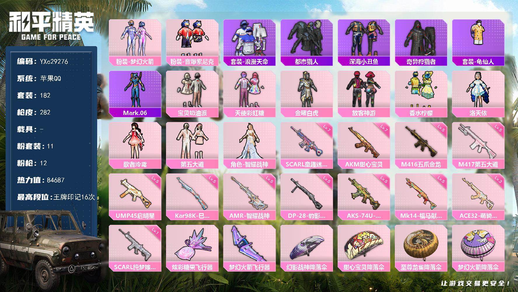 PX_2550015-01,都市,智耀战神,放客,满级AK甜心,满地铁天赋】YXc29276-【可二次】【因赛季更新游戏段付以上号为准!】 ,苹果Q-4稀有11粉装12特效枪19热门182套装282枪皮,,16印记,历史传奇王牌19星, 【4稀有】,奇异狩猎者,AKM-缤纷海域,都市猎人,浪漫天命, 【11粉装】,梦幻火箭,宝贝奶油派,天使彩虹糖,洛天依,金曜白虎,智耀战神,放客神游,歌者泠鸢,第五大道,香水柠檬,音爆索尼克, 【12特效枪】,M416-五爪金龙,(5级),SCAR-L-纯梦嫁纱,(1级),AKM-甜心宝贝,(7级),AKS-74U-森灵之息,(5级),Kar98K-巳巳如意,(5级),DP-28-豹影疾电,(5级),AMR-智耀战神,(5级),SCAR-L-童趣迷兔,(7级),M417-第五大道,(5级),UMP45-启明星,(5级),Mk14-福马献瑞,(5级),ACE32-萌骑漫游,(3级), 【19热门】,Mark.06,龟仙人,呆萌铁蟹,鹰眼刺客,迅捷狂鲨,深海小丑鱼,TT战队服,纯白誓言,漫步者,冰爽海盐,机械英豪,破蛋小黄鸡,英勇保护者,弄潮海豚,M416-仓鼠灰灰,M762-奇异狩猎者,M24-奇异狩猎者,S686-奇异狩猎者,Kar98K-古堡领主, 【2飞行器】,繁花小夜曲飞行翼,梦幻火箭飞行器, 【6头盔】,童趣迷兔头盔,梦幻火箭头盔,金曜白虎头盔,甜心宝贝头盔,幻影战神头盔,深海小丑鱼头盔, 【7背包】,梦幻火箭背包,金曜白虎背包,甜心宝贝背包,百万伏特背包,幻影战神背包,神秘黑猫背包,甜蜜誓约背包,