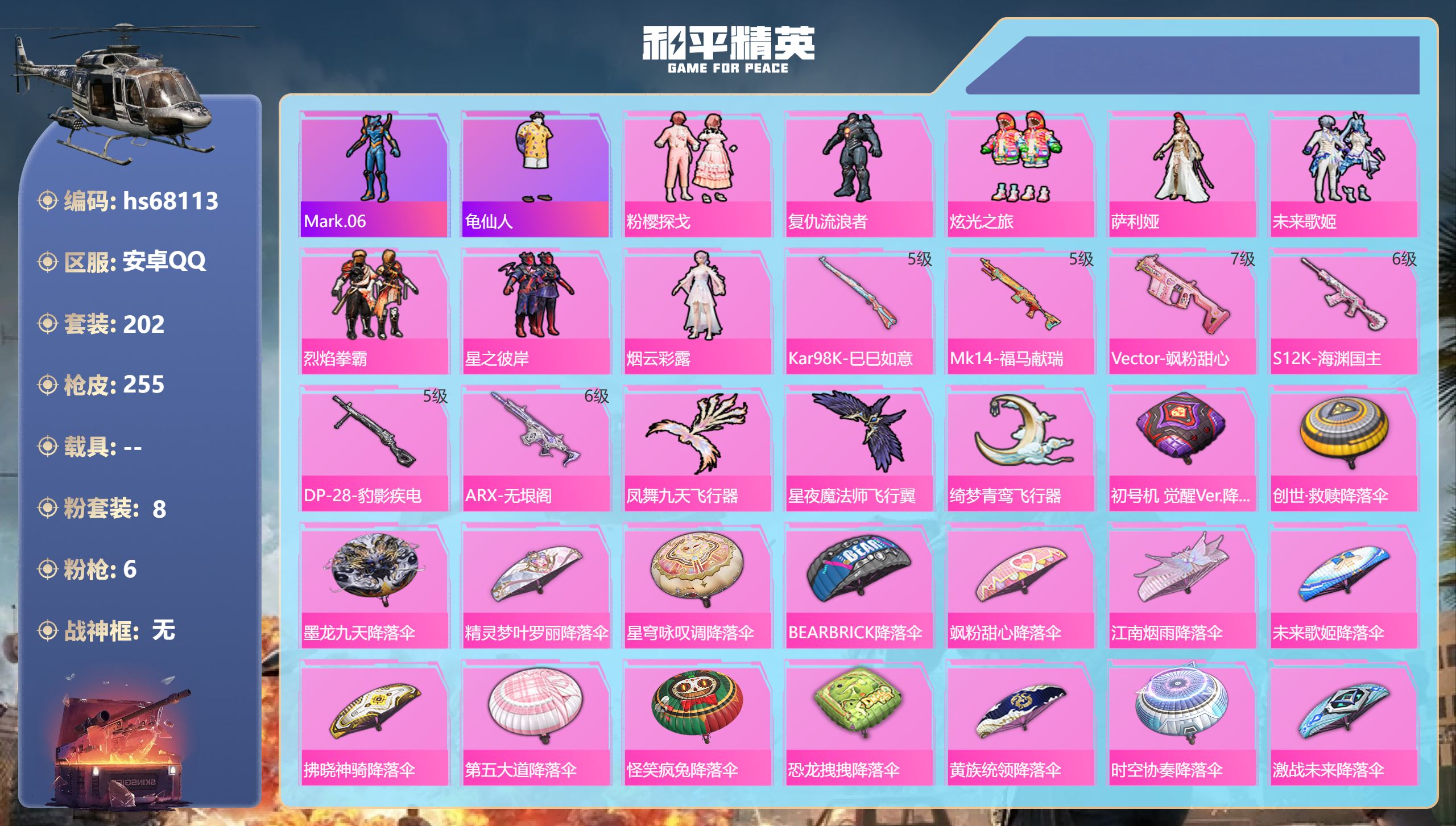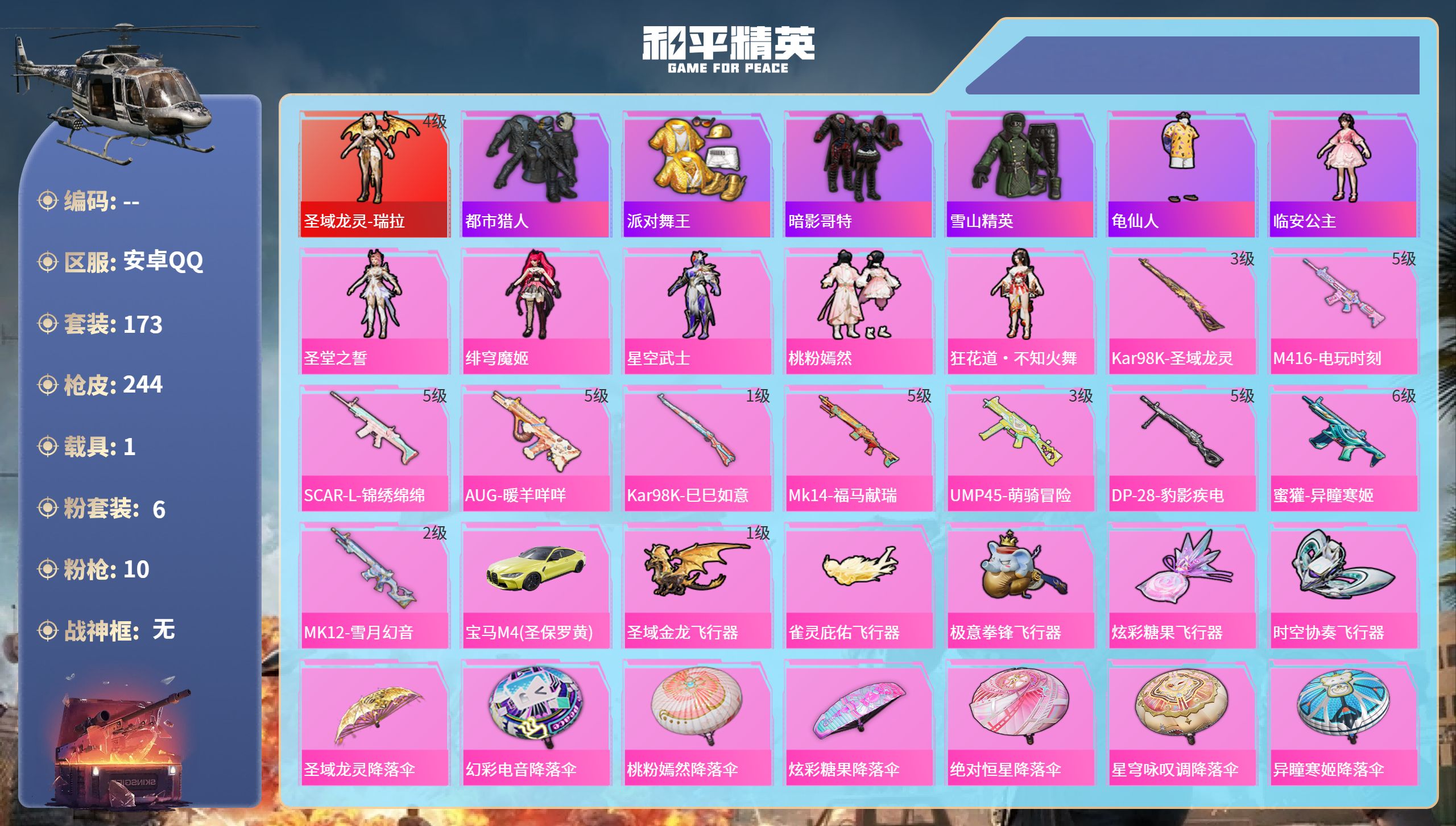 PX_2550018-安卓手Q-13王牌印记-1红装-6粉装-10特效枪-1载具-79180热力值-173套装-244枪皮-4卓越印记-1传奇印记 【1红装】圣域龙灵-瑞拉/4级 【6粉装】角色-鸢尾珑雾,角色-圣堂之誓,角色-星空武士,角色-狂花道·不知火舞,角色-绯穹魔姬,套装-桃粉嫣然 【10特效枪】AUG-暖羊咩咩/5级,Mk14-福马献瑞/5级,SCAR-L-锦绣绵绵/5级,UMP45-萌骑冒险/3级,DP-28-豹影疾电/5级,M416-电玩时刻/5级,Kar98K-圣域龙灵/3级,MK12-雪月幻音/2级,Kar98K-巳巳如意/1级,蜜獾-异瞳寒姬/6级 【6稀有紫装】都市猎人,派对舞王,暗影哥特,雪山精英,龟仙人,临安公主 【1稀有载具】宝马M4(圣保罗黄) 【172稀有时装】瑞拉/4级,圣堂之誓,绯穹魔姬,星空武士,桃粉嫣然,狂花道·不知火舞,创世·幻影,迅捷龙虾,SS38特训,都市猎人,龟仙人,雪山精英,暗影哥特,派对舞王,石蕴玉辉,龙魂突击队,小熊娃娃,异域银装,摩登魅猫,街头风暴,星途旅人,冰河战士,荒漠狂战,鱼渊荷华,青团波波,大橘大利,燕燕于飞,临安公主,风玲,战术大师,智谋强哥,紫俏灵猫,雏菊兔兔,马上有钱,糖糖葫芦,香桃花海,蝶变,猎影月神,巳巳如意,粉恋花,湖畔霞光,棉花软糖,午间小调,彩虹兔,琴音绮想,霓虹热舞,雪绒豹,画境星梦,朱霞炽焰,狂鲨锋刃,凌霄紫焰,擎苍青焰,炫彩糖果,绯色魅影,萌鸡速递,元气之梦,书海巡游,风迹短诗,漫游都市,薄荷星砂,秘语星愿,超感刻度,白光莹,蓝海鲸歌,云朵鹅,顶瓜瓜,雪国风尚,蓝冰羽,恋语绒绒,青翼流星,紫幽梦,新风雅兰,SS35特训,SS29特训,萝兰蝴蝶,SS31特训,SS33特训,SS32特训,华灯初上,无暇誓言,SS36特训,贝斯之夜,焰鹰斗篷,湖雨初晴,福星高照,豚鼠丹丹,雪兔飞飞,龙的传人,甜梦熊熊,青玉碎影,萌黄之夏,SS37特训,SS28特训,猎鹰,黄色运动,蓝色运动,黄色伏地魔,热血青春,阳光火鸡,湖蓝色名流,黄色名流,顽皮玉兔,绯格组合,涂山之恋,SS26特训,野性山猫,漫步者,空岛之星,黑色伏地魔,SS34特训,竞技名士,猛禽,SS30特训,长空猛禽,特战装甲,旭日情侣,街头潮人,冷焰舞者,惊鸿侠骨,魅力单车,春光漫游,特殊使命,青涩时光,春日漫步,冰川特警,燃烧卡路里,狙击之神,沙漠毒蛇,红釉青花,鹰眼刺客,雨过天青,福马献瑞,冰冻风暴,玲珑侠影,完美偶像,人气偶像,幽夜迷踪,破蛋小黄鸡,疯狂小兔子,快闪甜心,蓝彩潮人,耀眼新星,野性战心,超能勇士,海岛探路者,破晓战魂,霓虹街区,森林游猎者,沙漠兵团,SS27特训,竞技角斗士,光之冒险,SS22特训,SS23特训,缤纷果语,龙舌兰冰茶,神气柴柴,灵蜜圈圈,妙红点点,幻彩翩翩,幻羽潜行,海盐绵绵冰,老实芭蕉,吉莉礼服,王牌教练,荣耀,柠萌假日,SS24特训,鹤鸣,懵萌河马,SS25特训,锦衣飞扬 【245稀有枪械】Kar98K-圣域龙灵/3级,M416-电玩时刻/5级,SCAR-L-锦绣绵绵/5级,AUG-暖羊咩咩/5级,Kar98K-巳巳如意/1级,Mk14-福马献瑞/5级,UMP45-萌骑冒险/3级,DP-28-豹影疾电/5级,蜜獾-异瞳寒姬/6级,MK12-雪月幻音/2级,DBS-乌木金纹,P1911-创世·救赎,蝎式手枪-奶油梦幻熊,蜜獾-精灵梦叶罗丽,S1897-精灵梦叶罗丽,SCAR-L-海盐豹豹,GROZA-海盐豹豹,野牛-雏菊兔兔,Mk14-冰河战士,平底锅-雏菊兔兔,M762-雏菊兔兔,Mini14-雏菊兔兔,R1895-雏菊兔兔,UZI-冰河战士,M16A4-冰河战士,MK20-H-乌木金纹,MK20-H-圣域龙灵,短管霰弹-圣域龙灵,DBS-风迹短诗,莫辛纳甘-风迹短诗,AKM-绿洲时空,Win94-乌木金纹,MK12-风迹短诗,MK12-乌木金纹,F57-魔童闹海,敖闰,破片手榴弹-爆破雪人,PKM-紫幽梦,MG3-霓彩脉冲,DBS-幻彩电音,ACE32-画境星梦,Famas-桃粉嫣然,M1加兰德-画境星梦,MP5K-画境星梦,Mk14-紫幽梦,M24-幻彩电音,蜜獾-乌木金纹,M762-云朵鹅,S1897-紫幽梦,SVD-云朵鹅,P92-紫幽梦,AWM-绿洲时空,SPAS-12-狂鲨锋刃,M417-玩趣呆呆,MK20-H-狂鲨锋刃,AUG-冰晶雪宝,突击盾牌-绝对恒星,铝热弹-炫彩糖果,UZI-炫彩糖果,ARX-像素花束,大砍刀-像素花束,AA12-G-画境星梦,平底锅-画境星梦,M249-冰晶雪宝,Mk47-风迹短诗,JS9-凌霄紫焰,MG-36-凌霄紫焰,平底锅-紫幽梦,破片手榴弹-海盐豹豹,UMP45-海盐豹豹,ARX-凌霄紫焰,AKS-74U-乌木金纹,AKM-涂鸦街区,电击枪-喜羊羊与灰太狼,蜜獾-风迹短诗,爆炸猎弓-喜羊羊与灰太狼,P92-凌霄紫焰,Famas-乌木金纹,Famas-霓彩脉冲,SPAS-12-云朵鹅,破片手榴弹-拽到爆炸,十字弩-异瞳寒姬,S1897-糯团青竹,信号枪-异瞳寒姬,平底锅-凌霄紫焰,Mk14-薄荷星砂,AKS-74U-鸡智如我,沙漠之鹰-云朵鹅,烟雾弹-冰氧夏日,Mk14-紫晶流影,MG-36-薄荷星砂,大砍刀-云朵鹅,PKM-啾咪啾咪,M24-天降萌叽,SVD-霓彩脉冲,SCAR-L-彩虹符号,蜜獾-鸡智如我,AUG-紫晶流影,S12K-霓彩脉冲,AMR-鸡智如我,AKM-霓彩脉冲,SKS-圣域龙灵,M416-红色方程式,M416-糯团青竹,M416-绯红前夜,AKM-影袭,AKM-彩虹符号,AKM-破晓战魂,AKM-龙的传人,AKM-恐龙拽拽,AKM-霓虹街区,SCAR-L-红色方程式,SCAR-L-玉兔迎春,SCAR-L-夜灯,M16A4-蓝色火焰,GROZA-恐龙拽拽,GROZA-影袭,GROZA-懵萌河马,GROZA-彩虹符号,AUG-甜蜜菠萝,AUG-天降萌叽,M762-第五大道,M762-天降萌叽,Mk47-妙红点点,G36C-懵萌河马,AC-VAL-快闪甜心,AC-VAL-乌木金纹,蜜獾-天降萌叽,Kar98K-红色方程式,Kar98K-彩虹符号,Kar98K-影袭,M24-影袭,M24-炫彩节奏,AWM-天降萌叽,AWM-焰鹰斗篷,AWM-恐龙拽拽,莫辛纳甘-乌木金纹,莫辛纳甘-懵萌河马,AMR-乌木金纹,AMR-镜光幻境,AMR-妙红点点,M200-惊鸿侠骨,SKS-糯团青竹,VSS-彩虹符号,Mini14-涂山之恋,SLR-守护天翼,SLR-彩虹符号,M417-惊鸿侠骨,M417-猪猪侠,MK20-H-竞速先锋,MK20-H-快闪甜心,UZI-炫彩节奏,UZI-影袭,UZI-天降萌叽,UZI-啾咪啾咪,UMP45-涂山之恋,UMP45-蓝色火焰,UMP45-生命誓言,UMP45