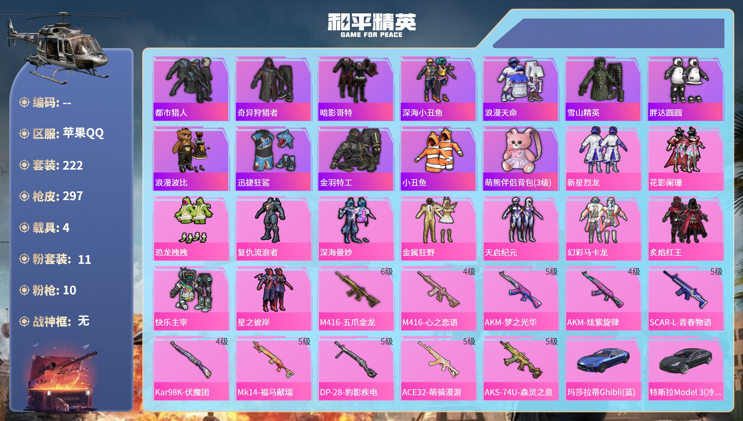 PX_2550017-苹果手Q-9王牌印记-11粉装-10特效枪-4载具-96749热力值-222套装-297枪皮-2卓越印记-1传奇印记 【11粉装】套装-恐龙拽拽,套装-新星烈龙,套装-快乐主宰,套装-天启纪元,套装-幻彩马卡龙,套装-星之彼岸,套装-炙焰红王,套装-花影阑珊,套装-金属狂野,套装-深海曼妙,角色-复仇流浪者 【10特效枪】AKM-梦之光华/5级,AKS-74U-森灵之息/5级,AKM-炫紫旋律/4级,M416-五爪金龙/6级,DP-28-豹影疾电/5级,Mk14-福马献瑞/5级,M416-心之恋语/4级,Kar98K-伏魔团/4级,ACE32-萌骑漫游/5级,SCAR-L-青春物语/5级 【12稀有紫装】都市猎人,奇异狩猎者,暗影哥特,深海小丑鱼,浪漫天命,雪山精英,胖达圆圆,浪漫波比,迅捷狂鲨,金羽特工,小丑鱼,萌熊伴侣背包(3级) 【4稀有载具】玛莎拉蒂Ghibli(蓝),特斯拉Model,3(冷光银),特斯拉Model,X(珍珠白),玛莎拉蒂MC20(星石白) 【222稀有时装】新星烈龙,花影阑珊,恐龙拽拽,复仇流浪者,深海曼妙,金属狂野,天启纪元,幻彩马卡龙,炙焰红王,快乐主宰,星之彼岸,迅捷龙虾,都市猎人,浪漫天命,奇异狩猎者,雪山精英,暗影哥特,深海小丑鱼,小丑鱼,金羽特工,迅捷狂鲨,胖达圆圆,浪漫波比,激萌罗小黑,狂沙舞者,潮萌小黄鸭,龙宫之主,萌趣咩咩,神秘黑猫,软萌银虎,海上生明月,4AM战队服,马上有钱,彩虹兔,琴音绮想,乐音,雪绒豹,画境星梦,朱霞炽焰,狂鲨锋刃,绛羽幽主,凌霄紫焰,擎苍青焰,元气之梦,书海巡游,薄荷星砂,云朵鹅,雪国风尚,青翼流星,SS35特训,迷域探索者,机械征服者,SS33特训,SS16特训,SS36特训,花式比心,英勇保护者,军械专家,拳皇97八神庵,云纹魔法士,黑色刀锋,冰爽风暴,云丝凤蟒,银河圣歌,极乐追光,闪耀星光,炫光向阳,雪兔飞飞,都市漫游者,虎虎生威吉莉,夏日音浪,龙的传人,军刀雅典娜,清香五月粽,软嫩糖心蛋,潮流炫酷,SS8特训,众神之王,智慧之神,白熊同盟,萌黄之夏,SS37特训,PEL摇滚竞梦者,摇滚狂鲨,特训学院,黄色运动,蓝色运动,飞驰魅影,白色伏地魔,音速流光,热血青春,SS9特训,白月香洋装,湖蓝色名流,黄色名流,漫步者,黑色伏地魔,炫蓝之夏,SS34特训,骑行爱好者,雪鹰学院,竞技名士,蓝色守护者,浑天鲲鹏,荷鲁斯之眼,长空猛禽,竞技勇士朋克,特战装甲,旭日情侣,灰色格斗者,六六大吉,甜蜜告白,街头潮人,怒火燎原,魅力单车,灼焰舞者,雪山征服者,青羽突袭者,夜莺强袭者,野性战魂,猎梦纪元,丛林猎人,甜心亚梦,虚音幻奏,传奇侦探,贵族骑装,幻世战舞者,特殊使命,街舞之王,街舞达人,青春校园,牛气满满,迎春赐吉,娇憨猪猪,冰川特警,潮流先锋,夏雨游龙,燃烧卡路里,滨海假日,荷畔雨呱,狙击之神,沙漠毒蛇,红釉青花,麻辣教官,鹰眼刺客,雨过天青,福马献瑞,冰冻风暴,玲珑侠影,完美偶像,梦魇先生,热血骑手,青春冒险家,潮流游乐家,疯狂小兔子,圣诞大吉,特战英豪,凛冬战士,北国孤狼,SS6特训,千禧之恋,神秘领域,炽焰拳师,格斗专家,耀眼新星,坚韧舞者,奇迹天团,淡雅花蕊,野性战心,玲珑飞花,原初圣火,超能勇士,逆风勇士,海岛探路者,跃动心情,SS7特训,核芯基因,精神漫游,霓虹街区,赛博空间,萌趣颜团子,SS10特训,特种颜团子,风华少年志,探宝勇士,SS12特训,SS18特训,SS13特训,SS17特训,瑞龙福将,团圆交子,金耀舞者,蓝调潮人,异彩先驱,机械哨兵,霓虹极客,空投萌叽,SS19特训,光之冒险,SS20特训,SS21特训,玉兔迎春,弄潮海豚,星河入梦,SS23特训,呆萌铁蟹,甜蜜熊情侣,缤纷果语,青涩年华,灿烂千阳,SS14特训,天籁歌者,格斗先锋,老实芭蕉,吉莉礼服,柠萌假日,鹤鸣,SS25特训,快乐星愿,星梦畅游,SS15特训,深蓝冒险家 【297稀有枪械】M416-五爪金龙/6级,M416-心之恋语/4级,AKM-梦之光华/5级,AKM-炫紫旋律/4级,SCAR-L-青春物语/5级,Kar98K-伏魔团/4级,Mk14-福马献瑞/5级,DP-28-豹影疾电/5级,ACE32-萌骑漫游/5级,AKS-74U-森灵之息/5级,Win94-乌木金纹,野牛-魔童闹海,敖闰,MK12-乌木金纹,ACE32-画境星梦,M1加兰德-画境星梦,MP5K-画境星梦,M762-云朵鹅,SVD-云朵鹅,SPAS-12-狂鲨锋刃,MK20-H-狂鲨锋刃,铝热弹-炫彩糖果,ARX-像素花束,大砍刀-像素花束,AA12-G-画境星梦,平底锅-画境星梦,M249-冰晶雪宝,JS9-凌霄紫焰,MG-36-凌霄紫焰,ARX-凌霄紫焰,AKS-74U-乌木金纹,AKM-涂鸦街区,P92-凌霄紫焰,Famas-乌木金纹,SPAS-12-云朵鹅,信号枪-异瞳寒姬,平底锅-凌霄紫焰,Mk14-薄荷星砂,AKS-74U-鸡智如我,沙漠之鹰-云朵鹅,烟雾弹-冰氧夏日,MG-36-薄荷星砂,大砍刀-云朵鹅,M24-天降萌叽,DBS-荧海星豚,AUG-紫晶流影,S12K-霓彩脉冲,M416-红色方程式,M416-神秘黑猫,M416-乌木金纹,M416-蓝色火焰,M416-夜灯,M416-月影鸳鸯,M416-快乐主宰,AKM-环太平洋,AKM-影袭,AKM-四圣焕新,AKM-奇异狩猎者,AKM-PEL轰鸣竞梦者,AKM-乌木金纹,AKM-星之彼岸,AKM-春暖花开,AKM-龙的传人,AKM-玉龙,AKM-天启纪元,AKM-虎虎生威,AKM-竞技角斗士,AKM-恐龙拽拽,AKM-星之信仰,AKM-萌趣颜团子,AKM-霓虹街区,AKM-沙漠守护者,SCAR-L-红色方程式,SCAR-L-玉兔迎春,SCAR-L-乌木金纹,SCAR-L-金风玉露,SCAR-L-黄金龙骨,SCAR-L-流星咚咚,SCAR-L-夜灯,SCAR-L-炫彩节奏,M16A4-快乐主宰,M16A4-红色方程式,M16A4-蓝色火焰,M16A4-龙虾霸霸,M16A4-幻世战舞者,M16A4-甜心亚梦,M16A4-魔法学院,M16A4-乌木金纹,GROZA-乌木金纹,GROZA-春暖花开,GROZA-黑色刀锋,GROZA-异彩先驱,GROZA-恐龙拽拽,GROZA-影袭,GROZA-彩虹符号,GROZA-生命誓言,AUG-乌木金纹,AUG-怪笑疯兔,AUG-甜蜜菠萝,AUG-灵符少年,AUG-流星咚咚,AUG-青春冒险家,QBZ-神秘黑猫,QBZ-飞驰魅影,QBZ-洛神天依,QBZ-原初圣火,QBZ-乌木金纹,QBZ-彩虹符号,M762-瑞龙福将,M762-镭射皇者