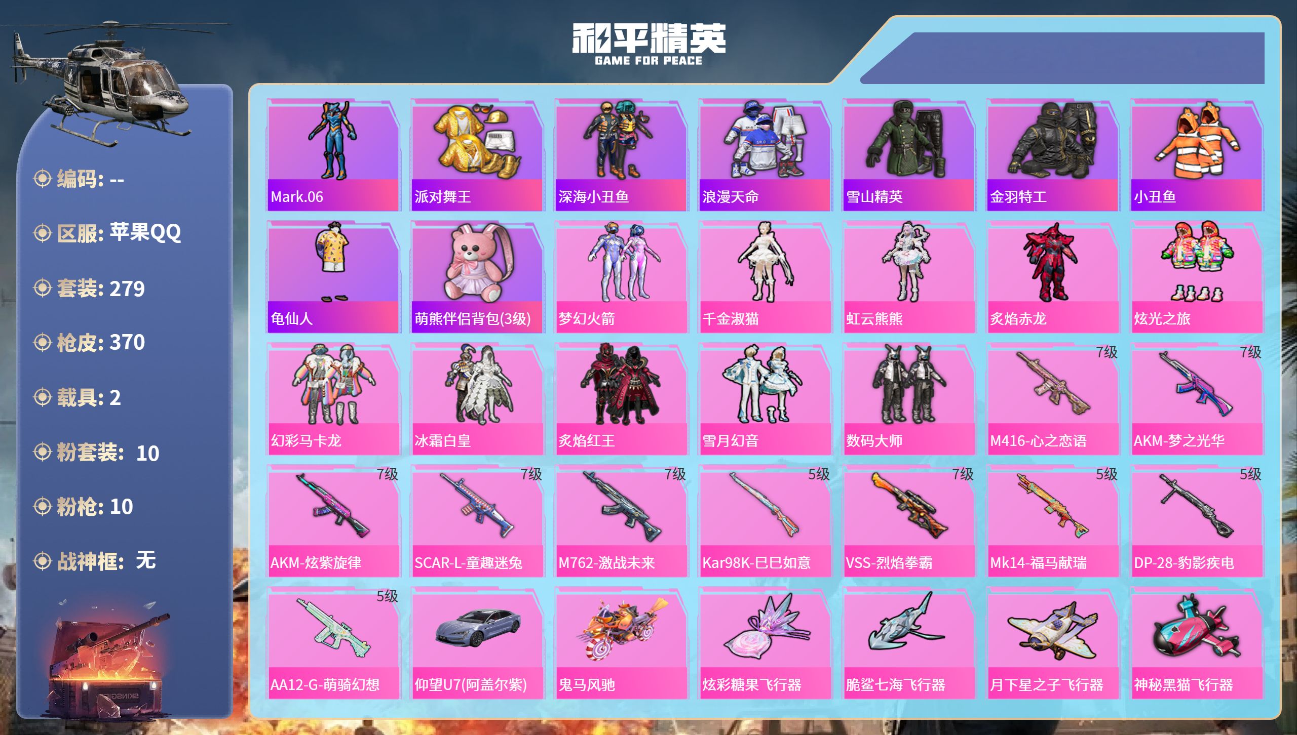 PX_2550024-苹果手Q-26王牌印记-10粉装-10特效枪-2载具-热力值-279套装-370枪皮-2卓越印记-2传奇印记 【10粉装】套装-梦幻火箭,套装-炙焰赤龙,角色-千金淑猫,套装-数码大师,套装-冰霜白皇,角色-虹云熊熊,套装-炫光之旅,套装-雪月幻音,套装-幻彩马卡龙,套装-炙焰红王 【10特效枪】Mk14-福马献瑞/5级,M416-心之恋语/7级,Kar98K-巳巳如意/5级,VSS-烈焰拳霸/7级,DP-28-豹影疾电/5级,AKM-梦之光华/7级,AKM-炫紫旋律/7级,SCAR-L-童趣迷兔/7级,M762-激战未来/7级,AA12-G-萌骑幻想/5级 【9稀有紫装】Mark.06,派对舞王,深海小丑鱼,浪漫天命,雪山精英,金羽特工,小丑鱼,龟仙人,萌熊伴侣背包(3级) 【2稀有载具】仰望U7(阿盖尔紫),鬼马风驰 【279稀有时装】梦幻火箭,千金淑猫,虹云熊熊,炙焰赤龙,炫光之旅,创世·幻影,幻彩马卡龙,冰霜白皇,炙焰红王,雪月幻音,数码大师,浪漫天命,龟仙人,Mark.06,雪山精英,深海小丑鱼,小丑鱼,金羽特工,派对舞王,激萌罗小黑,暴走罗小黑,狂沙舞者,绊爱,萌趣咩咩,海上生明月,龙魂突击队,卖崽青蛙,小熊娃娃,异域银装,星渊小夜曲,街头风暴,星途旅人,冰河战士,荒漠狂战,鱼渊荷华,青团波波,大橘大利,燕燕于飞,海琴烟,风玲,战术大师,智谋强哥,诡面顽熊,雏菊兔兔,马上有钱,糖糖葫芦,香桃花海,蝶变,粉日山川,棉花软糖,月烬之祷,午间小调,狂鲨锋刃,炫彩糖果,萌鸡速递,风迹短诗,薄荷星砂,秘语星愿,顶瓜瓜,雪国风尚,恋语绒绒,青翼流星,SS35特训,迷域探索者,机械英豪,机械征服者,SS29特训,萝兰蝴蝶,SS5特训,SS31特训,SS33特训,SS32特训,SS16特训,暴风机械师,时空追击者,SS36特训,暗夜傀儡,军械专家,醒狮腾龙,菲菲,决胜时刻,云纹魔法士,金鼠迎春,翡翠奔狼,黑色刀锋,爆裂葡萄,福星高照,纯白誓言,都市漫游者,虎虎生威吉莉,夏日音浪,龙的传人,军刀雅典娜,软嫩糖心蛋,潮流炫酷,SS8特训,众神之王,甜梦熊熊,智慧之神,白熊同盟,青玉碎影,萌黄之夏,黄色格斗者,SS37特训,PEL摇滚竞梦者,破晓情侣,SS28特训,特训学院,猎鹰,青年教官,橘黑制服,红色运动,黄色运动,蓝色运动,5.56爱好者,黄色伏地魔,飞驰魅影,白色伏地魔,音速流光,热血青春,冰川格斗者,SS9特训,酒红色名流,阳光火鸡,湖蓝色名流,黄色名流,酷潮明星,绯格组合,涂山之恋,SS26特训,迅猛虎鲸,空岛之星,黑色伏地魔,黎明保卫者,元气发射,SS34特训,竞技名士,蓝色守护者,深蓝色名流,灰色守护者,猛禽,雨林探路者,SS30特训,长空猛禽,沙漠探路者,竞技勇士朋克,特战装甲,战地菁英,旭日情侣,灰色格斗者,甜蜜告白,街头潮人,怒火燎原,冷焰舞者,惊鸿侠骨,魅力单车,灼焰舞者,夜莺强袭者,野性战魂,丛林猎人,甜心亚梦,SS2特训,虚音幻奏,传奇侦探,浪漫假日,极地朋克,幻世战舞者,粉甜马卡龙,青涩时光,特种空勤,战地名士,牛气满满,娇憨猪猪,春日漫步,冰川特警,龙腾端午,燃烧卡路里,狙击之神,麻辣教官,福马献瑞,SS3特训,完美偶像,SS11特训,人气偶像,SS4特训,幻影武者,青春冒险家,潮流游乐家,疯狂小兔子,青龙圣者,圣诞大吉,梦幻奶油,北国孤狼,SS6特训,拳皇97草薙京,神秘领域,炽焰拳师,绮丽涂鸦,格斗专家,坚韧舞者,竞技达人朋克,野性战心,原初圣火,逆风勇士,海岛探路者,跃动心情,初火先锋,SS7特训,核芯基因,精神漫游,和煦暖阳,霓虹街区,田园牧歌,萌趣颜团子,轻风白浪,SS10特训,特种颜团子,沙漠兵团,镭射皇者,耀粉歌者,水手小飞鸭,探宝勇士,照水倚天,SS12特训,SS27特训,牛气冲天,迅捷之星,SS18特训,治愈之星,银白舞王,科技之星,SS13特训,飞行日记,SS17特训,瑞龙福将,团圆交子,异彩先驱,霓虹极客,空投萌叽,SS19特训,光之冒险,SS20特训,SS21特训,玉兔迎春,弄潮海豚,SS22特训,SS23特训,呆萌铁蟹,浪漫樱花,甜蜜熊情侣,缤纷果语,滨海厨神,香榭午后,SS14特训,天籁歌者,神气柴柴,灵蜜圈圈,妙红点点,幻彩翩翩,格斗先锋,海盐绵绵冰,老实芭蕉,冷血极客,吉莉礼服,游猎者,刚毅裁决者,SS1特训,王牌教练,荣耀,柠萌假日,SS24特训,鹤鸣,懵萌河马,SS25特训,初雨海棠,锦衣飞扬,金环蜂王,SS15特训,深蓝冒险家 【370稀有枪械】M416-心之恋语/7级,AKM-梦之光华/7级,AKM-炫紫旋律/7级,SCAR-L-童趣迷兔/7级,M762-激战未来/7级,Kar98K-巳巳如意/5级,VSS-烈焰拳霸/7级,Mk14-福马献瑞/5级,DP-28-豹影疾电/5级,AA12-G-萌骑幻想/5级,DBS-乌木金纹,P1911-创世·救赎,SCAR-L-海盐豹豹,GROZA-海盐豹豹,野牛-雏菊兔兔,Mk14-冰河战士,平底锅-雏菊兔兔,M762-雏菊兔兔,Mini14-雏菊兔兔,R1895-雏菊兔兔,Mk47-极冰使者,UZI-冰河战士,M16A4-冰河战士,MK20-H-乌木金纹,DBS-风迹短诗,莫辛纳甘-风迹短诗,Win94-乌木金纹,MK12-风迹短诗,MK12-乌木金纹,MG3-霓彩脉冲,DBS-幻彩电音,蜜獾-乌木金纹,SPAS-12-狂鲨锋刃,M417-玩趣呆呆,MK20-H-狂鲨锋刃,铝热弹-炫彩糖果,UZI-炫彩糖果,M249-冰晶雪宝,Mk47-风迹短诗,燃烧瓶-甜梦桃焰,破片手榴弹-海盐豹豹,UMP45-海盐豹豹,AKS-74U-乌木金纹,蜜獾-风迹短诗,SKS-棋盘冕主,Famas-乌木金纹,Famas-霓彩脉冲,破片手榴弹-拽到爆炸,十字弩-异瞳寒姬,S1897-糯团青竹,信号枪-异瞳寒姬,Mk14-薄荷星砂,烟雾弹-冰氧夏日,MG-36-薄荷星砂,PKM-啾咪啾咪,SLR-霓彩脉冲,平底锅-属我最6,S12K-霓彩脉冲,AKM-霓彩脉冲,M416-红色方程式,M416-乌木金纹,M416-蓝色火焰,M416-夜灯,M416-糯团青竹,M416-暗夜行者,M416-月影鸳鸯,M416-绯红前夜,AKM-夜灯,AKM-百万伏特,AKM-四圣焕新,AKM-生命誓言,AKM-乌木金纹,AKM-彩虹符号,AKM-缤纷海域,AKM-破晓战魂,AKM-龙的传人,AKM-玉龙,AKM-灼热熔岩,AKM-虎虎生