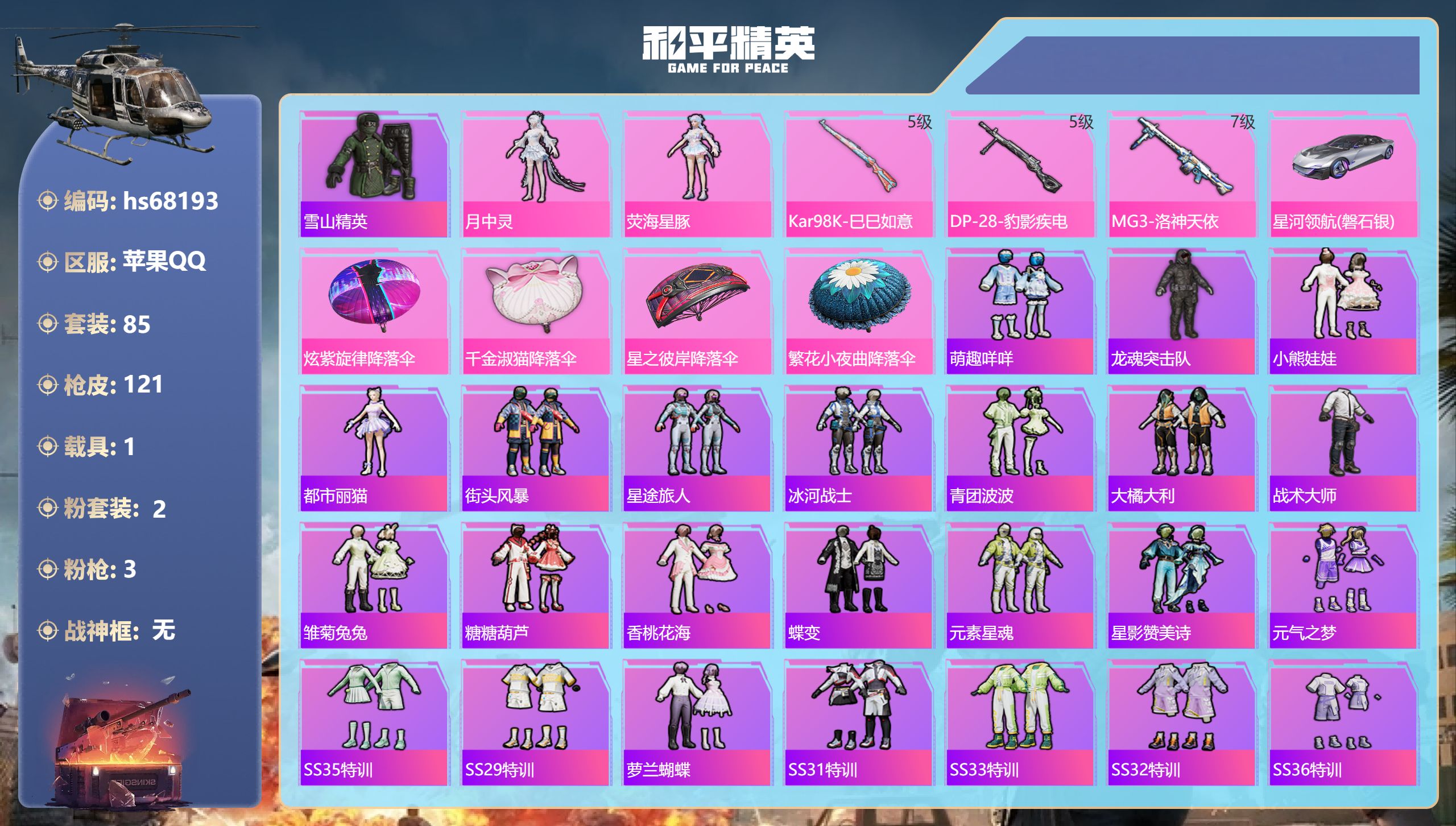 PX_2550030-,苹果手Q-10王牌印记-2粉装-3特效枪-1载具-35824热力值-85套装-121枪皮-1卓越印记 【2粉装】角色-月中灵,角色-荧海星豚 【3特效枪】MG3-洛神天依/7级,Kar98K-巳巳如意/5级,DP-28-豹影疾电/5级 【1稀有紫装】雪山精英 【1稀有载具】星河领航(磐石银) 【85稀有时装】月中灵,荧海星豚,雪山精英,萌趣咩咩,龙魂突击队,小熊娃娃,都市丽猫,街头风暴,星途旅人,冰河战士,青团波波,大橘大利,战术大师,雏菊兔兔,糖糖葫芦,香桃花海,蝶变,元素星魂,星影赞美诗,元气之梦,SS35特训,SS29特训,萝兰蝴蝶,SS31特训,SS33特训,SS32特训,SS36特训,拳皇97八神庵,新侠客行,都市漫游者,虎虎生威吉莉,龙的传人,青玉碎影,SS37特训,SS28特训,红色运动,热血青春,SS9特训,阳光火鸡,SS34特训,骑行爱好者,竞技名士,蓝色守护者,SS30特训,长空猛禽,竞技勇士朋克,战地菁英,甜蜜告白,街头潮人,魅力单车,丛林猎人,传奇侦探,特殊使命,牛气满满,娇憨猪猪,狙击之神,红釉青花,麻辣教官,雨过天青,青春冒险家,破蛋小黄鸡,圣诞大吉,北国孤狼,SS6特训,炽焰拳师,格斗专家,耀眼新星,跃动心情,SS7特训,破晓战魂,都市魅力,耀粉歌者,SS12特训,SS18特训,SS13特训,团圆交子,SS19特训,SS21特训,玉兔迎春,SS22特训,缤纷果语,老实芭蕉,快乐星愿,星梦畅游,舞夜骑士 【122稀有枪械】Kar98K-巳巳如意/5级,DP-28-豹影疾电/5级,MG3-洛神天依/7级,DBS-乌木金纹,野牛-雏菊兔兔,Mk14-冰河战士,平底锅-雏菊兔兔,M762-雏菊兔兔,Mini14-雏菊兔兔,R1895-雏菊兔兔,UZI-冰河战士,M16A4-冰河战士,MK20-H-乌木金纹,MK12-乌木金纹,MG3-霓彩脉冲,蜜獾-乌木金纹,M249-绯穹魔姬,MK20-H-狂鲨锋刃,ARX-像素花束,大砍刀-像素花束,AKS-74U-乌木金纹,Famas-乌木金纹,S1897-糯团青竹,信号枪-异瞳寒姬,MG3-智耀战神,M416-乌木金纹,AKM-乌木金纹,AKM-星之彼岸,AKM-霓虹街区,SCAR-L-玉兔迎春,SCAR-L-乌木金纹,SCAR-L-炫彩节奏,M16A4-幻世战舞者,M16A4-乌木金纹,GROZA-春暖花开,GROZA-银河战甲,AUG-乌木金纹,AUG-耀粉歌者,QBZ-彩虹符号,M762-拳皇97,M762-牛气冲天,M762-天降萌叽,Mk47-乌木金纹,G36C-乌木金纹,AC-VAL-天降萌叽,AC-VAL-彩虹甜喵,AC-VAL-乌木金纹,蜜獾-娇憨猪猪,Kar98K-红色方程式,Kar98K-洛神天依,AWM-天降萌叽,AWM-雷霆特警,AWM-飒粉甜心,莫辛纳甘-乌木金纹,SKS-夜灯,SKS-炫彩节奏,VSS-星之彼岸,VSS-彩虹符号,Mini14-耀粉歌者,Mini14-炫彩节奏,SLR-娇憨猪猪,UZI-魔法学院,UZI-娇憨猪猪,UMP45-乌木金纹,Vector-乌木金纹,Vector-生命誓言,汤姆逊-耀粉歌者,汤姆逊-幻影战神,汤姆逊-乌木金纹,野牛-乌木金纹,P90-乌木金纹,S686-乌木金纹,S686-红色方程式,S686-生命誓言,S1897-炫彩节奏,S12K-玩趣呆呆,S12K-娇憨猪猪,DBS-彩虹甜喵,M249-糯团青竹,M249-拳皇97,M249-星之彼岸,DP-28-彩虹符号,MG3-幻世战舞者,MG3-乌木金纹,P92-拳皇97,平底锅-光之冒险,平底锅-娇憨猪猪,平底锅-拳皇97,撬棍-传奇侦探,Kar98K-顶峰精英,MG3-火熔核心,Win94-拳皇·狂花道,R45-拳皇·狂花道,蝎式手枪-千金淑猫,S686-千金淑猫,AUG-异域银装,UMP45-绒宝小鹅,MK20-H-糖糖葫芦,MK20-H-星途旅人,M200-乌木金纹,十字弩-异域银装,SCAR-L-星途旅人,蜜獾-糖糖葫芦,UMP45-糖糖葫芦,SPAS-12-乌木金纹,平底锅-糖糖葫芦,破片手榴弹-星途旅人,M16A4-雨过天青,AMR-雨过天青,SLR-乌木金纹,AA12-G-雨过天青,PKM-雨过天青,沙漠之鹰-雨过天青,燃烧瓶-福马献瑞,P90-紫矿核心,P18C-糖糖葫芦,SPAS-12-福马献瑞,VSS-香桃花海,Mini14-香桃花海,汤姆逊-像素花束,P90-巳巳如意,MG3-火熔核心 【3稀有飞行器】马上有福飞行器,粉色滑翔尾迹,顶峰精英尾迹 【17稀有背包】桃粉嫣然背包(3级),破晓战魂背包(3级),糖糖葫芦背包(3级),虎虎生威背包(3级),蝶变背包(3级),仲夏莫吉托背包(3级),千金淑猫背包(3级),异域银装背包(3级),星之彼岸背包(3级),雏菊兔兔背包(3级),香桃花海背包(3级),雷霆特警背包(3级),玉兔迎春背包(3级),暗夜武装背包(3级),冰河战士背包(3级),SS8赛季背包(3级),SS7赛季背包(3级) 【37稀有降落伞】SS32王牌降落伞,雨过天青降落伞,SS34王牌降落伞,SS33王牌降落伞,一举夺葵降落伞,霓虹街区降落伞,尼罗河传说降落伞,月下萌萌兔降落伞,炫紫旋律降落伞,SS6王牌降落伞,紫菱降落伞,钢铁雄心降落伞,蝶舞翩翩降落伞,丛林猎人降落伞,绿草茵茵降落伞,青羽降落伞,天涯共此时降落伞,拳皇97降落伞,普通降落伞,千金淑猫降落伞,化学天才降落伞,闻鸡启五降落伞,SS29王牌降落伞,九霄降落伞,星途旅人降落伞,异域银装降落伞,娇憨猪猪降落伞,雏菊兔兔降落伞,糖糖葫芦降落伞,SS21王牌降落伞,香桃花海降落伞,勇者同行降落伞,冰河战士降落伞,星之彼岸降落伞,电竞之星降落伞,2024龙跃降落伞,繁花小夜曲降落伞 【13稀有头盔】星之彼岸头盔(3级),糖糖葫芦头盔(3级),折纸暴龙头盔(3级),千金淑猫头盔(3级),异域银装头盔(3级),荒原烈焰头盔(3级),虹云熊熊头盔(3级),雷霆特警头盔(3级),香桃花海头盔(3级),拳皇97头盔(3级),冰河战士头盔(3级),雏菊兔兔头盔(3级),洛神天依头盔(3级)