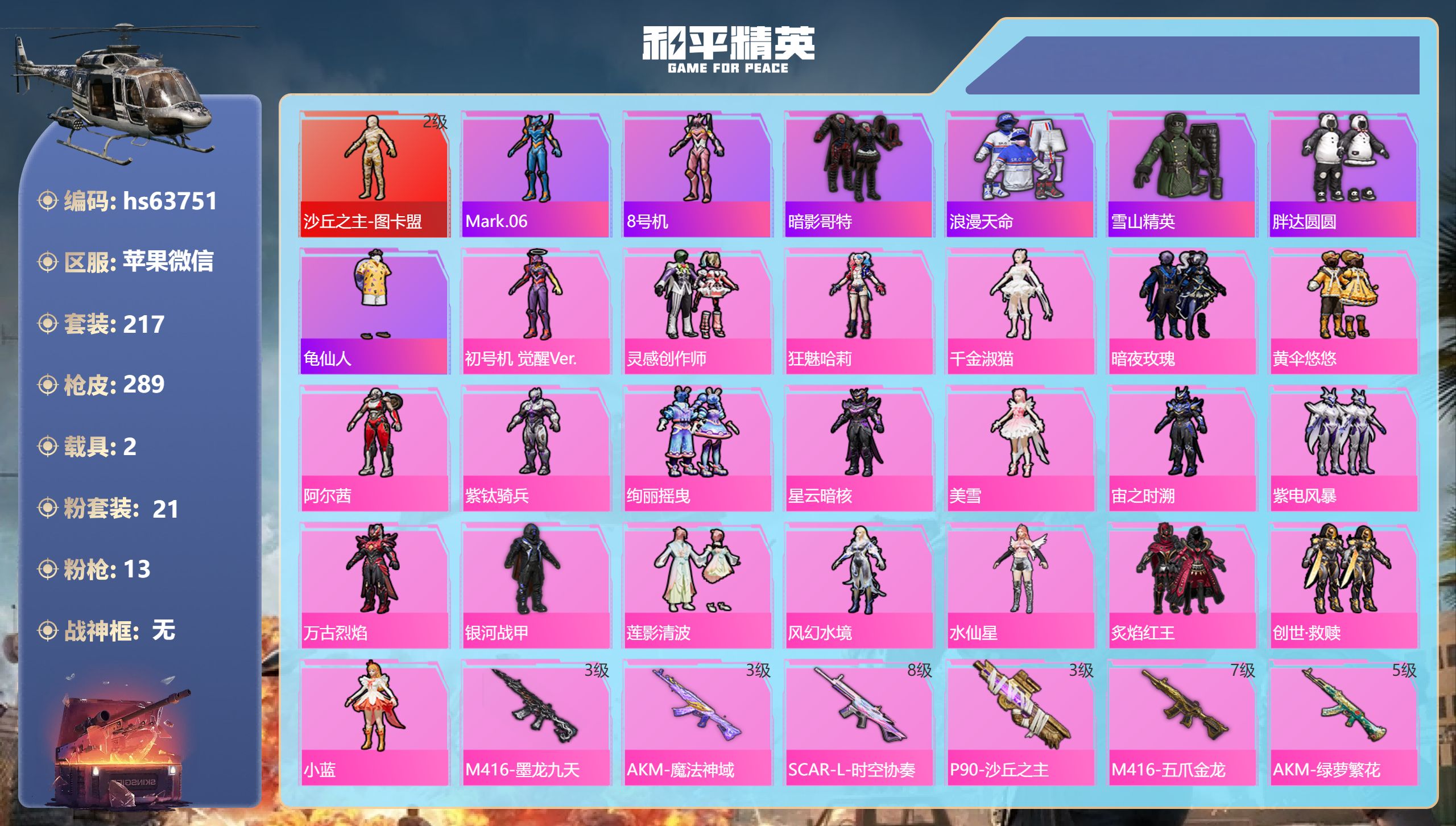 PX_2553862-,苹果微信-11王牌印记-1红装-21粉装-13特效枪-2载具-94268热力值-217套装-289枪皮-4卓越印记-2传奇印记 【1红装】沙丘之主-图卡盟/2级 【21粉装】套装-灵感创作师,角色-紫钛骑兵,角色-狂魅哈莉,套装-炙焰红王,角色-水仙星,角色-万古烈焰,套装-黄伞悠悠,角色-初号机,觉醒Ver.,角色-千金淑猫,套装-紫电风暴,角色-宙之时溯,角色-阿尔茜,角色-风幻水境,角色-星云暗核,角色-美雪,套装-创世·救赎,套装-莲影清波,套装-暗夜玫瑰,角色-小蓝,套装-绚丽摇曳,套装-银河战甲 【13特效枪】ACE32-萌骑漫游/1级,Mk14-福马献瑞/1级,GROZA-镜光银凌/4级,AKM-绿萝繁花/5级,SLR-暗夜玫瑰/4级,Kar98K-巳巳如意/4级,M416-五爪金龙/7级,AKM-魔法神域/3级,M24-魔法神域/4级,P90-沙丘之主/3级,SCAR-L-桃夭倾城/1级,SCAR-L-时空协奏/8级,M416-墨龙九天/3级 【7稀有紫装】Mark.06,8号机,暗影哥特,浪漫天命,雪山精英,胖达圆圆,龟仙人 【2稀有载具】星河领航(磐石银),疾风龙骑 【217稀有时装】图卡盟/2级,初号机,觉醒Ver.,灵感创作师,狂魅哈莉,千金淑猫,暗夜玫瑰,黄伞悠悠,阿尔茜,紫钛骑兵,绚丽摇曳,星云暗核,美雪,创世·幻影,宙之时溯,紫电风暴,万古烈焰,银河战甲,莲影清波,风幻水境,水仙星,炙焰红王,创世·救赎,小蓝,浪漫天命,龟仙人,Mark.06,雪山精英,暗影哥特,8号机,胖达圆圆,奇趣企鹅,激萌罗小黑,暴走罗小黑,狂战萌兔,萌神柯基,粉雾星云,龙魂突击队,铁血战翼,迎夏光舞,火种守卫者,都市丽猫,神气赞萌露比,街头风暴,星途旅人,冰河战士,鱼渊荷华,创世·追猎,青团波波,燕燕于飞,战术大师,听雨铃兰,雏菊兔兔,马上有钱,糖糖葫芦,香桃花海,米开朗基罗,蝶变,巳巳如意,曼妙人鱼,棉花软糖,元素星魂,彩虹兔,雪绒豹,诡诞巡游,混沌火种,蓝海鲸歌,云朵鹅,机械英豪,机械征服者,SS29特训,萝兰蝴蝶,SS5特训,SS31特训,SS33特训,SS32特训,SS16特训,华灯初上,暴风机械师,时空追击者,SS36特训,贝斯之夜,云虎纪,红酒骑士,忠义严颜,曹焱兵,金鼠迎春,彩霞狙击,黑色刀锋,忠猛周仓,纯白誓言,都市漫游者,龙的传人,潮流炫酷,SS8特训,影双刃,SS37特训,海滨突袭者,SS28特训,S6赛事,猎鹰,青年教官,幻彩战盾,红色运动,蓝色运动,黄色伏地魔,白色伏地魔,热血青春,爆竹金鼠,太极红客,酒红色名流,黄色名流,酷潮明星,茉莉之诺,涂山之恋,幻世尖兵,伏击者,抹茶蜜豆,SS26特训,漫步者,空岛之星,热情海星,黑色伏地魔,黎明保卫者,纯真浪花,SS34特训,骑行爱好者,蓝色守护者,雨林探路者,忠真马岱,SS30特训,长空猛禽,竞技勇士朋克,灰色格斗者,甜蜜告白,街头潮人,冷焰舞者,惊鸿侠骨,魅力单车,青羽突袭者,春光漫游,丛林猎人,SS2特训,派对绅士,传奇侦探,极地朋克,甜蜜菠萝,青春校园,牛气满满,冰川特警,燃烧卡路里,狙击之神,红釉青花,鹰眼刺客,雨过天青,冰冻风暴,完美偶像,SS11特训,SS4特训,热血骑手,破蛋小黄鸡,疯狂小兔子,圣诞大吉,特战英豪,快闪甜心,北国孤狼,SS6特训,拳皇97草薙京,炽焰拳师,格斗专家,耀眼新星,坚韧舞者,跃动心情,SS7特训,核芯基因,精神漫游,霓虹街区,田园牧歌,萌趣颜团子,轻风白浪,SS10特训,特种颜团子,镭射皇者,风华少年志,星夜迷魅,SS12特训,王子的夏天,白啸长虹,牛气冲天,紫芒星,银白舞王,SS13特训,飞行日记,机械兔法师,晨曦薄雾,绝对偶像,SS22特训,SS23特训,夏日倾情,甜蜜熊情侣,缤纷果语,莱茵河畔,SS14特训,神气柴柴,妙红点点,幻彩翩翩,老实芭蕉,刚毅裁决者,SS1特训,粉红小猪,SS24特训,鹤鸣,懵萌河马,短笛,SS25特训,锦衣飞扬,星梦畅游,SS15特训 【289稀有枪械】M416-墨龙九天/3级,AKM-魔法神域/3级,SCAR-L-时空协奏/8级,P90-沙丘之主/3级,M416-五爪金龙/7级,AKM-绿萝繁花/5级,SCAR-L-桃夭倾城/1级,GROZA-镜光银凌/4级,Kar98K-巳巳如意/4级,M24-魔法神域/4级,Mk14-福马献瑞/1级,SLR-暗夜玫瑰/4级,ACE32-萌骑漫游/1级,S1897-青蛇行歌,AKS-74U-白蛇盈舞,QBZ-纯真浪花,AWM-纯真浪花,汤姆逊-纯真浪花,DBS-乌木金纹,AA12-G-纯真浪花,平底锅-纯真浪花,P1911-创世·救赎,Mk14-电光马卡龙,Famas-墨龙九天,AMR-墨龙九天,SLR-墨龙九天,Vector-创世·救赎,撬棍-朗基努斯之枪,突击盾牌-初号机,觉醒Ver.,DBS-创世·救赎,QBZ-萌萌彩虹球,MK20-H-星梦奇缘,SCAR-L-海盐豹豹,野牛-青蛇行歌,GROZA-海盐豹豹,SLR-金丰海韵,野牛-雏菊兔兔,Mk14-冰河战士,平底锅-雏菊兔兔,M762-雏菊兔兔,Mini14-雏菊兔兔,M200-宇宙意志,R1895-雏菊兔兔,莫辛纳甘-兔兔小魔女,平底锅-魔法神域,UZI-冰河战士,Famas-涂鸦旋风,M16A4-冰河战士,MK20-H-乌木金纹,MK12-乌木金纹,M762-云朵鹅,SVD-云朵鹅,Famas-乌木金纹,SPAS-12-云朵鹅,M249-无面战甲,沙漠之鹰-云朵鹅,烟雾弹-冰氧夏日,MG-36-薄荷星砂,大砍刀-云朵鹅,M200-爆裂游戏,DBS-荧海星豚,P1911-无面战甲,M416-仓鼠灰灰,M416-乌木金纹,M416-糯团青竹,M416-动感兔斯基,M416-摩登王国,AKM-夜灯,AKM-乌木金纹,AKM-春暖花开,AKM-龙的传人,AKM-玉龙,AKM-萌趣颜团子,AKM-霓虹街区,SCAR-L-红色方程式,SCAR-L-甜蜜誓约,SCAR-L-炫彩节奏,SCAR-L-是爱神辣,SCAR-L-生命誓言,M16A4-机械英豪,M16A4-幻世战舞者,M16A4-夜灯,M16A4-生命誓言,GROZA-守护天翼,GROZA-黑色刀锋,GROZA-影袭,GROZA-田园牧歌,GROZA-懵萌河马,GROZA-彩虹符号,GROZA-罗小黑,GROZA-银河战甲,AUG-乌木金纹,AUG-耀粉歌者,AUG-幻梦音符,AUG-魔法学院,AUG-闲梦青缨,AUG-终结者,AUG-天降萌叽,QBZ-彩虹符号,M762-镭射皇者,M762-拳皇97,M762-牛气冲天,M762-甜心宝贝,M762-奇异狩猎者,M762-天降萌叽,Mk47-百万伏特,Mk47-炫光之旅,Mk47-