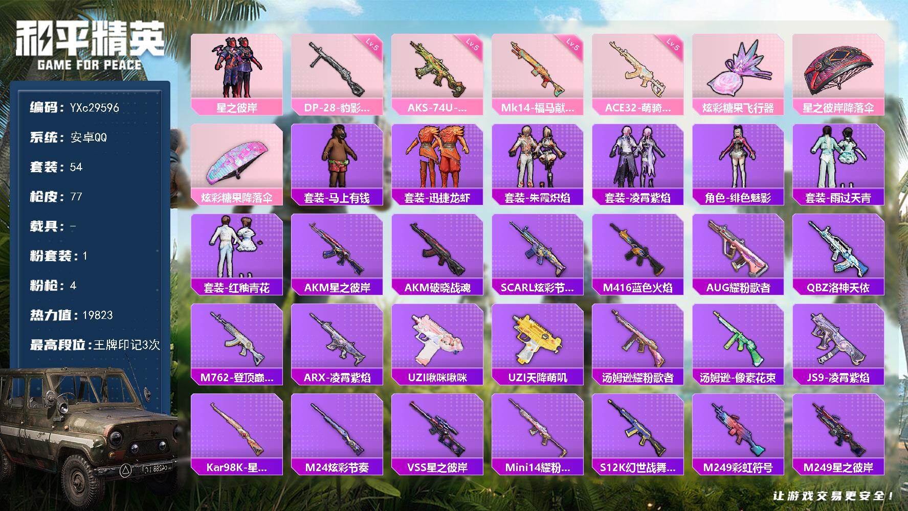 PX_2559216-法号地铁满天赋1载具-2粉装-7特效枪,M416-风花雪月[5级]】安卓手Q-1载具-2粉装-7特效枪-105套装-138枪皮-3王牌印记-不朽星钻Ⅴ-38992热力值【1载具】永恒黄蜂【2粉装】角色-复仇流浪者,蜜桃特工【7特效枪】DP-28-豹影疾电[5级],UMP45-萌骑冒险[2级],AKS-74U-森灵之息[5级],Mk14-福马献瑞[5级],M416-风花雪月[5级],Mk1