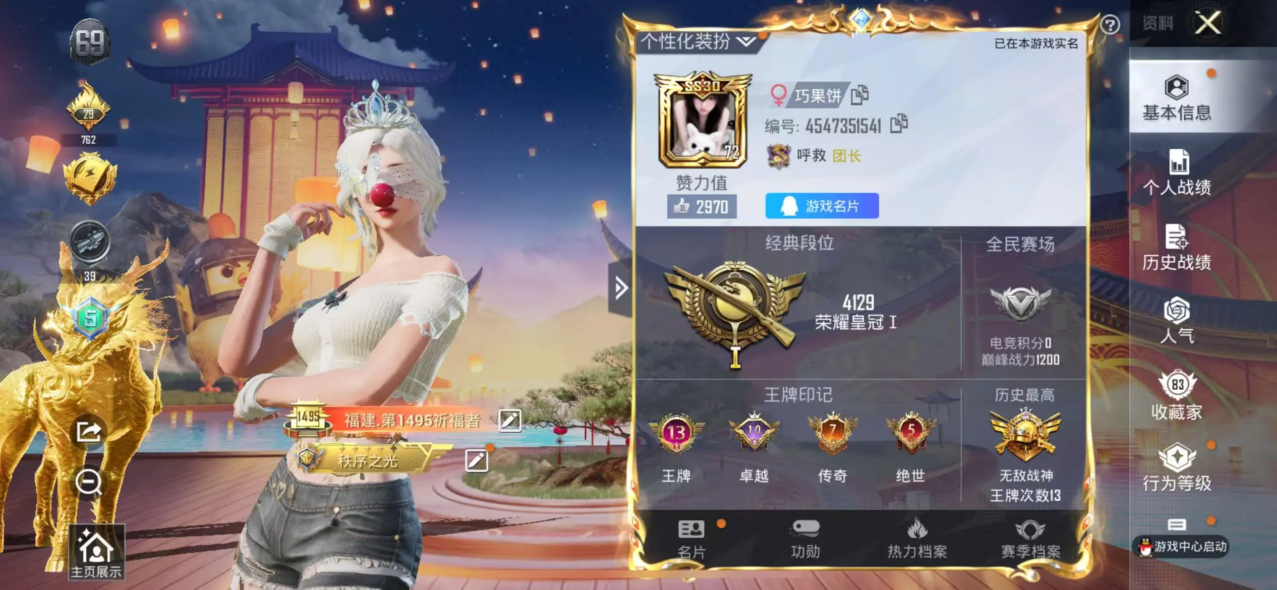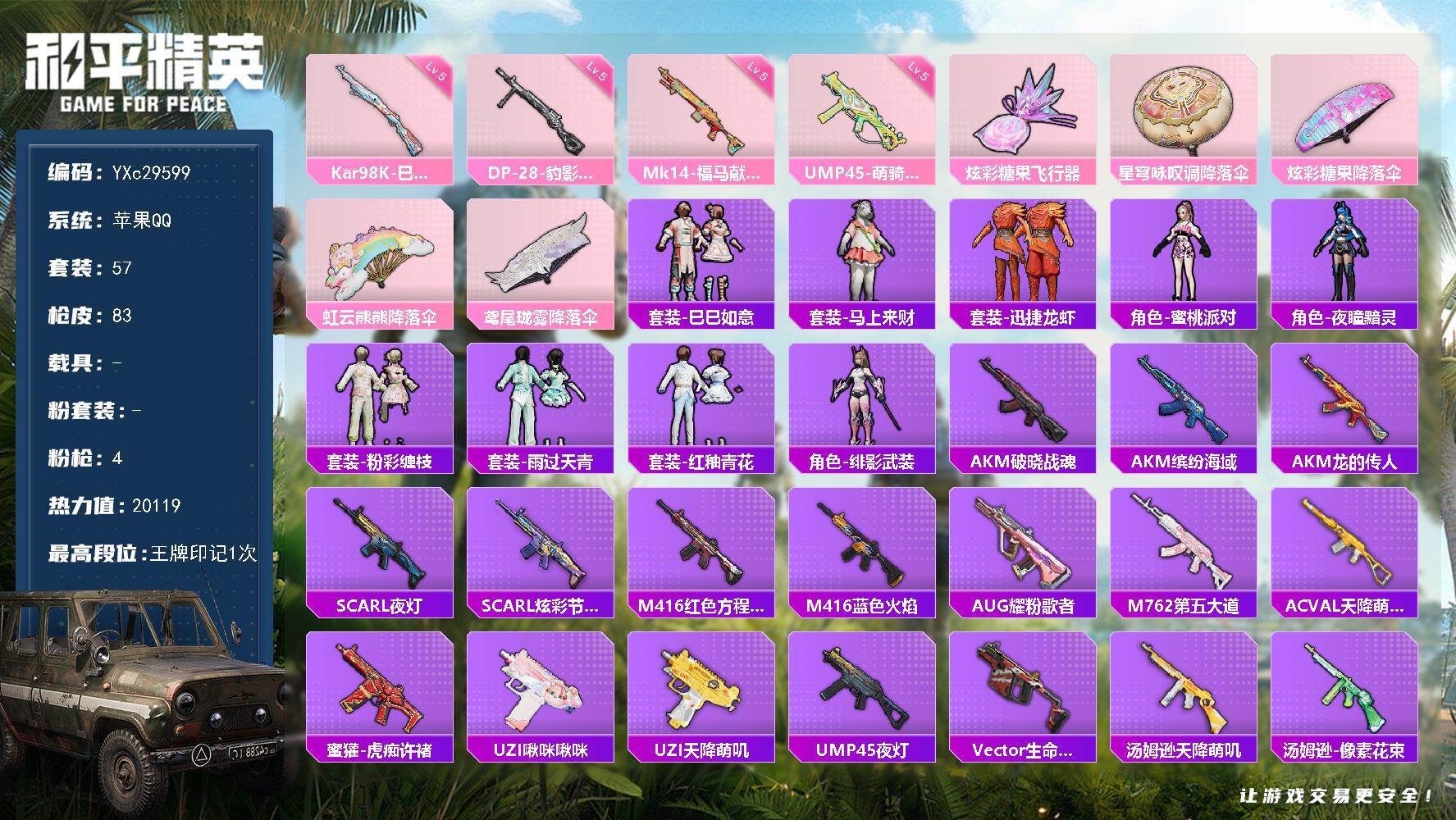 PX_1953604-(可二次实名),苹果Q-112017热力值,13王牌印记,(极品公主号,战神框,绝世印记,瑞拉,欧若拉,巧克力,雪国,小丑,猪妹,小狐,暖熊萌萌,纯白跃动,蓝调潮影,晶辉守护,晶灵使者,小番茄,马卡龙,圆圆,兔兔白日梦,小黄鸭,金鞋子,粉熊包,红鼻子)历史无敌战神,211套装,269枪皮,【5载具】,宾利BATUR(极速紫),玛莎拉蒂粉色,星梦玉骢,护世瑞兽,圣域龙宝僚机,【2神装】,圣域龙灵-瑞拉,(2级),镜域双华-欧若拉,(1级),【5稀有】,奇异狩猎者,AKM-缤纷海域,浪漫天命,派对舞王,派对舞王(金靴子),【33粉装】,圣堂之誓,梦幻火箭,雪国幻梦,蜜语绒猫,宝贝奶油派,天使彩虹糖,甜心巧克力,千金淑猫,小叽联名款,怪诞乔克,宙之时溯,酣梦娃娃,静灵氛围,智能音符,缤纷油彩,放客神游,新星烈龙,星空之魅,冰川幽秘,暗夜鎏金,绚金战神,童趣迷兔,暖熊萌萌,霁雪冰心,傲雪凌霜,甜梦小狐,馨动时刻,蜜桃特工,独舞天鹅,暗夜玫瑰,彩虹鹿灵,寒光使者,复仇流浪者,【21特效枪】,SCAR-L-梦幻火箭,(5级),Kar98K-圣域龙灵,(1级),Kar98K-巳巳如意,(5级),AWM-橘柚倾心,(3级),MG-36-幻梦之森,(2级),DP-28-千金淑猫,(2级),蜜獾-辉耀战甲,(1级),AUG-超新星,(6级),AMR-智耀战神,(3级),M24-镜域双华,(2级),UZI-绮梦青鸾,(5级),UMP45-相思残雪,(5级),M416-暖熊萌萌,(4级),AKM-梦之光华,(5级),P90-粉樱探戈,(4级),Vector-灵感创作师,(4级),M249-绒雪飘舞,(2级),GROZA-焦糖拿铁,(5级),SCAR-L-青春物语,(1级),破片手榴弹-热量炸弹,(5级),烟雾弹-丁香清露,(4级),【5飞行器】,龙翔九天飞行器,梦幻火箭飞行器,星之信仰飞行翼,绒雪飘舞飞行器,圣光天使飞行器,【29热门】,龟仙人,红熊茄茄,青涩年华,动感兔斯基,潮萌小黄鸭,呆萌铁蟹,鹰眼刺客,兔兔白日梦,激萌罗小黑,迅捷狂鲨,深海小丑鱼,胖达圆圆,胖达团团,暗夜契约,暗影哥特,纯白誓言,粉红小猪,狂沙舞者,漫步者,破蛋小黄鸡,军刀雅典娜,英勇保护者,弄潮海豚,AKM-奇异狩猎者,M762-奇异狩猎者,M24-奇异狩猎者,S686-奇异狩猎者,MK47-林间仙鹿,GROZA-林间仙鹿,【5头盔】,雪国精灵头盔,甜心宝贝头盔,幻影战神头盔,深海小丑鱼头盔,甜蜜誓约头盔,【7背包】,梦幻火箭背包,雪国精灵背包,甜心宝贝背包,萌熊伴侣背包,深海小丑鱼背包,花间之火背包,夏日绵绵冰背包,营地ID:901398386,