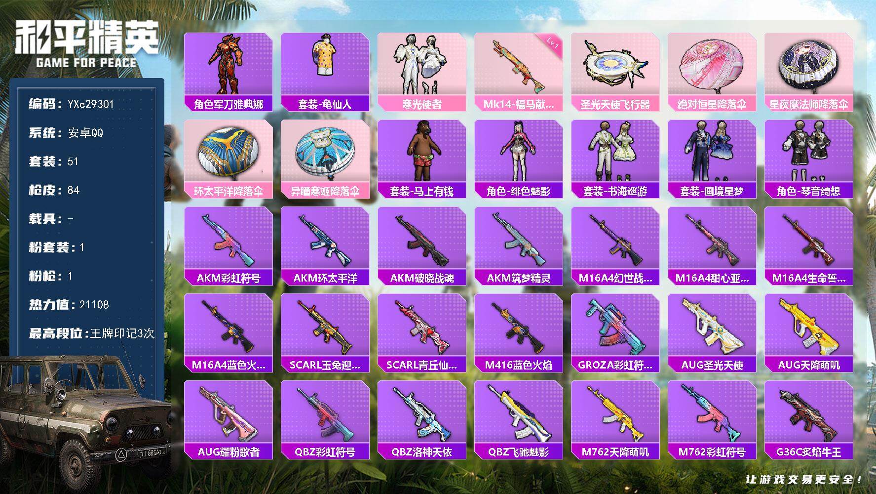 PX_2556201-1-【无二次协助处理】【因赛季更新游戏段付以上号为准!】 安卓Q-1粉装1特效枪5热门51套装84枪皮,,3印记,历史超级王牌1星, 【1粉装】,寒光使者, 【1特效枪】,Mk14-福马献瑞,(1级), 【5热门】,龟仙人,雪山精英,破蛋小黄鸡,军刀雅典娜,英勇保护者, 【1飞行器】,圣光天使飞行器,