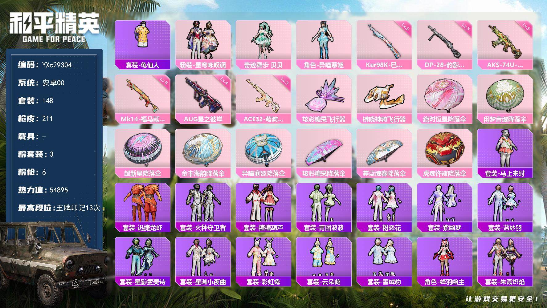 PX_2556243-0载具-131套装-209枪皮-4粉装9特效枪6热门131套装209枪皮,52396热力值,7印记,历史超级王牌12星,【4粉装】,绯穹魔姬,炫光之旅,罪夜之冕,智耀战神,【9特效枪】,AKS-74U-森灵之息,(5级),Kar98K-巳巳如意,(5级),MG-36-沧焰双生,(5级),DP-28-豹影疾电,(5级),Mk14-樱桃泡泡,(5级),Mk14-福马献瑞,(5级),UMP45-萌骑冒险,(2级),ACE32-萌骑漫游,(2级),【6热门】,小丑鱼,梦魇先生,豚鼠丹丹,漫步者,破蛋小黄鸡,极速红龙,【1头盔】,金羽特工头盔,【1背包】,梦幻火箭背包,营地ID: