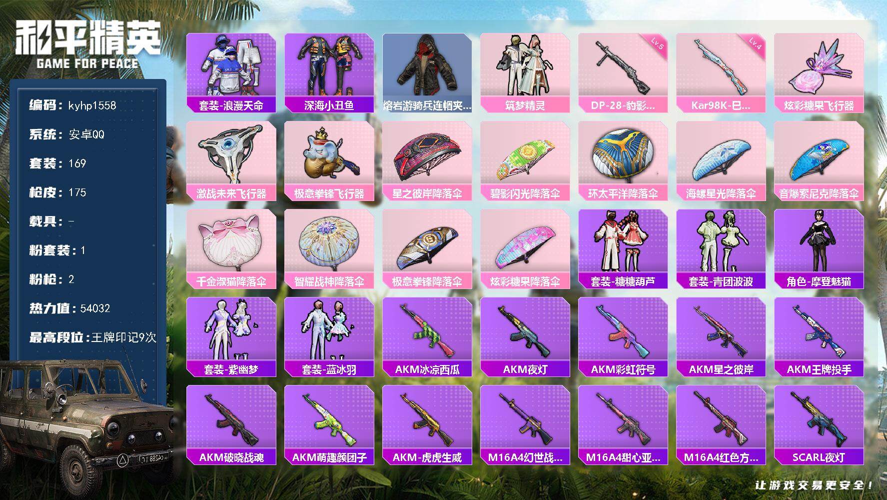 PX_2550473--1粉装-2特效枪-0载具-3粉色飞行器-54032热力值-9王牌印记-169套装-175枪皮 【热门品类】:套装-浪漫天命,套装-深海小丑鱼,熔岩游骑兵连帽夹克 【粉色套装】:粉装-筑梦精灵 【粉色枪皮等级】:Kar98K-巳巳如意(四级),DP-28-豹影疾电(五级) 【粉色枪皮】:Kar98K-巳巳如意,DP-28-豹影疾电 【粉色飞行器】:炫彩糖果飞行器,激战未来飞行器,极意
