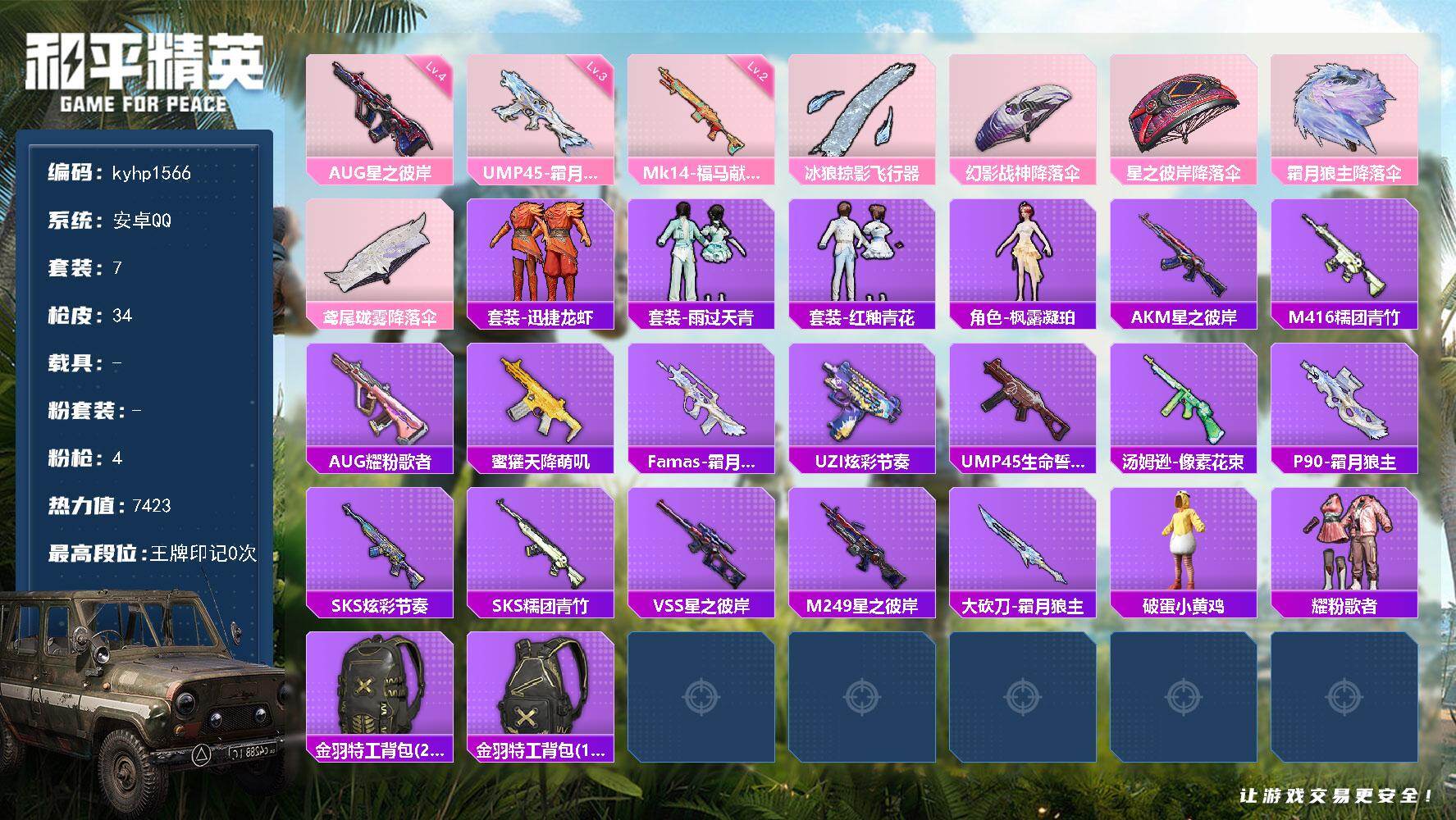 PX_2550828--0粉装-4特效枪-0载具-1粉色飞行器-7423热力值-0王牌印记-7套装-34枪皮 【粉色枪皮等级】:UMP45-霜月狼主(三级),AUG-星之彼岸(四级),Mk14-福马献瑞(二级) 【粉色枪皮】:AUG-星之彼岸,UMP45-霜月狼主,Mk14-福马献瑞,破片手榴弹-贪吃小熊 【粉色飞行器】:冰狼掠影飞行器 【粉色降落伞】:幻影战神降落伞,星之彼岸降落伞,霜月狼主降落伞,鸢尾