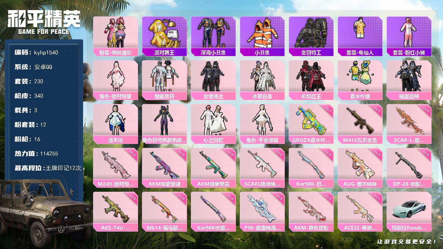 PX_2548807--12粉装-16特效枪-3载具-9粉色飞行器-114255热力值-12王牌印记-230套装-340枪皮 【热门品类】:粉装-缤纷油彩,套装-派对舞王,套装-深海小丑鱼,套装-小丑鱼,套装-金羽特工,套装-龟仙人,套装-粉红小猪 【粉色套装】:角色-绝对恒星,粉装-智能音符,粉装-缤纷油彩,粉装-古堡领主,粉装-冰霜白皇,粉装-炙焰红王,粉装-香水柠檬,粉装-暗翼战神,角色-洛天依,角
